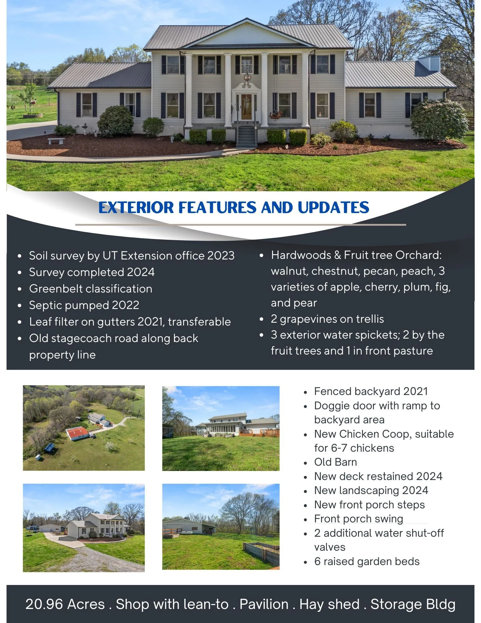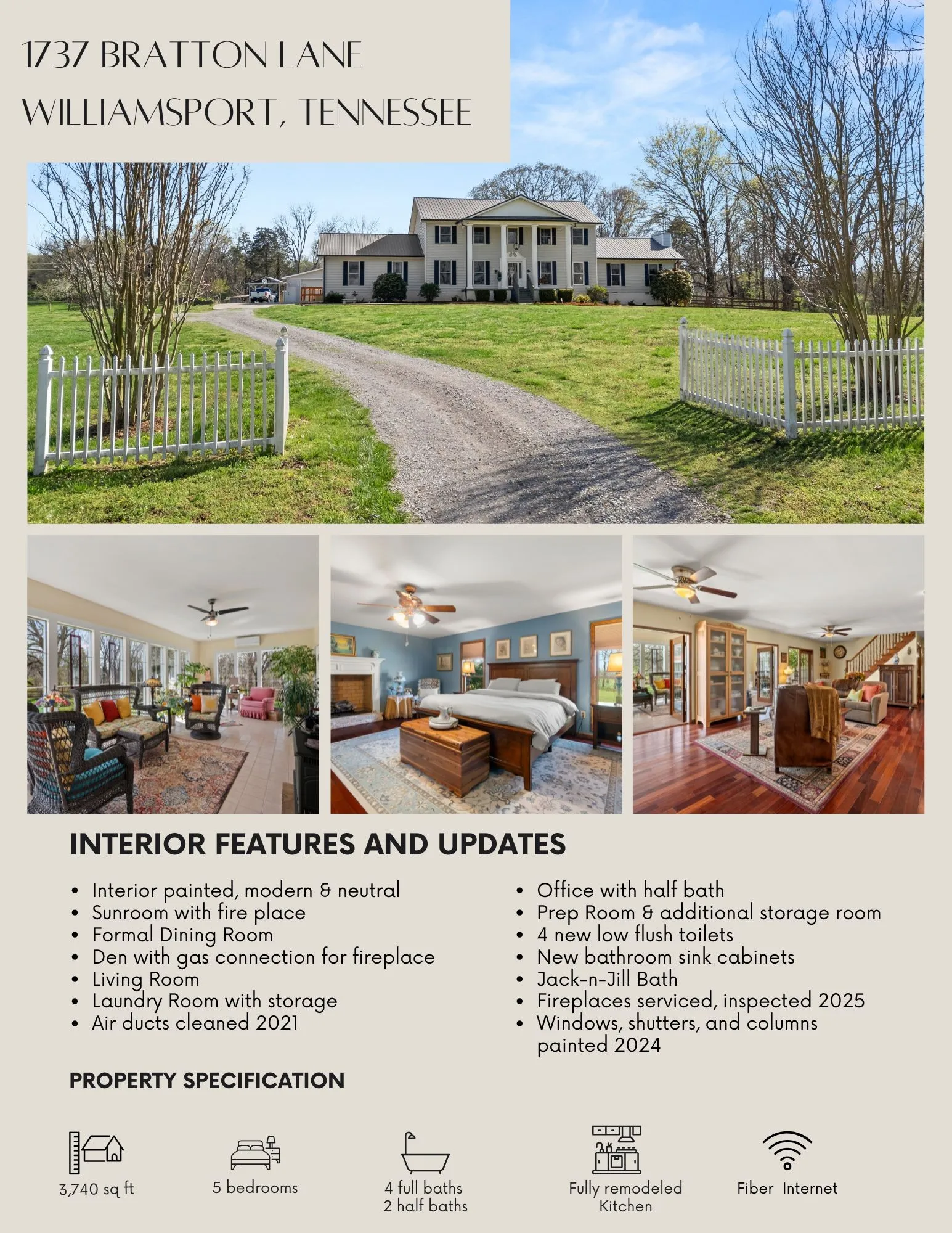 Modern meets Rural ~ have the best of both worlds with this stunning colonial in Williamsport, Tennessee * Spread out on 20.96 acres with a gorgeous home boasting 5 bedrooms, 4 full baths, and 2 half baths * Work from home with Fiber Internet and half bath in the Office * Dream Kitchen with large Island, Walk-in Pantry and so much more (see pics for extra details!) Complete remodel 2023 * Spacious rooms can accommodate large furniture * Spend your mornings and evenings in the sunroom overlooking the fenced backyard, complete with doggie door and ramp for the pups * The Den is the perfect gathering place for hosting or family time * Gas fireplace in sunroom and connection in Den * Beautiful Primary Bedroom Suite on main level with brick fireplace and 2 walk-in closets * Two upstairs bedrooms have their own ensuite baths * Jack-n-Jill bath serves 2 more upstairs bedrooms * Formal Dining Room and Formal Living Room * Separate room for deep freeze, prepping, canning, and more * Laundry room with cabinet storage * Mud room style back entry * HUGE shop with lean-to * Brand New Chicken Coop * 6 raised garden beds * Fruit tree Orchard and Grapevines on trellis * 20.96 acres of woods, pasture, and open spaces * Floorplan provided in pictures * Updates and Features in pictures too, so many updates and upgrades! Schedule an appointment for a complete viewing of this perfect slice of Tennessee Paradise!