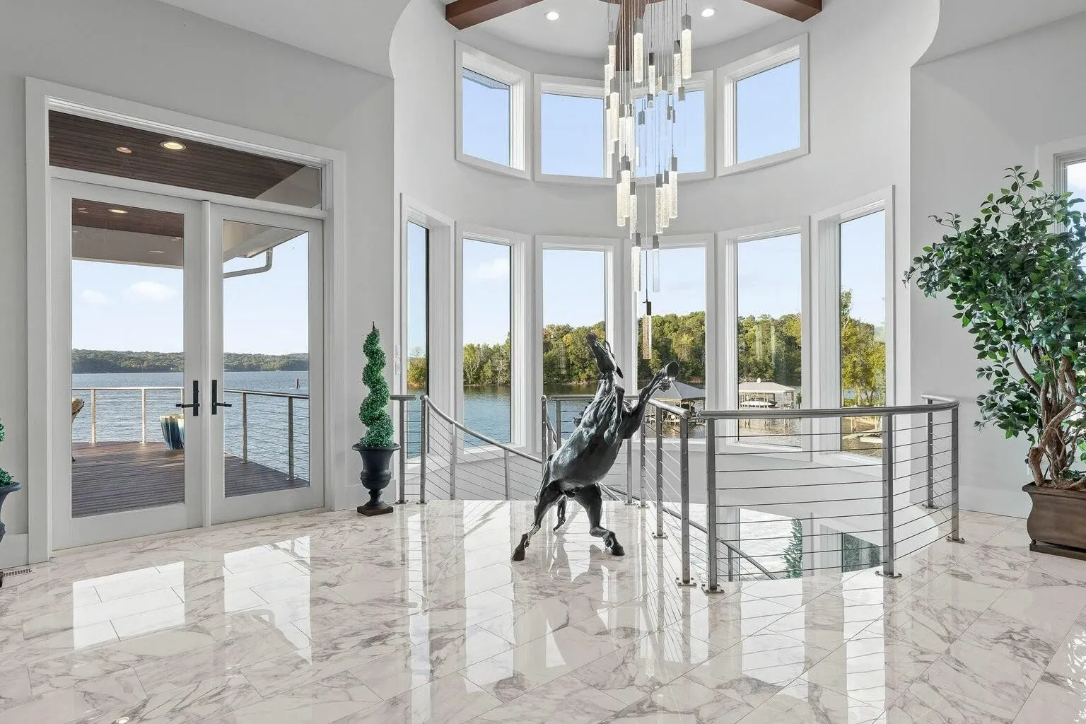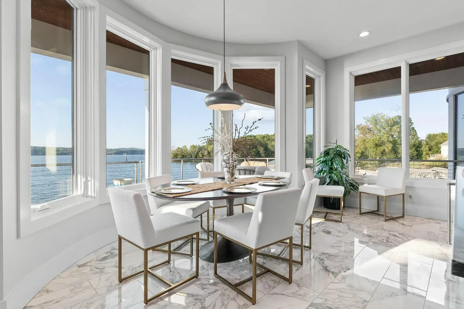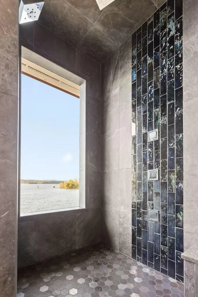 Rare opportunity to own a one-of-a-kind custom home in the gated Sailmaker Circle at Windward Cove. This 6-bedroom, 6.5-bath residence offers over 6,000 sq. ft. of luxury living with approved boat dock and expansive waterfront terraces. The main level features an open gourmet kitchen with black granite waterfall island, custom cabinetry, and premium appliances. The great room showcases panoramic lake views framed by marble floors and Calcutta marble tile. Two bedrooms are located on the main level, including a primary suite with spa-style bath featuring a sauna, steam room, copper soaking tub, heated floors, and private balcony. Upstairs, find 3 bedrooms with en-suite baths and sweeping lake views. A striking steel-and-wood spiral staircase leads to the walk-out lower level, offering a second living space with bedroom, full bath, and open design overlooking the water. The basement, offers breathtaking lake vistas, a bedroom, and a full bath. This extraordinary lakefront retreat offers the ultimate in luxury living, your very own private paradise on the water.
