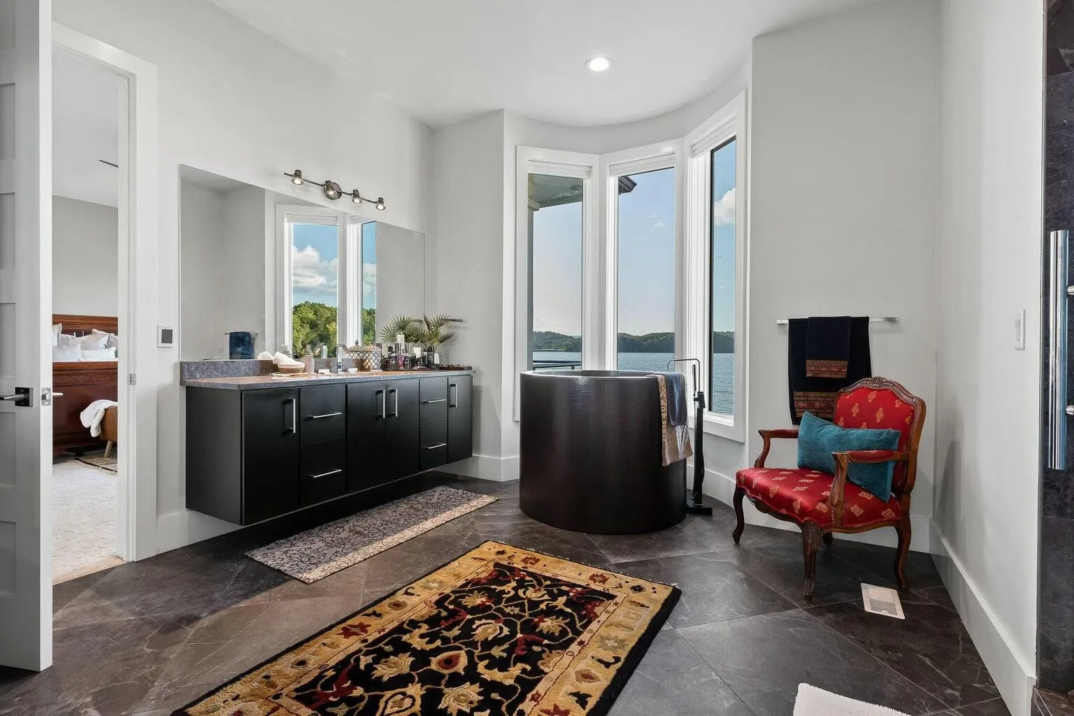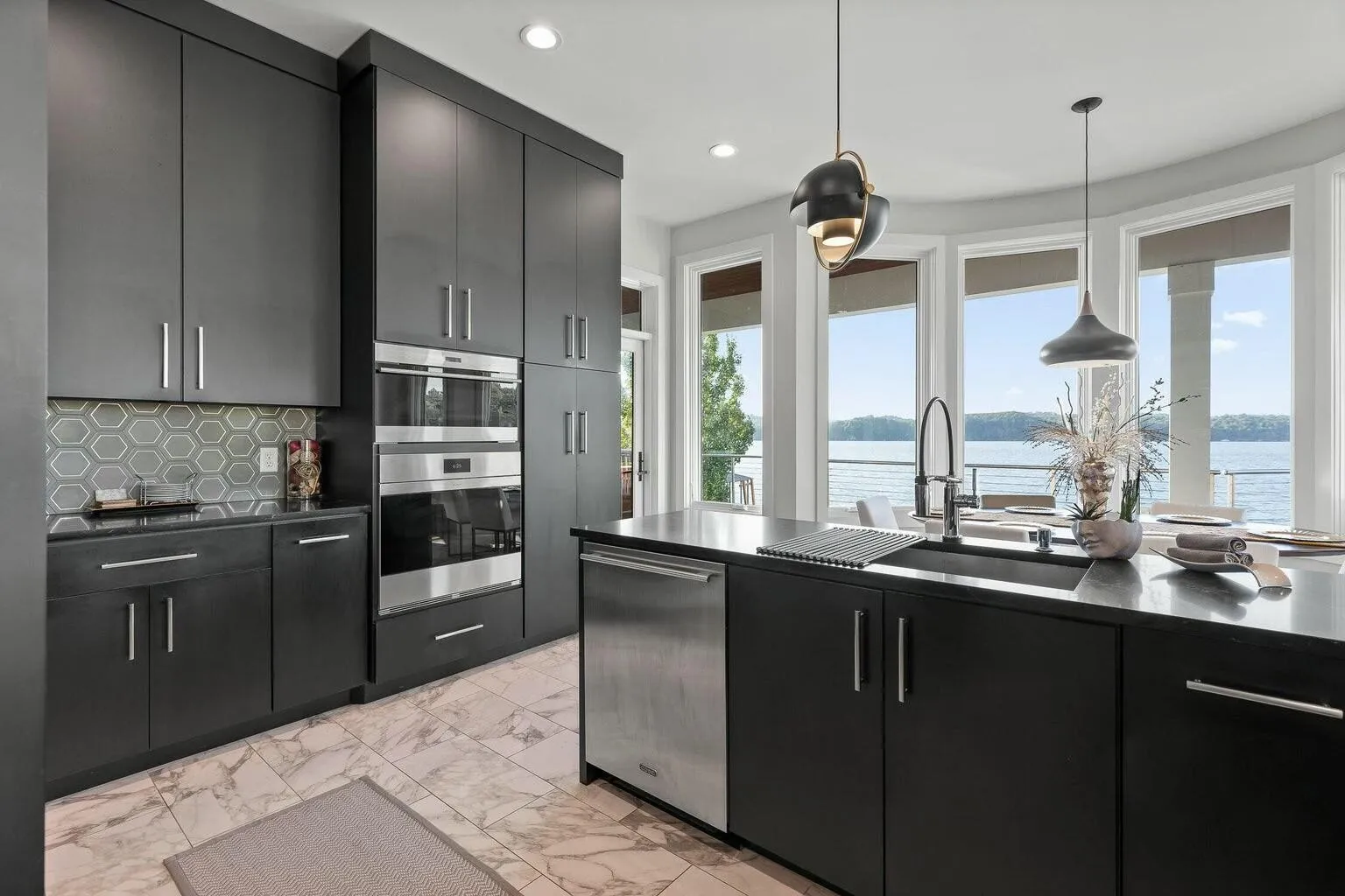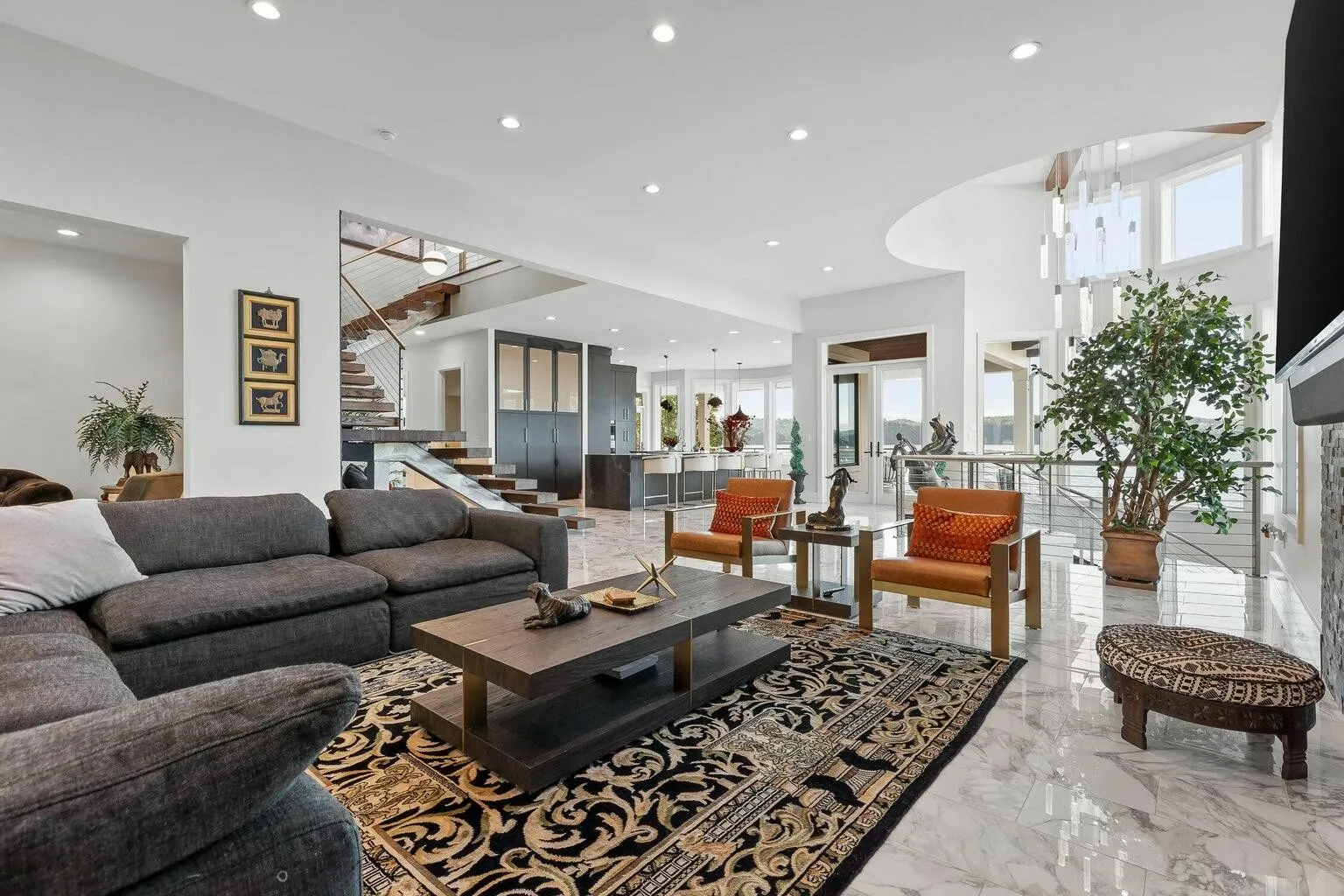 Rare opportunity to own a one-of-a-kind custom home in the gated Sailmaker Circle at Windward Cove. This 6-bedroom, 6.5-bath residence offers over 6,000 sq. ft. of luxury living with approved boat dock and expansive waterfront terraces. The main level features an open gourmet kitchen with black granite waterfall island, custom cabinetry, and premium appliances. The great room showcases panoramic lake views framed by marble floors and Calcutta marble tile. Two bedrooms are located on the main level, including a primary suite with spa-style bath featuring a sauna, steam room, copper soaking tub, heated floors, and private balcony. Upstairs, find 3 bedrooms with en-suite baths and sweeping lake views. A striking steel-and-wood spiral staircase leads to the walk-out lower level, offering a second living space with bedroom, full bath, and open design overlooking the water. The basement, offers breathtaking lake vistas, a bedroom, and a full bath. This extraordinary lakefront retreat offers the ultimate in luxury living, your very own private paradise on the water.