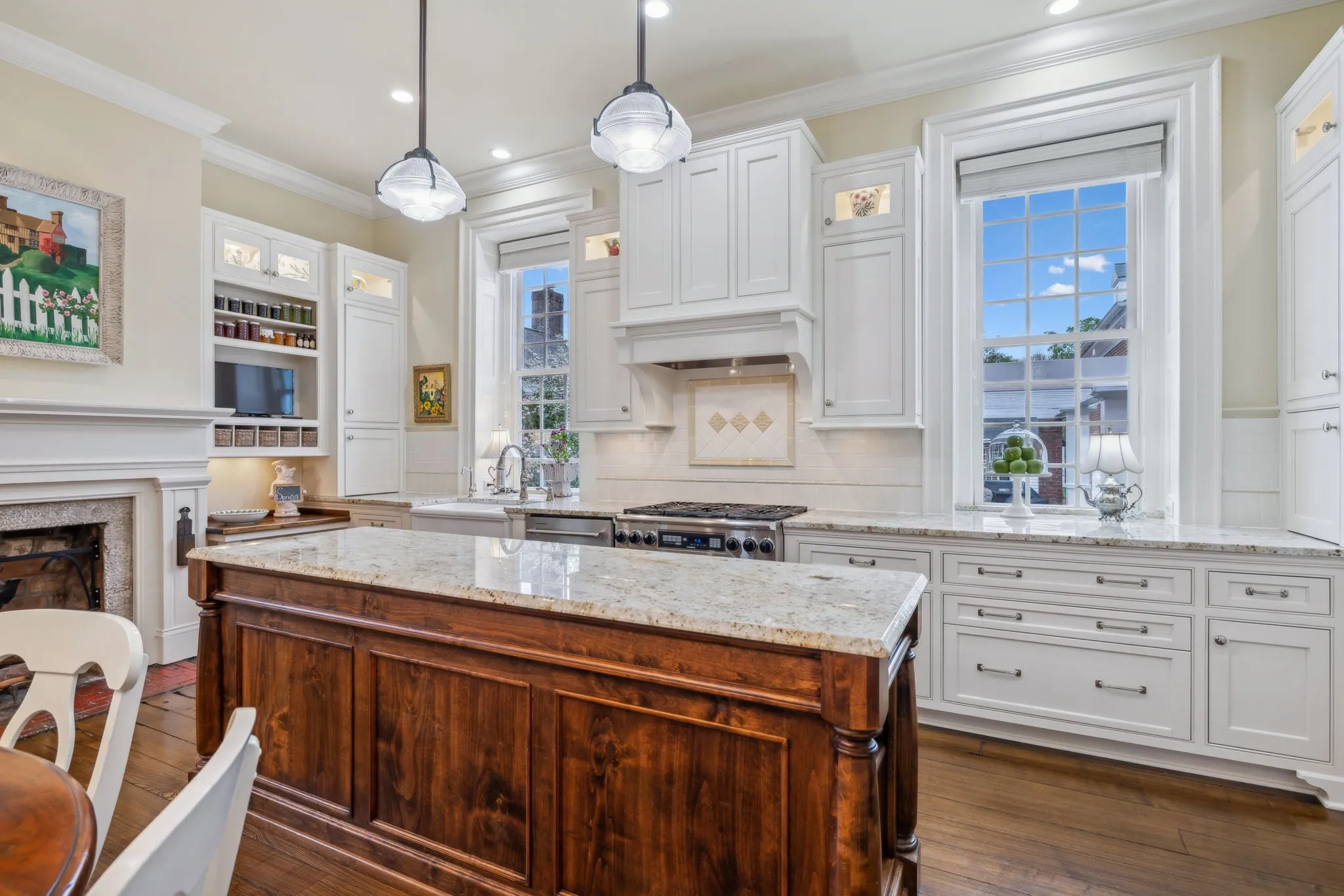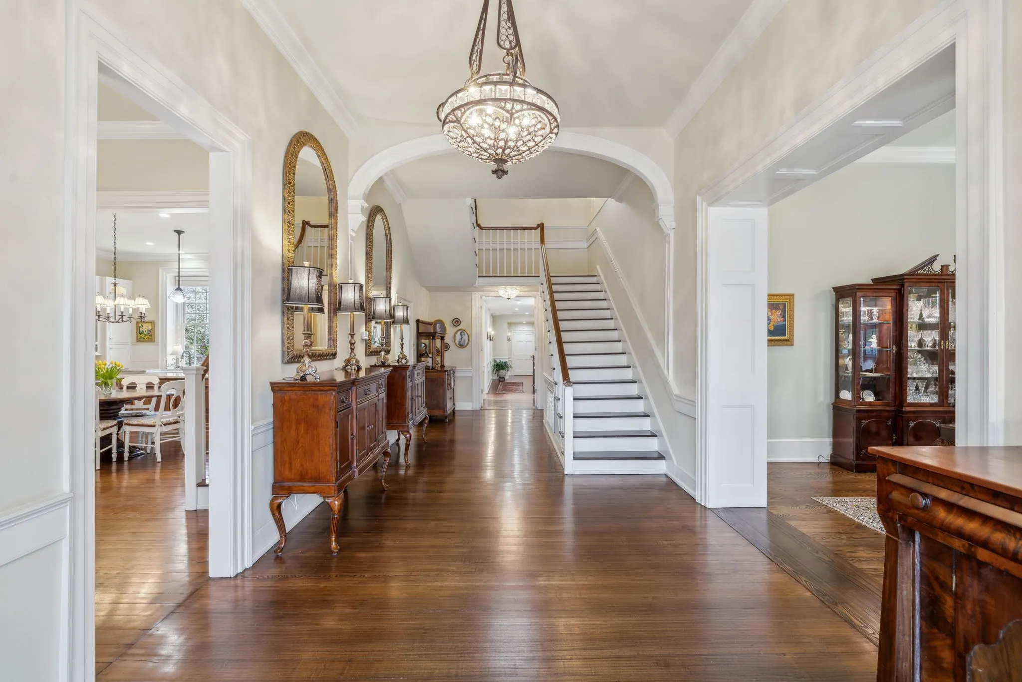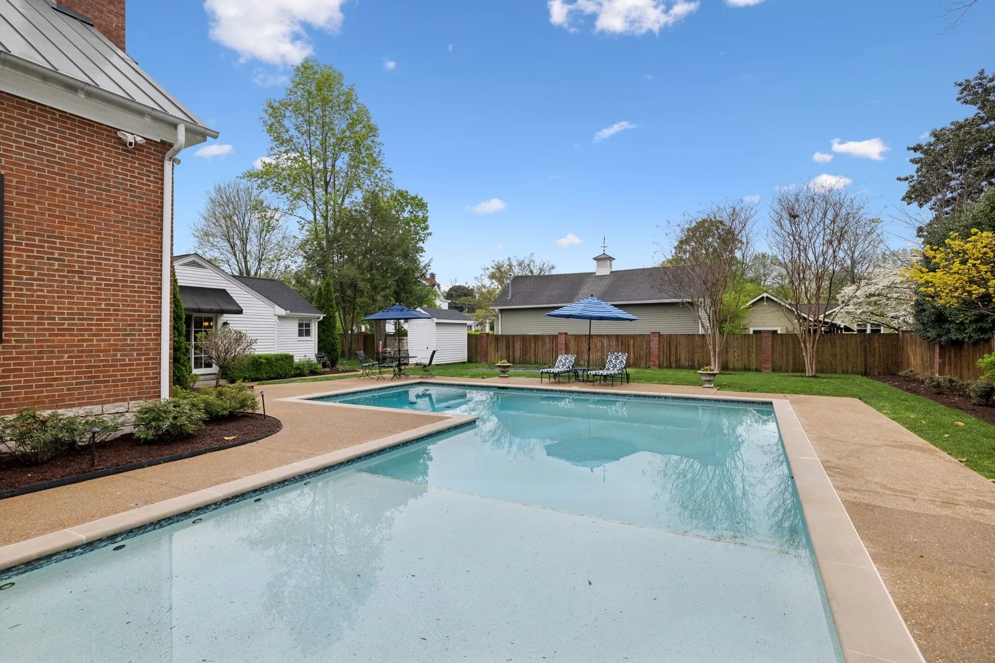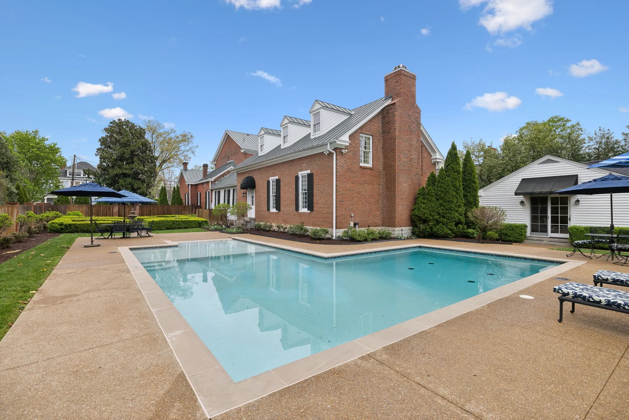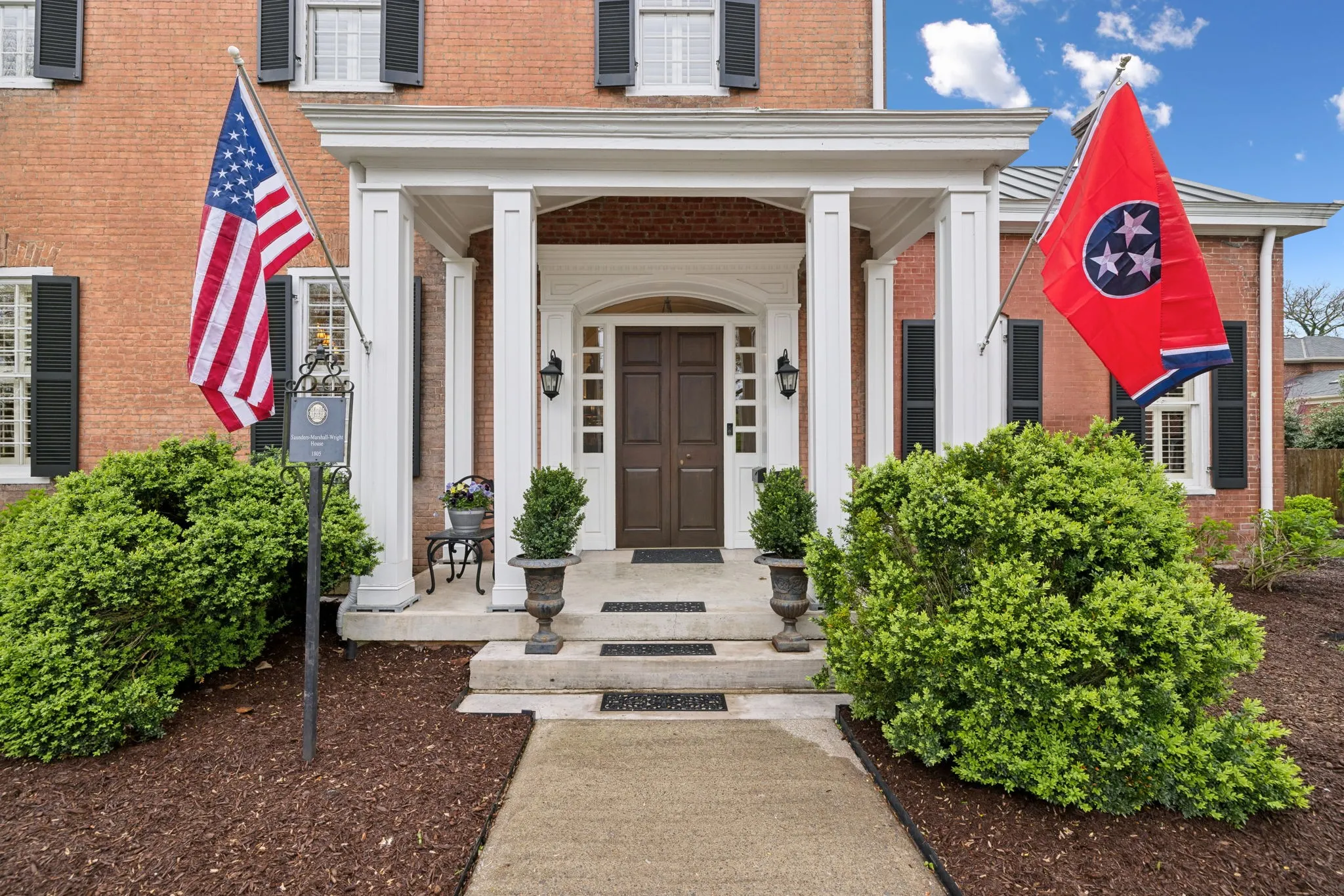 The iconic Saunders-Marshall-Wright House is the original brick home in Historic Downtown Franklin and dates to 1805. It is prominently located on prestigious 3 rd Avenue South and is only one block from the town square. This stately home was extraordinarily well constructed by master craftsmen to stand the test of time and it certainly has for the past 220 years while becoming even more beautiful and refined. The Federal-style home opens to a stunning foyer featuring 12 ft. soaring ceilings and an elegant handcrafted stair case with original poplar steps and oak railing. Original 1” thick tongue-in-groove ash floors grace the interior which was fully renovated by Tallman Enterprises and includes; Primary-on-the-main with luxurious ensuite featuring a heated Carrera marble floor, bidet, large air jet soaking tub, spacious walk-in marble shower with heated towel bar, custom walnut vanity and cabinets, and custom designed walk-in closet. The open and naturally lit Chef’s kitchen features custom cabinetry, subzero refrigerator, Dacor six burner gas range, warming drawer, and new wall oven and dishwasher. The home also features a spacious 28×21’ den with an impressive stone wood-burning fireplace (2016), an attached 2.5 car garage includes additional storage and private driveway (replaced 2025), separate fully renovated (2021) walk-in guest house with complete kitchen and attached garage. A beach-entry L-shaped swimming pool (2013) compliments beautifully landscaped front, side and backyards which include fountains and a charming traditional English garden. The home has seven fireplaces and is handicap-accessible. GUEST HOUSE NOT INCLUDED IN SQUARE FOOTAGE.