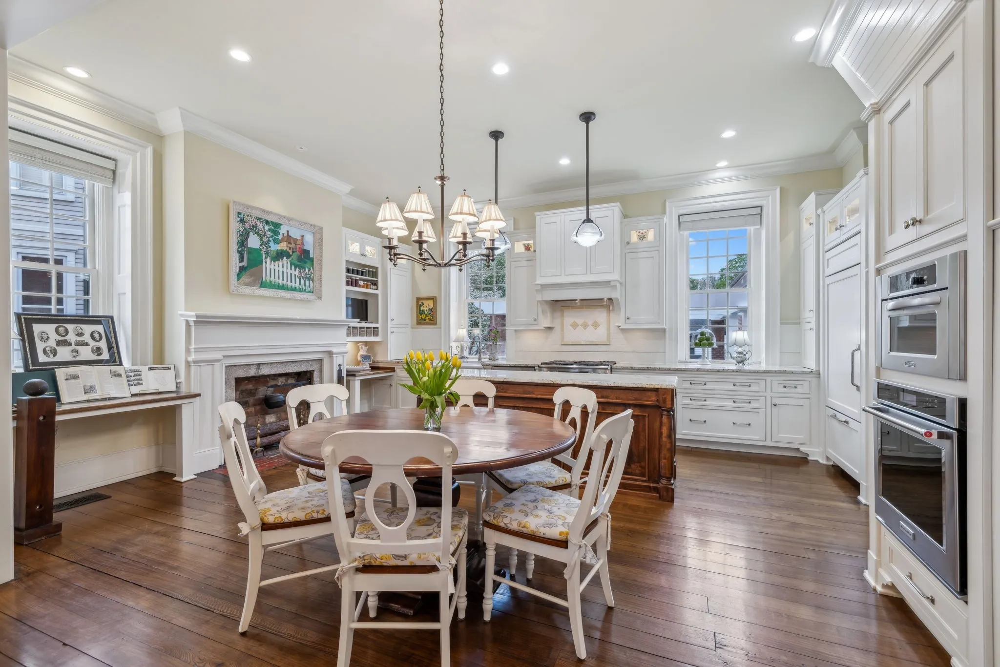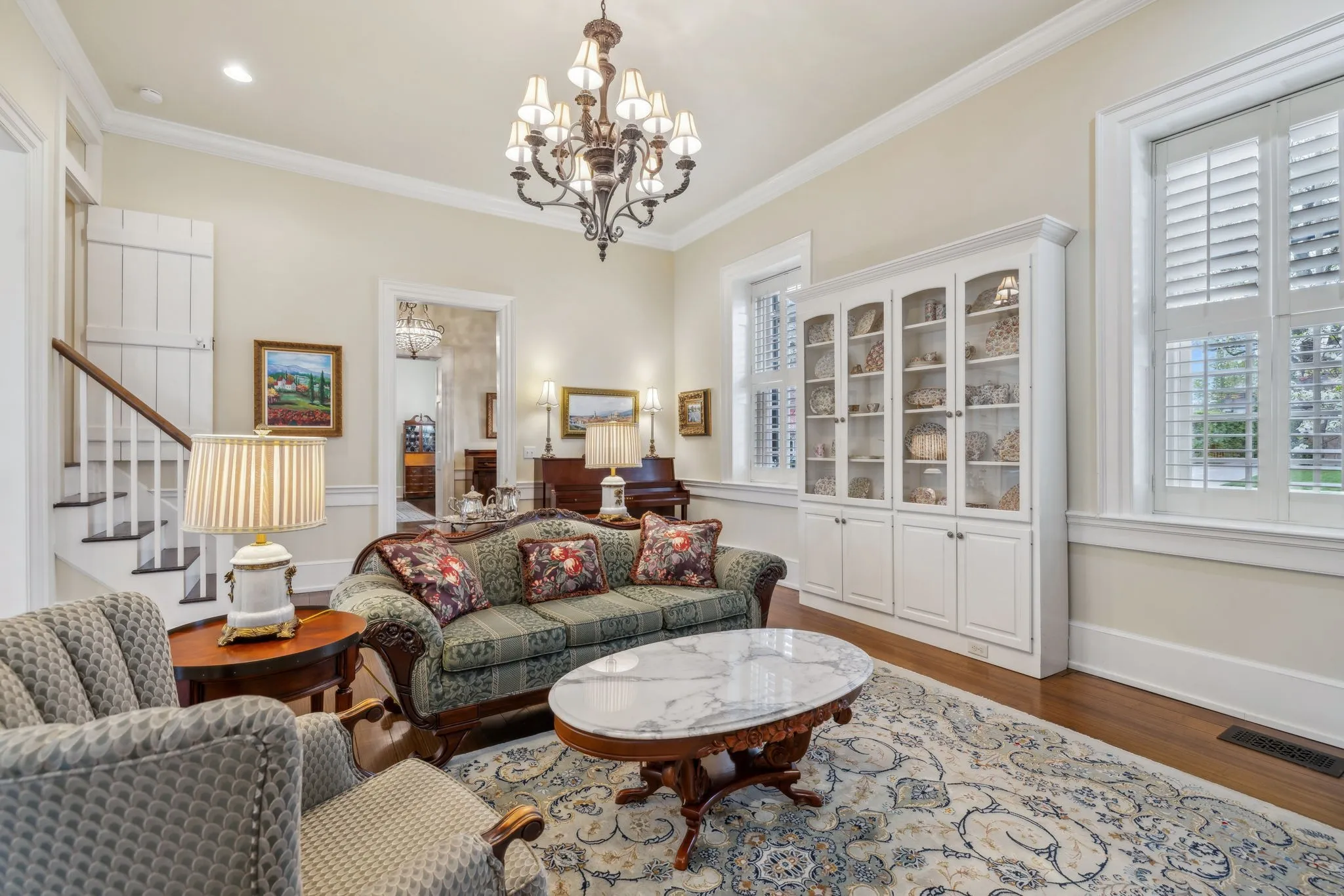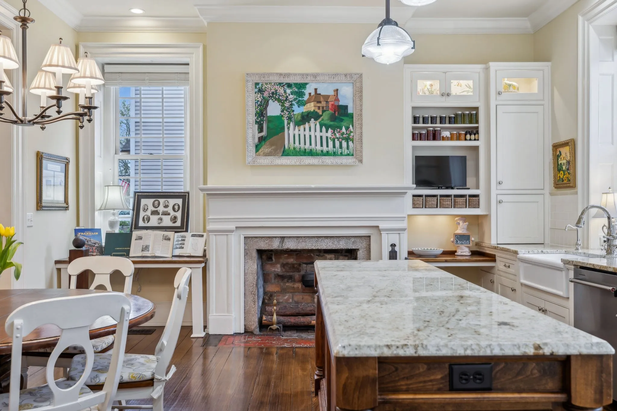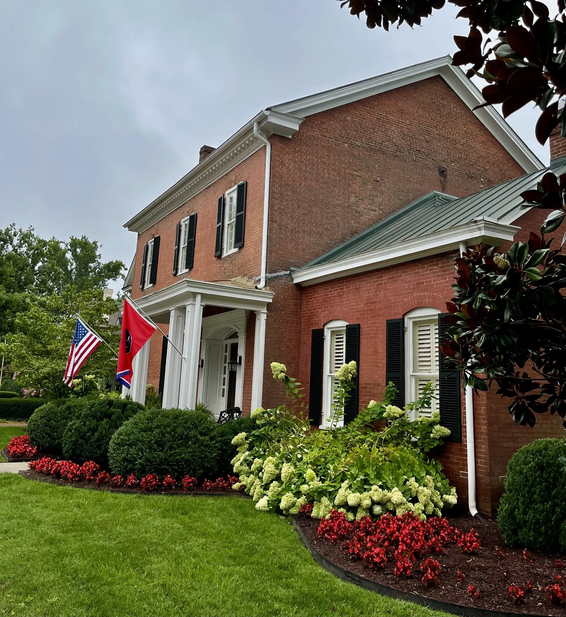 The iconic Saunders-Marshall-Wright House is the original brick home in Historic Downtown Franklin and dates to 1805. It is prominently located on prestigious 3 rd Avenue South and is only one block from the town square. This stately home was extraordinarily well constructed by master craftsmen to stand the test of time and it certainly has for the past 220 years while becoming even more beautiful and refined. The Federal-style home opens to a stunning foyer featuring 12 ft. soaring ceilings and an elegant handcrafted stair case with original poplar steps and oak railing. Original 1” thick tongue-in-groove ash floors grace the interior which was fully renovated by Tallman Enterprises and includes; Primary-on-the-main with luxurious ensuite featuring a heated Carrera marble floor, bidet, large air jet soaking tub, spacious walk-in marble shower with heated towel bar, custom walnut vanity and cabinets, and custom designed walk-in closet. The open and naturally lit Chef’s kitchen features custom cabinetry, subzero refrigerator, Dacor six burner gas range, warming drawer, and new wall oven and dishwasher. The home also features a spacious 28×21’ den with an impressive stone wood-burning fireplace (2016), an attached 2.5 car garage includes additional storage and private driveway (replaced 2025), separate fully renovated (2021) walk-in guest house with complete kitchen and attached garage. A beach-entry L-shaped swimming pool (2013) compliments beautifully landscaped front, side and backyards which include fountains and a charming traditional English garden. The home has seven fireplaces and is handicap-accessible. GUEST HOUSE NOT INCLUDED IN SQUARE FOOTAGE.