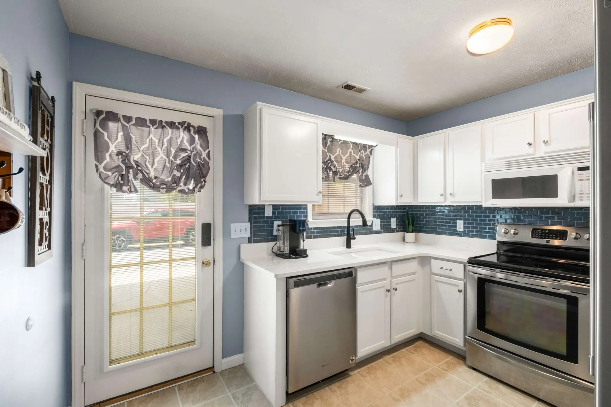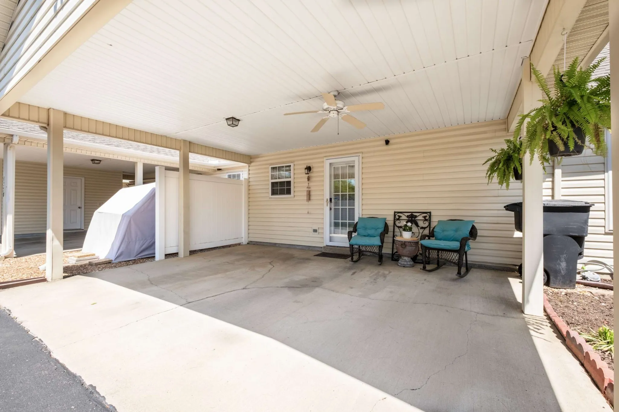 Welcome to easy living in the highly desirable Carriage Parke community! This beautifully updated, one-level first-floor condo offers modern style, comfort, and convenience all in one perfect package. Love the look? All the furniture is negotiable, making move-in a breeze! Step inside to an open-concept layout that’s both spacious and inviting, ideal for entertaining or simply relaxing at home. The living room features a cozy electric fireplace and flows seamlessly into the dining room, and the remodeled kitchen, complete with white cabinetry, sleek quartz countertops, and a stylish matching backsplash. All kitchen appliances included! Retreat to the large primary suite, boasting a private bath with a tiled walk-in shower, quartz double vanity, and a large walk-in closet. A generously sized second bedroom and an additional full bath provide plenty of room for guests or a home office setup. Need storage? You’ll find it here, with a walk-in utility room with built-in shelving and a huge upstairs storage area that’s easily accessible by stairs. Outside, the attached carport offers covered parking for two vehicles and doubles as a shaded hangout space, complete with a ceiling fan- perfect for enjoying your morning coffee or unwinding in the evening. The most recent upgrades include new light fixtures, fresh paint, and an updated second bath. The Carriage Parke community features a sparkling pool, clubhouse, and ample guest parking. Plus, the HOA handles exterior maintenance and exterior insurance. This community allows renting, giving you potential rental income. Add the negotiable furnishings and you’ll have an instant rental property! Don’t miss this amazing opportunity to own a move-in-ready condo in a fantastic community!