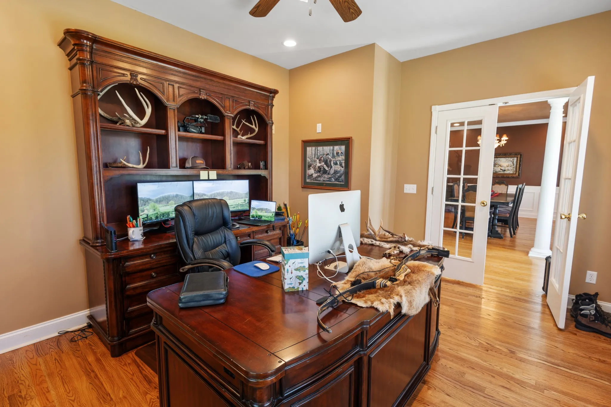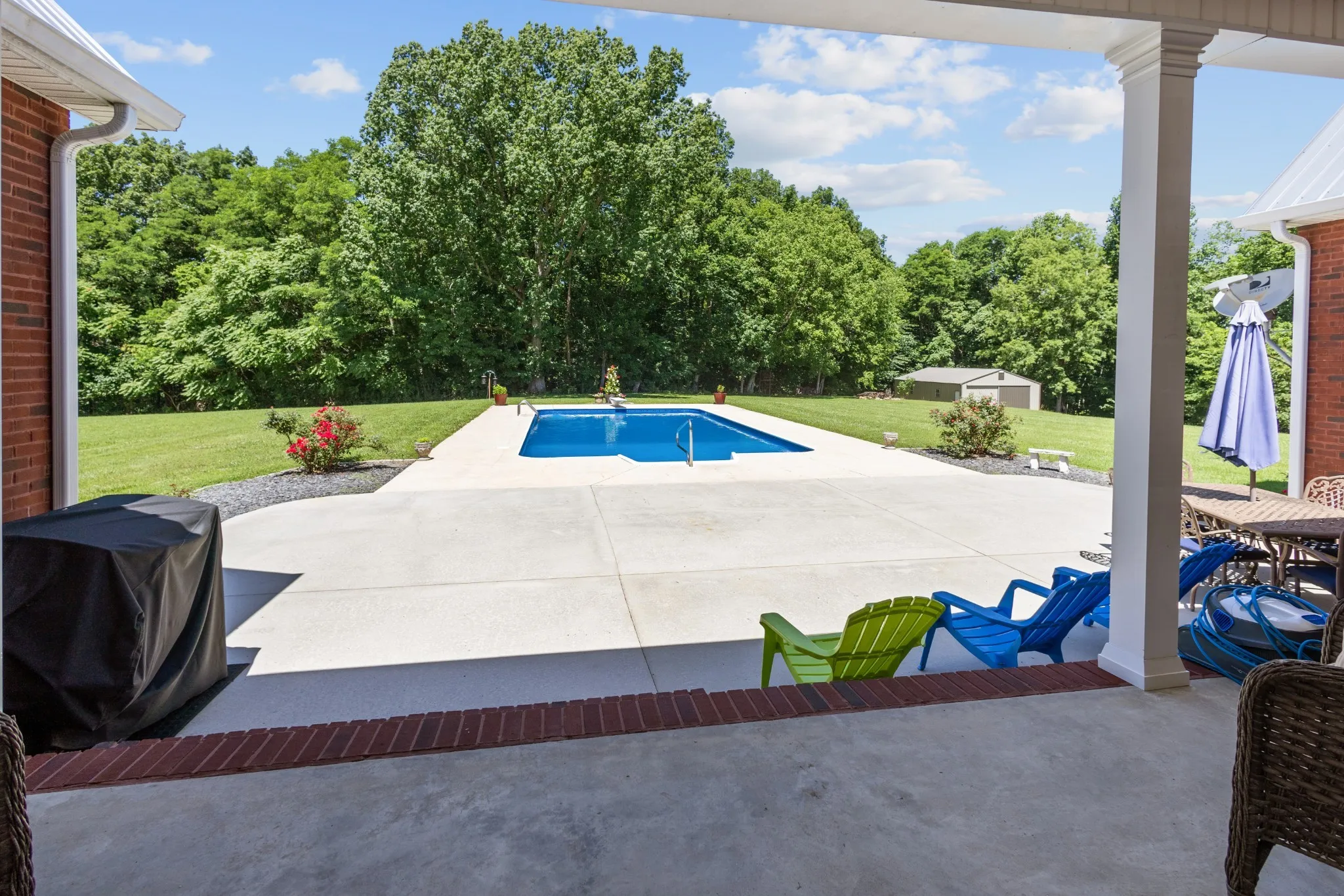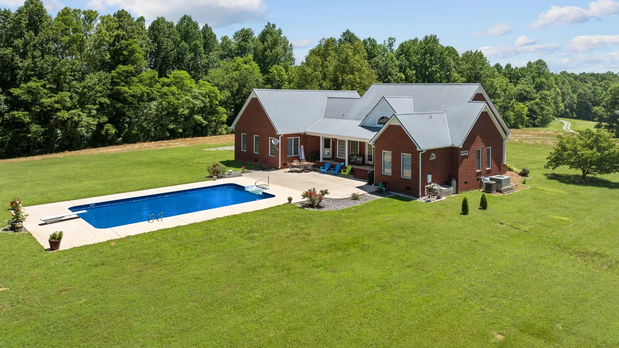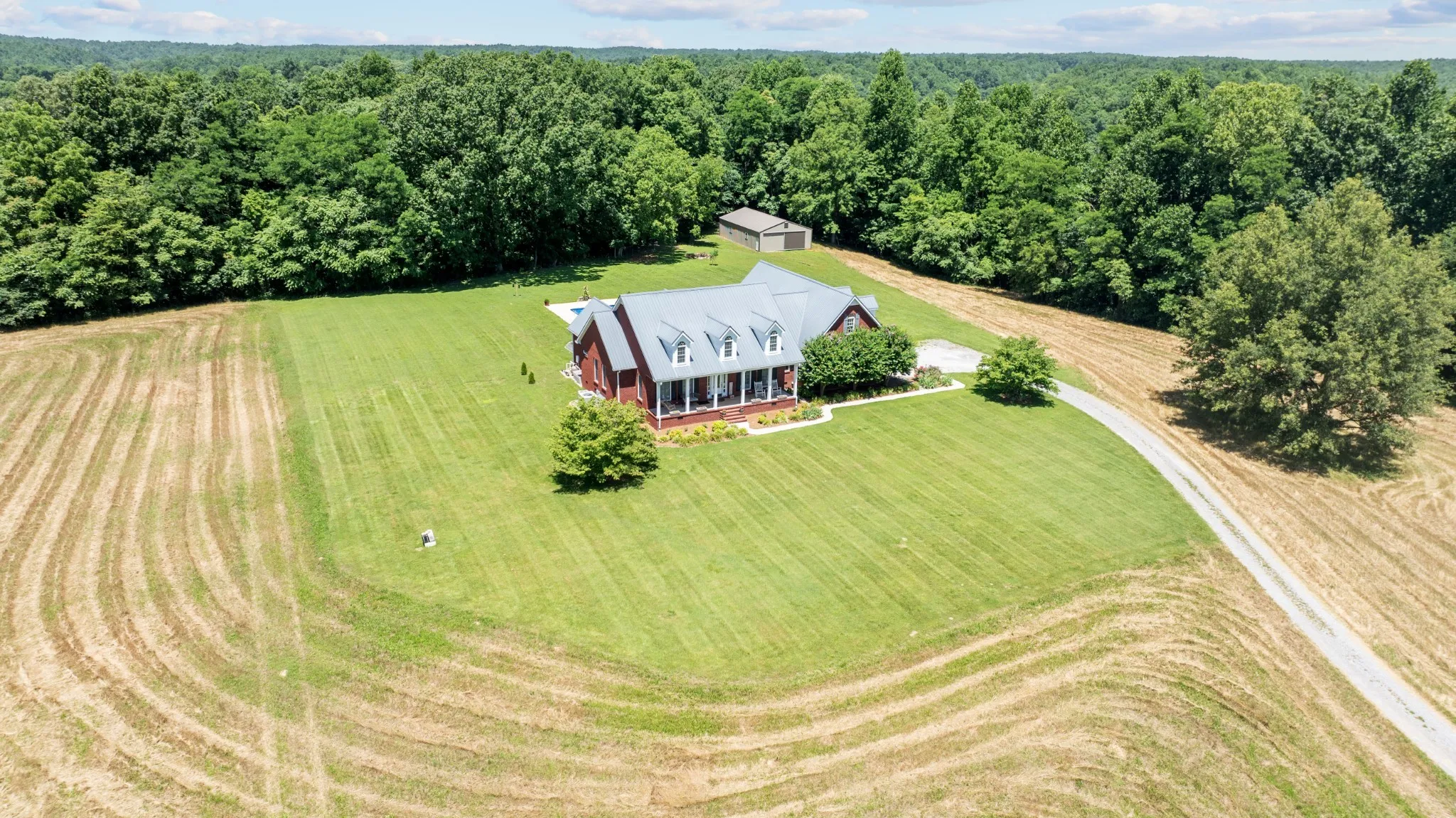 Outside, enjoy a spacious concrete patio perfect for entertaining, a saltwater pool for summer relaxation, and a 30×50 metal building ideal for hobbies, storage, or workshop use. A two-car garage adds convenience, while the surrounding acreage—featuring open pastures and mature hardwoods—invites exploration, recreation, or expansion.