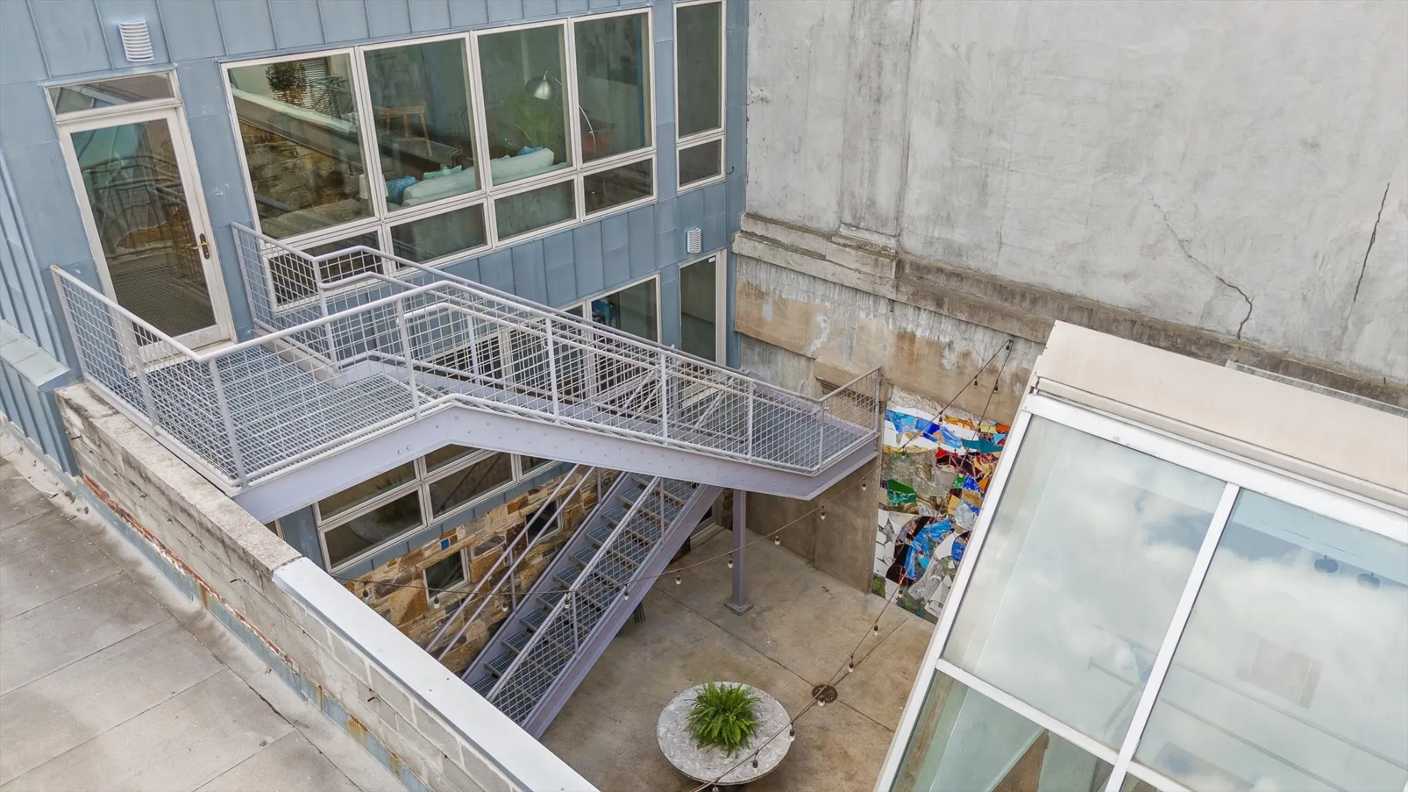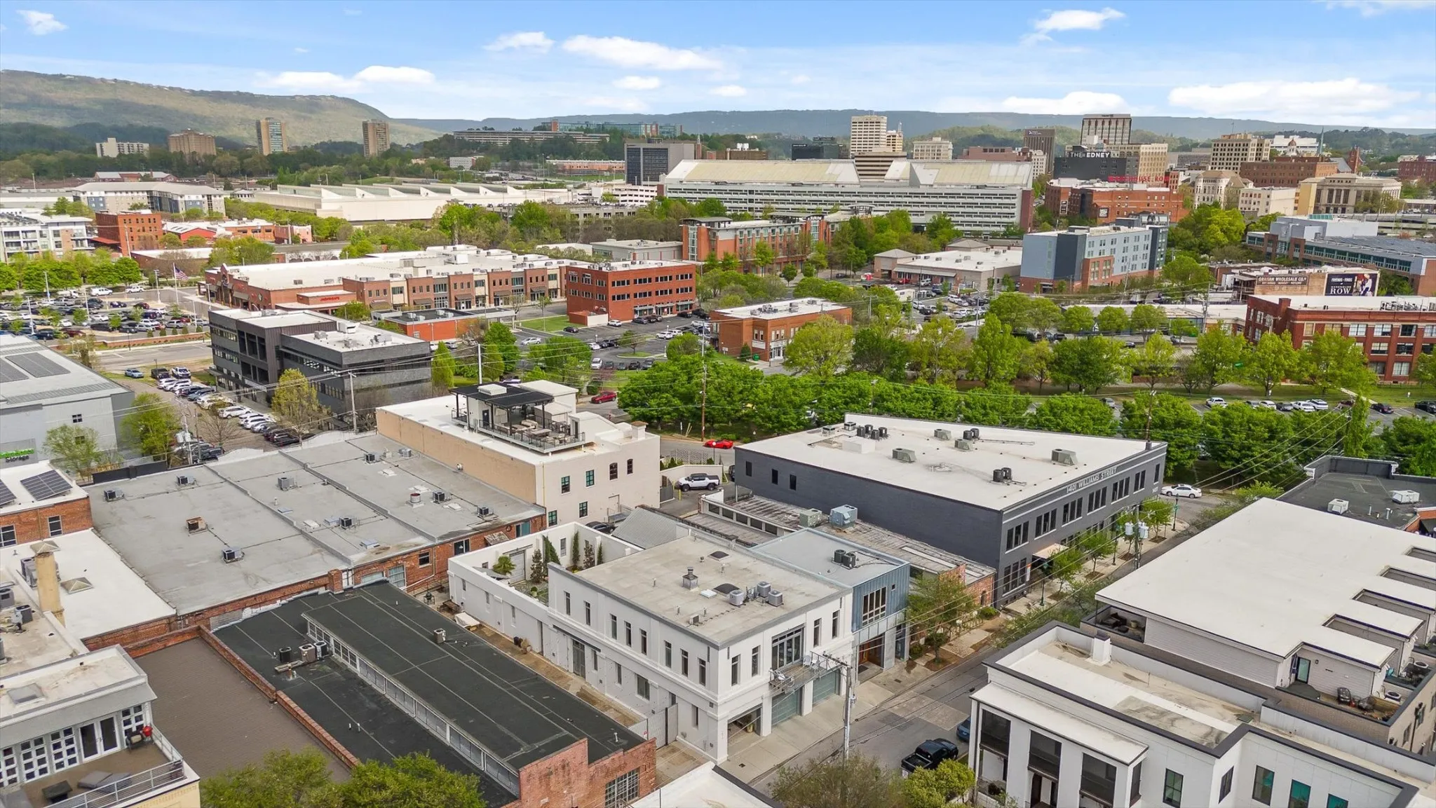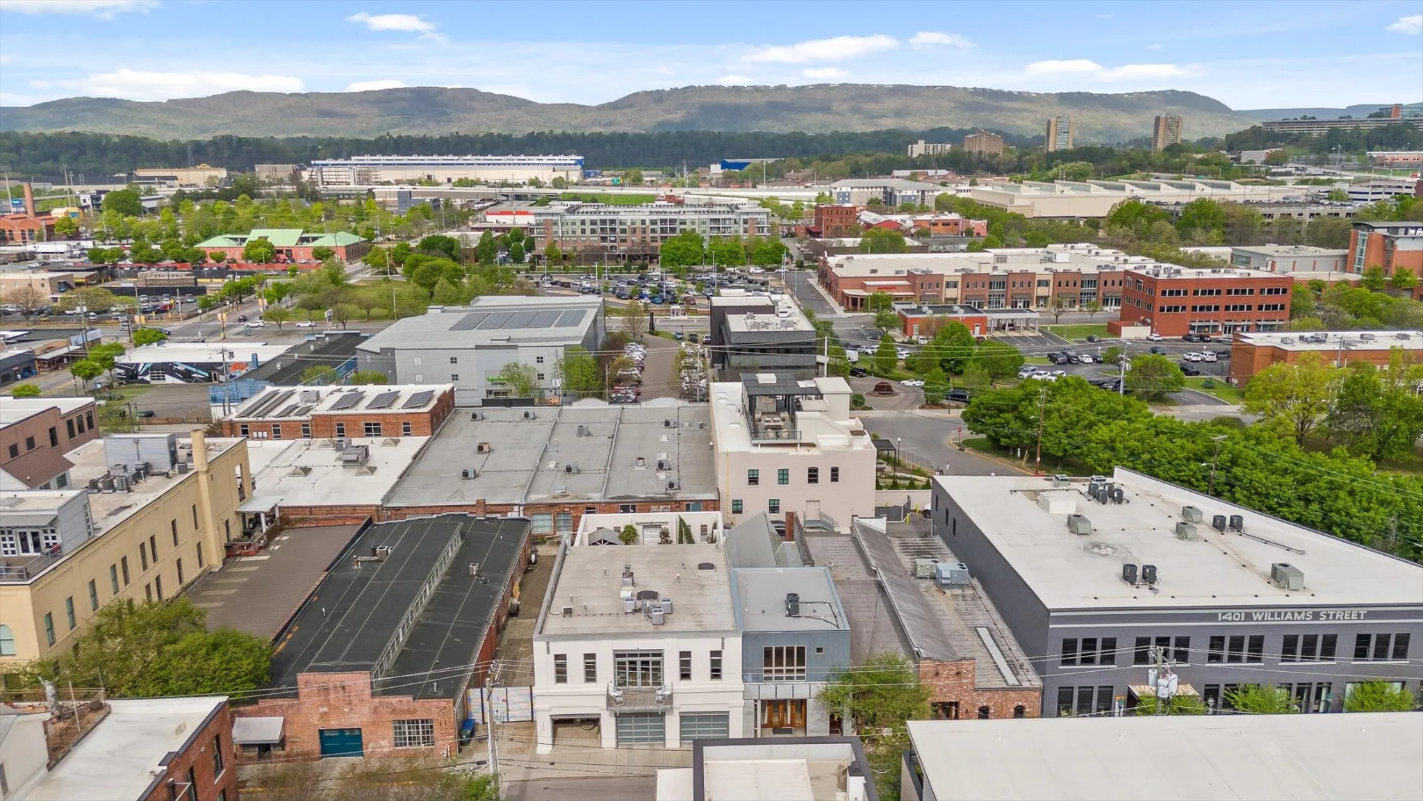 Do Not Miss this Architectural Masterpiece in the Heart of Southside. One of the first mixed-use spaces to be built during the revitalization of Southside – 1405 Williams is a true cornerstone of the neighborhood. Designed by Hefferlin + Kronenberg Architects, this building was built for artists to serve as their commercial gallery, working studio and residence. In 2005, the property won an AIA Architecture Excellence Award as an outstanding example of mixed-use space. The combination of residential, commercial and creative space offers multiple options for the next owner to establish their own footprint in Chattanooga’s beloved Southside district. Facing Williams Street, the three-story facade has an industrial feel with a limestone and zinc exterior and a dramatic series of 10-foot doors opening into the vaulted gallery. The second level is a great room with a wall of windows and full bath. The residence is on the top floor and has an open living space with floor-to-ceiling windows highlighting the mountains. An intimate, European-inspired courtyard connects the front building with the rear studio. This courtyard features beautiful stonework as well as a mosaic mural covering the entire south wall. These mosaics, and others interspersed throughout the property, are originals created by the owners. This central space is perfect for quiet reflection or big parties (but the adjoining catering kitchen encourages entertaining)
