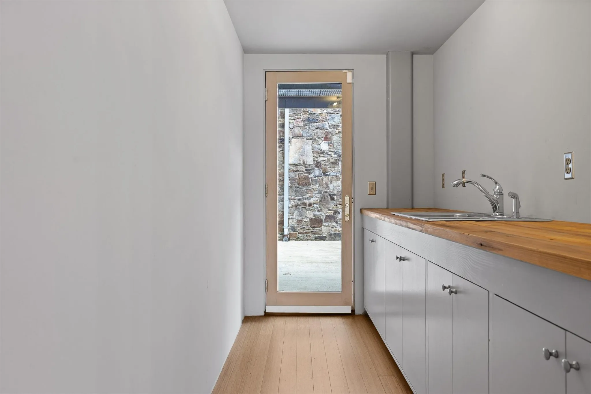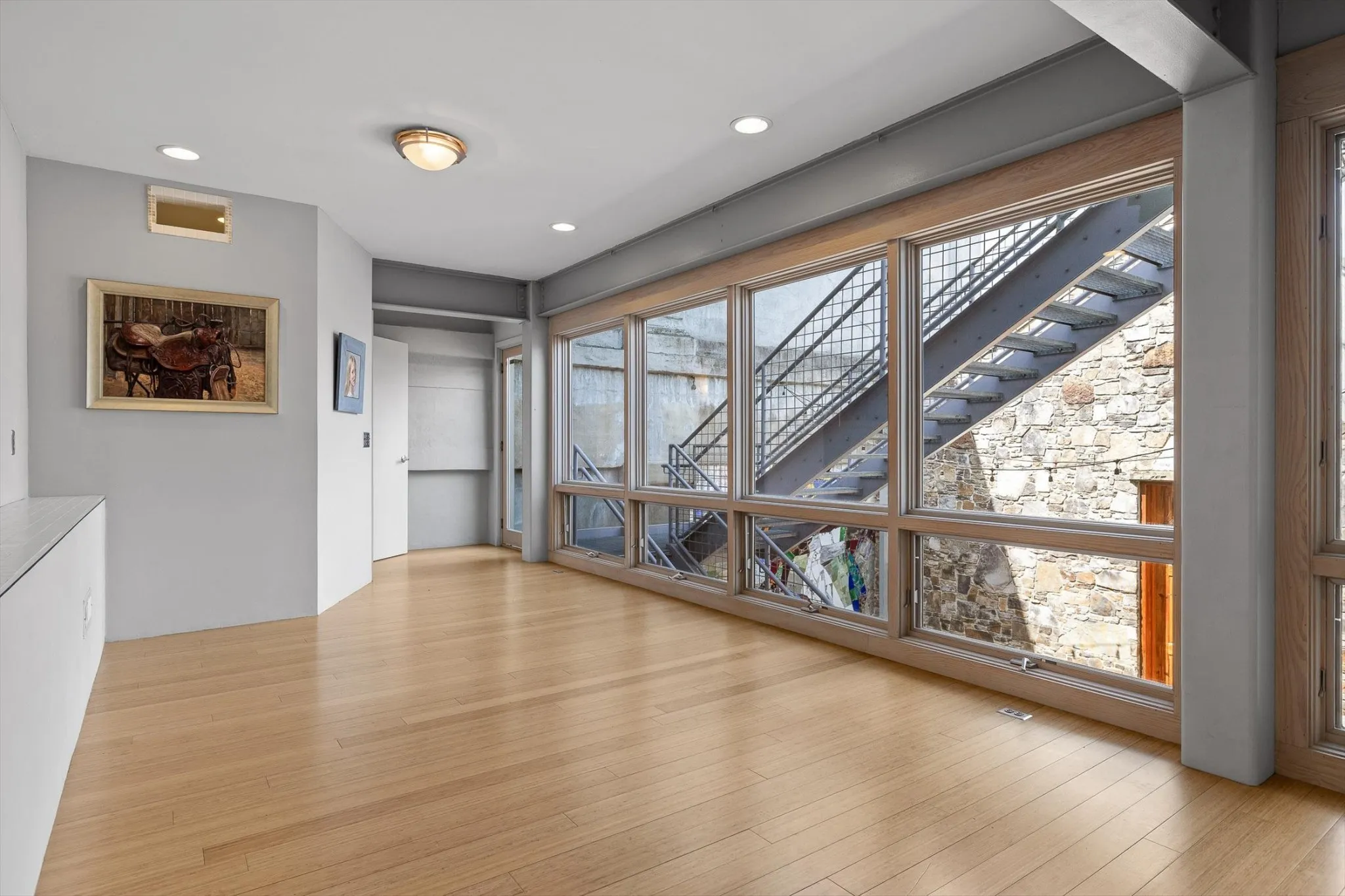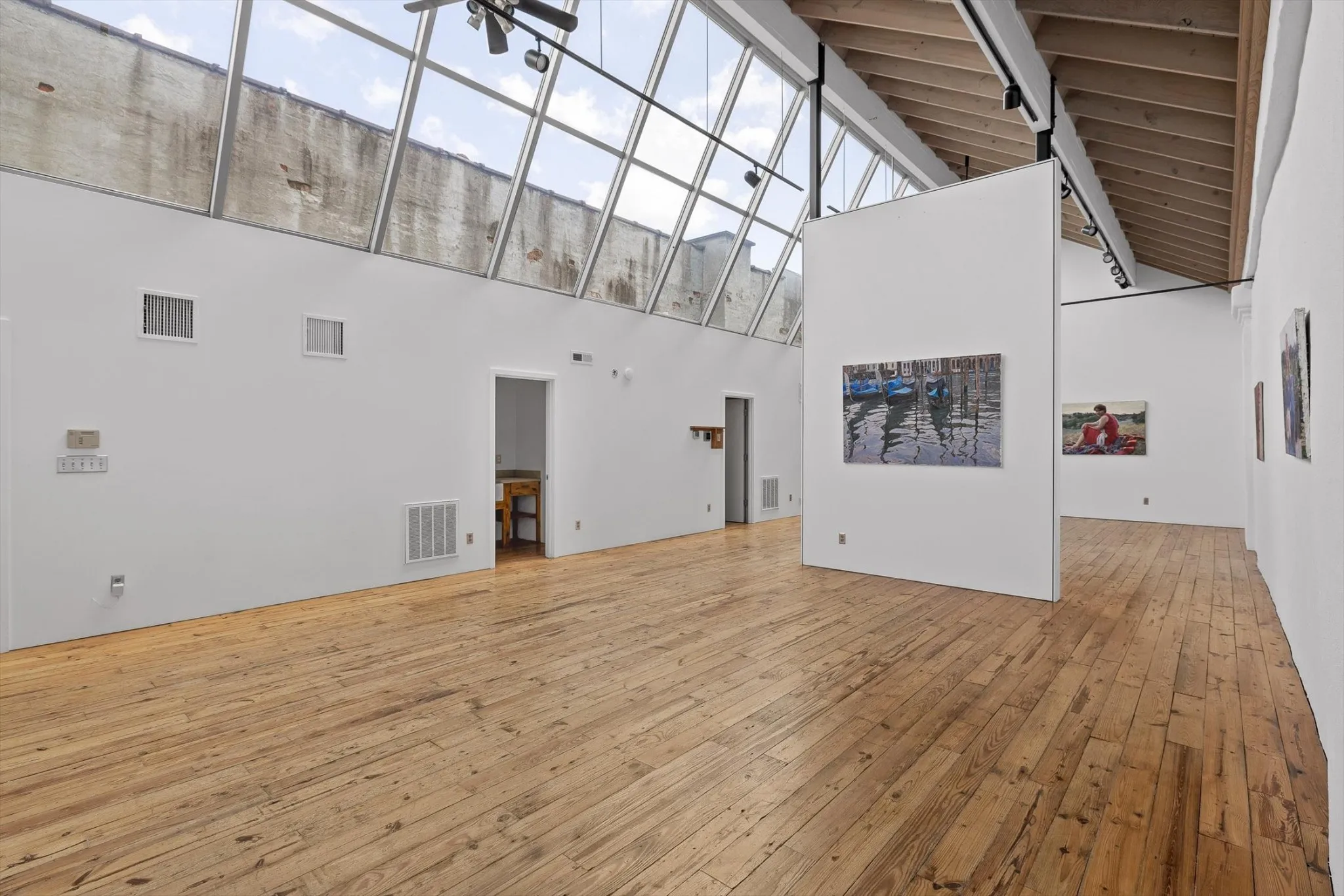 The rear building, a large rectangular studio bathed in light, was inspired by the artist Constantin Brancusi’s Parisian studio. This magical, creative space is constructed with locally-quarried stones, salvaged pine floors, 10-foot heart pine doors, and most strikingly, rows of angular, north-facing windows. An abundance of thought, talent & love has been poured into this property. This is an excellent opportunity to create your own venture and dreams in the Southside district. Parking for 2 cars is located behind the studio.