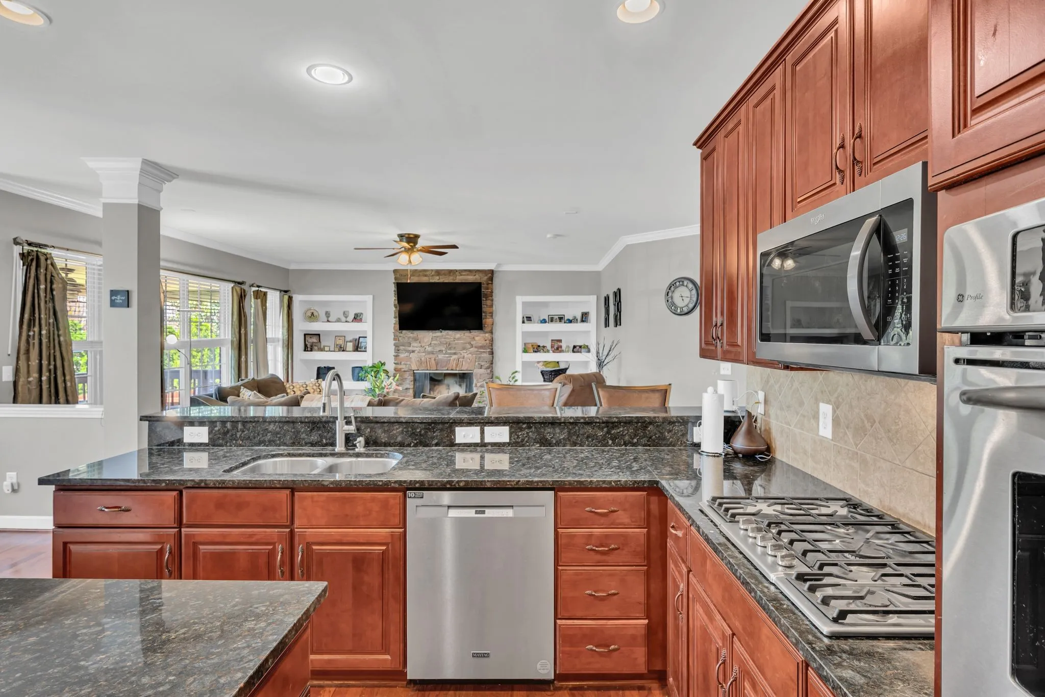 Set on a beautifully landscaped lot with a sweeping front yard, this charming home greets you with a wide, welcoming front porch and inviting entry hall. The main level features a spacious living room, formal dining room, and a cozy den with a fireplace and built-ins—all seamlessly connected to the open kitchen and breakfast area. Enjoy easy indoor-outdoor living with a covered back porch overlooking the fenced backyard and convenient alley access to the 2-car garage.
