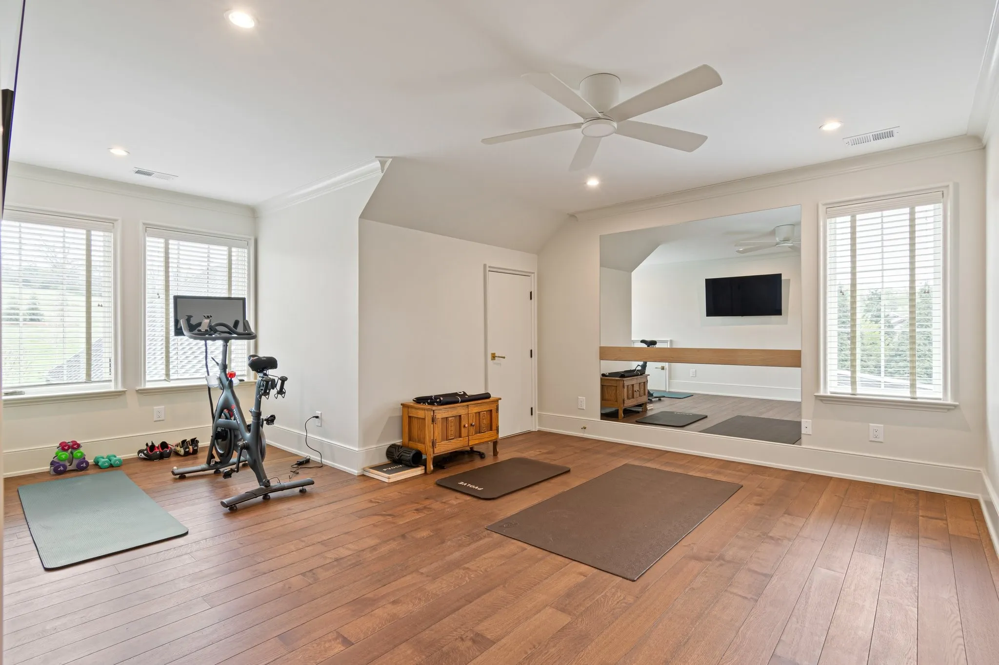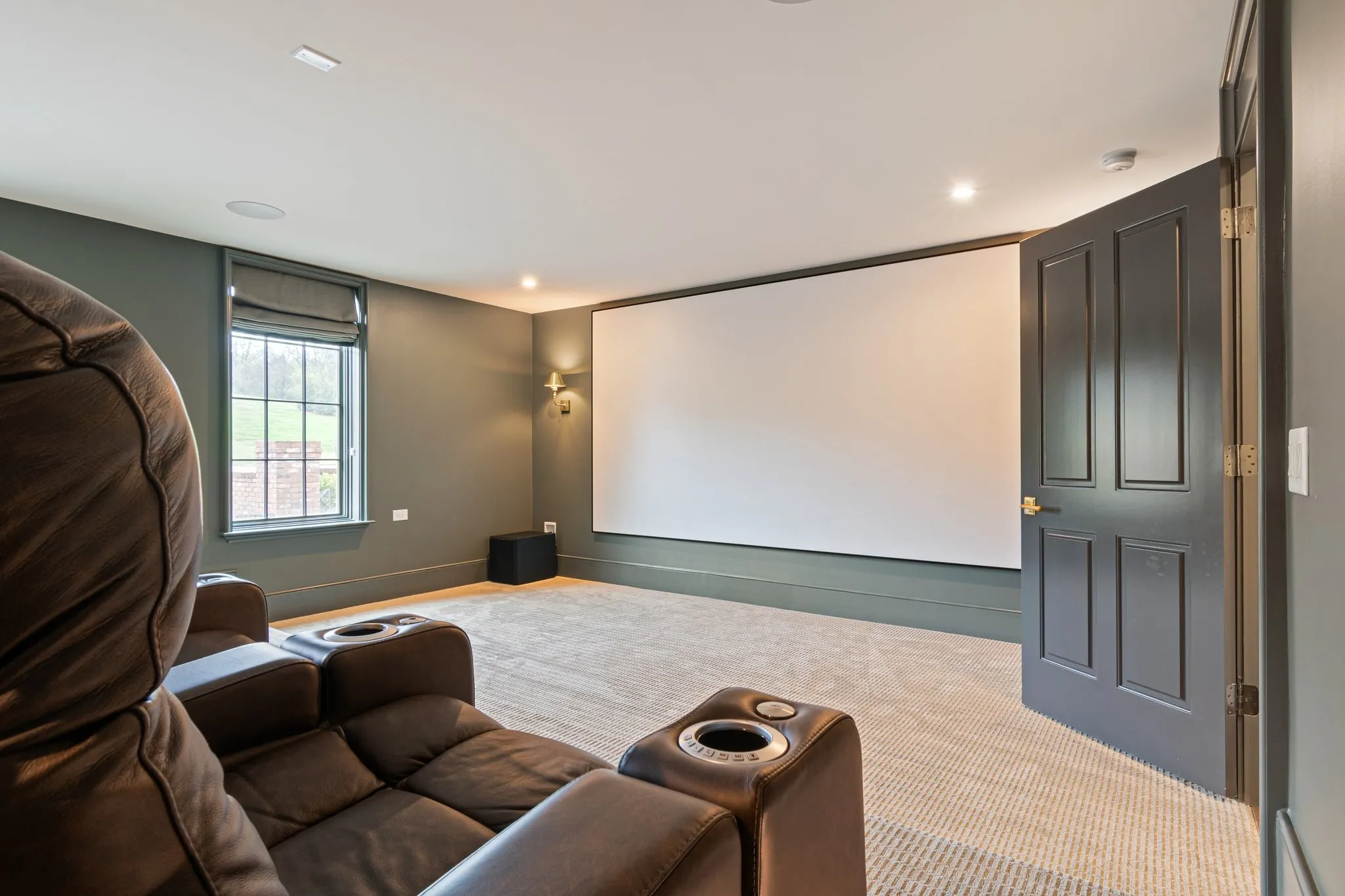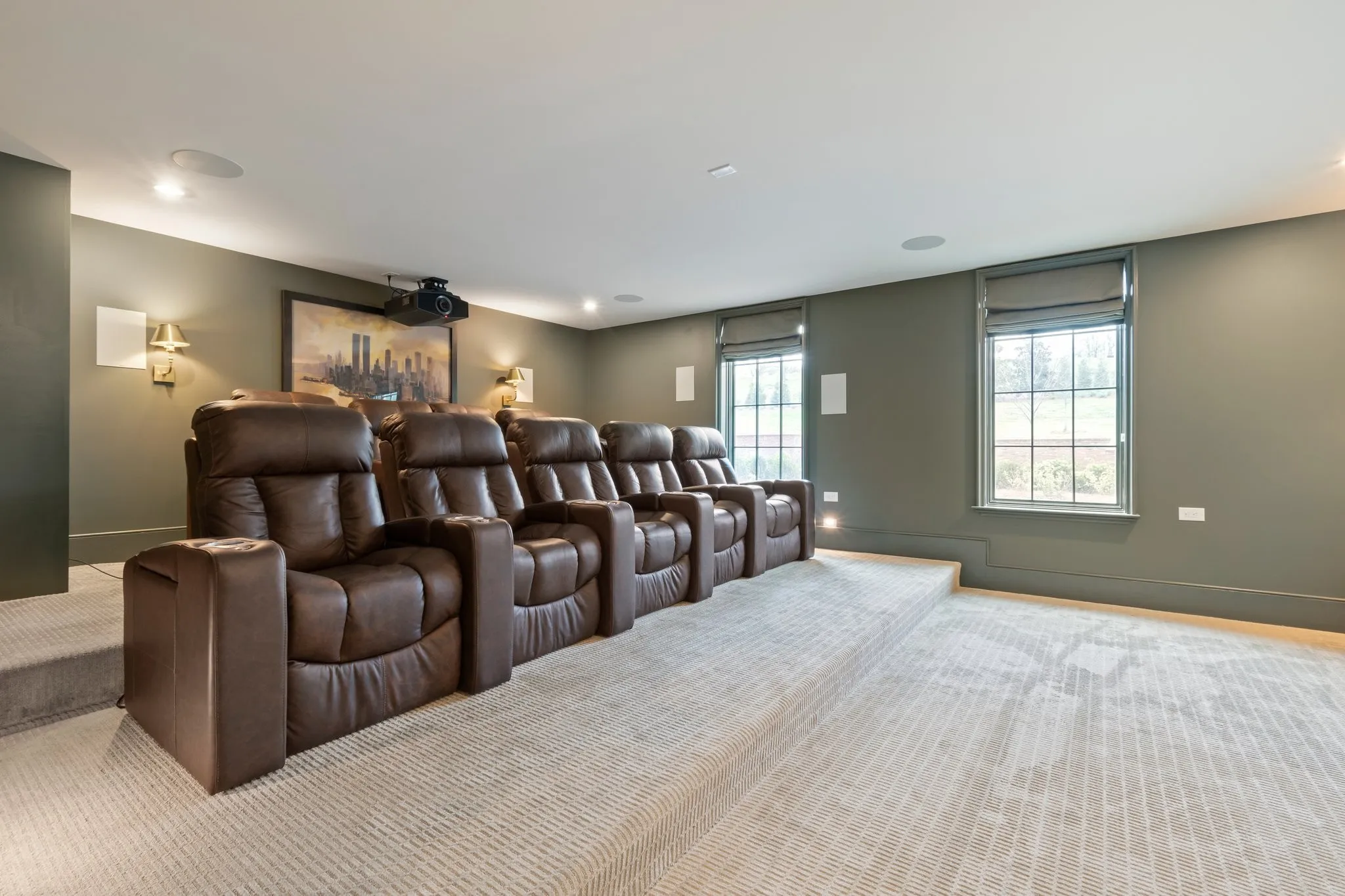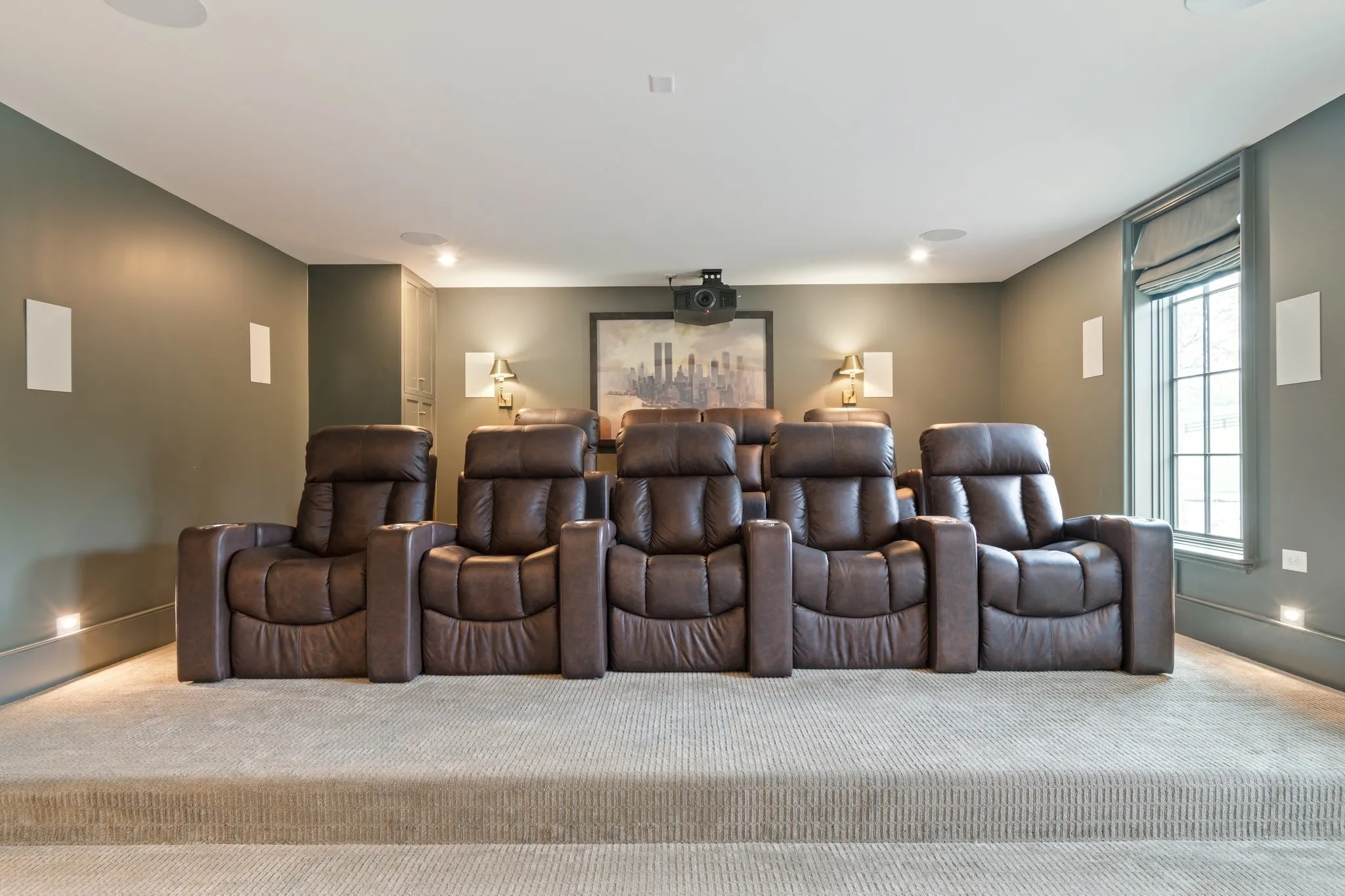Entertain in the fully custom home theater, complete with stadium seating, recliners, Dolby Atmos surround sound, a 160” screen, and a Sony 8K projector. Foam and rock wool soundproofing provide complete acoustic insulation, making it equally well suited as a music studio.