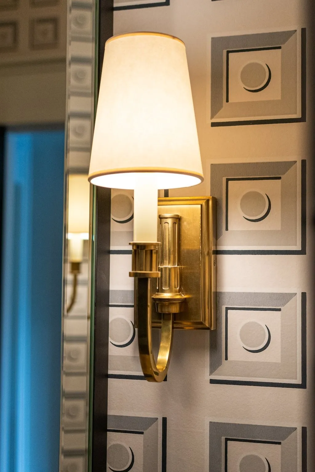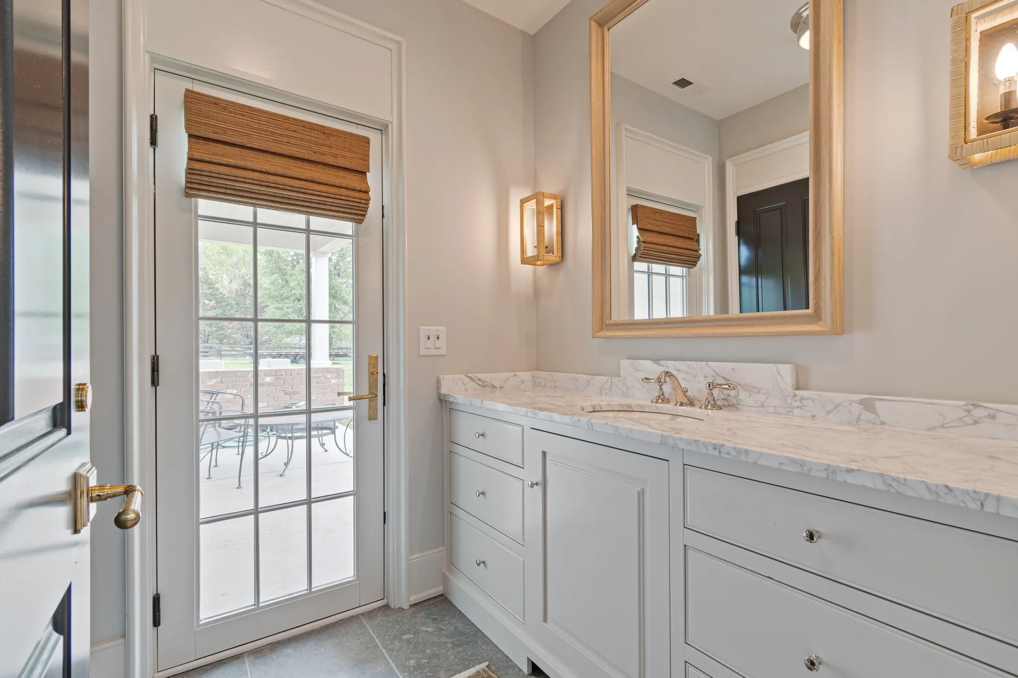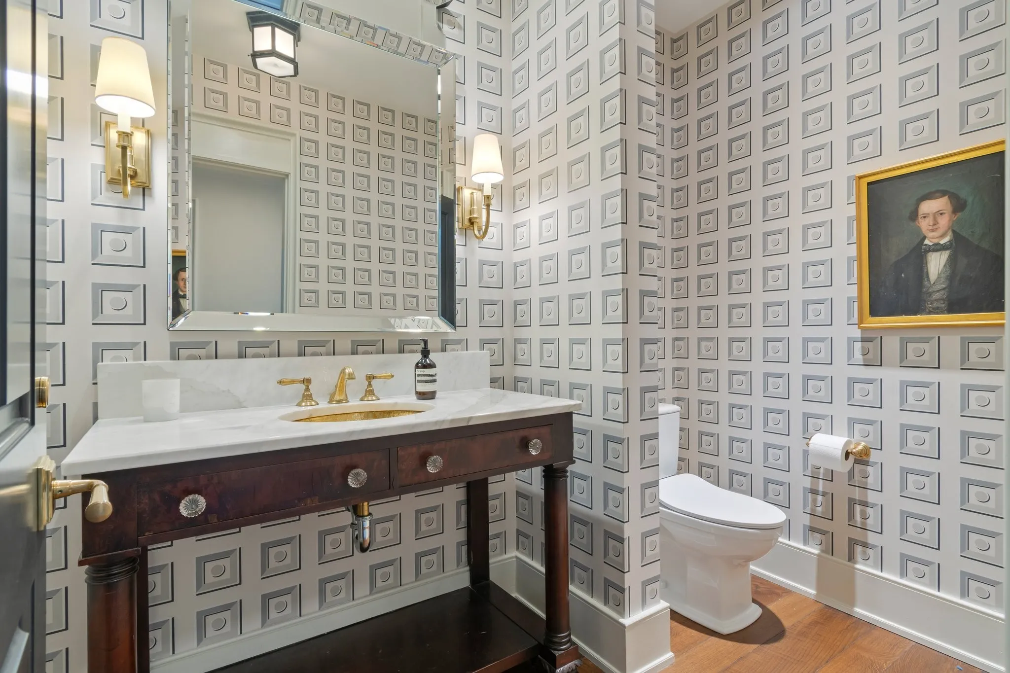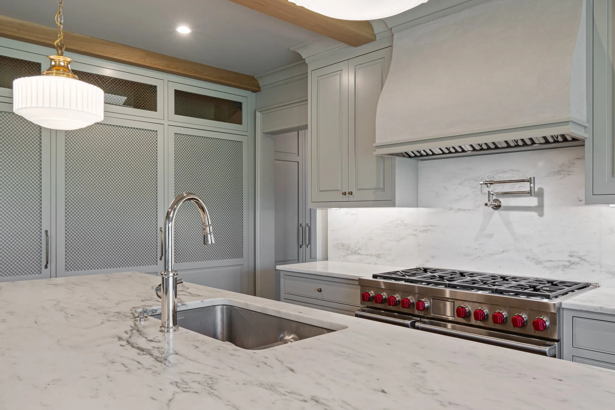 The kitchen is both stunning and functional, featuring marble countertops, island, and backsplash, custom inset oak cabinetry with brass mesh accents, and an 8-burner, 48” Wolf range. Other fine features include brass hardware throughout, white oak floors, Circa lighting, and hand-painted Pierre Frey wallpaper.