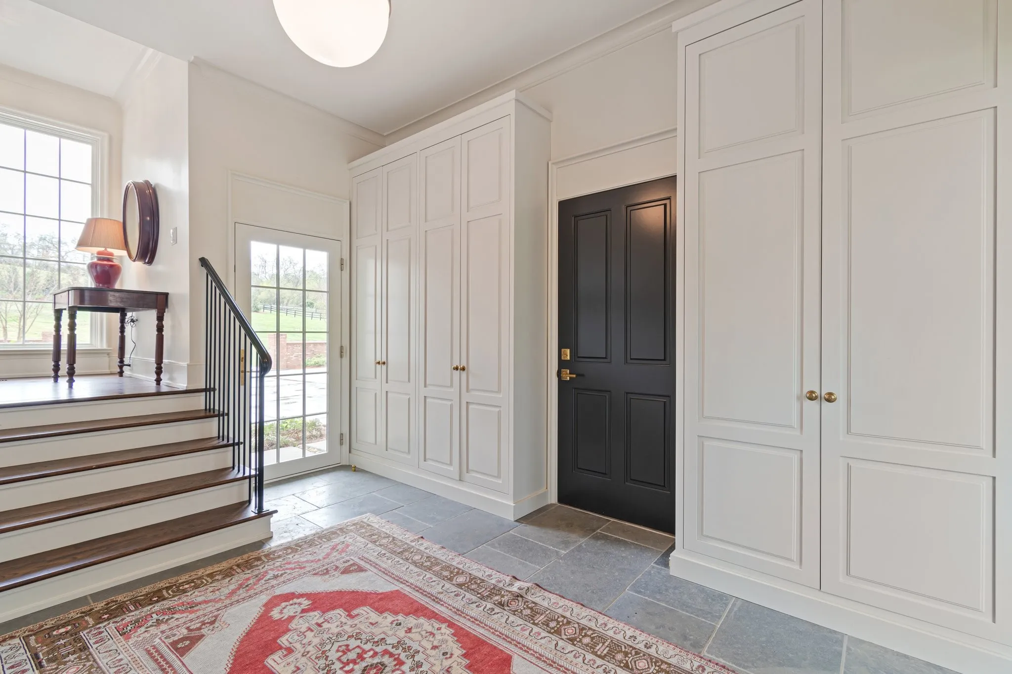 The first floor also includes a private guest suite and a mudroom clad in French St. Bleu limestone. The five-car conditioned garage and custom workshop with two additional tractor bays are a dream for the car enthusiast or hobbyist.