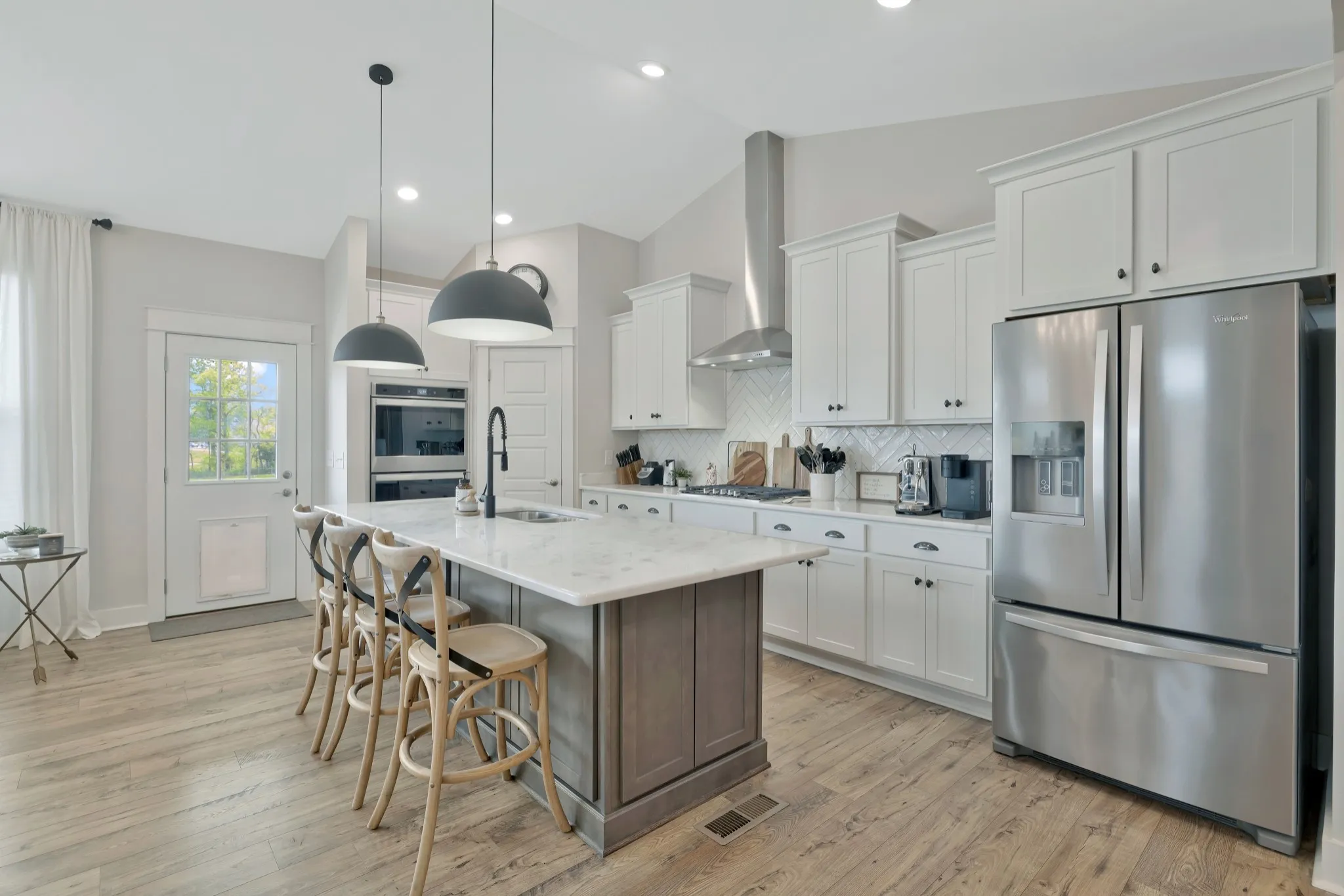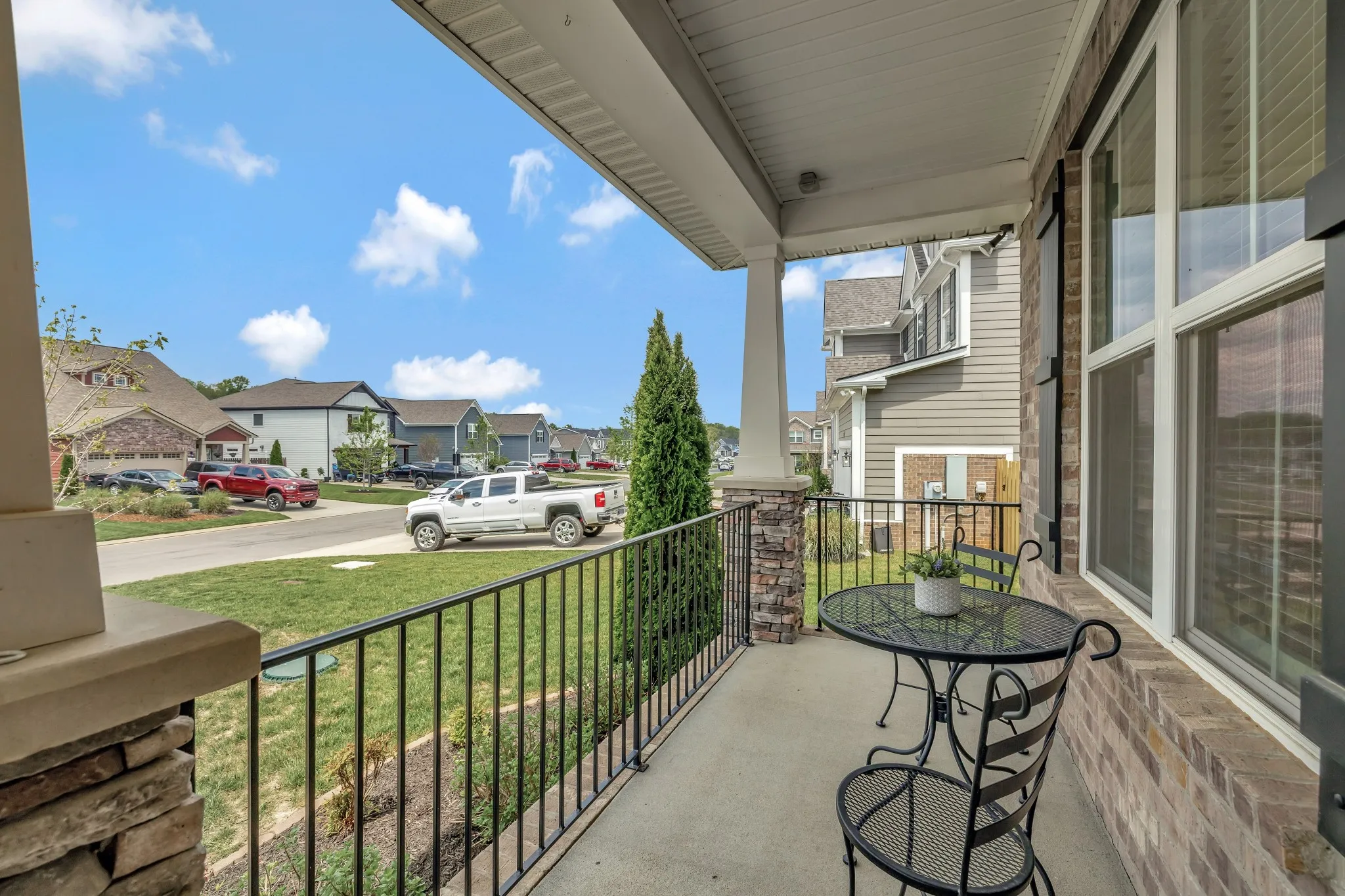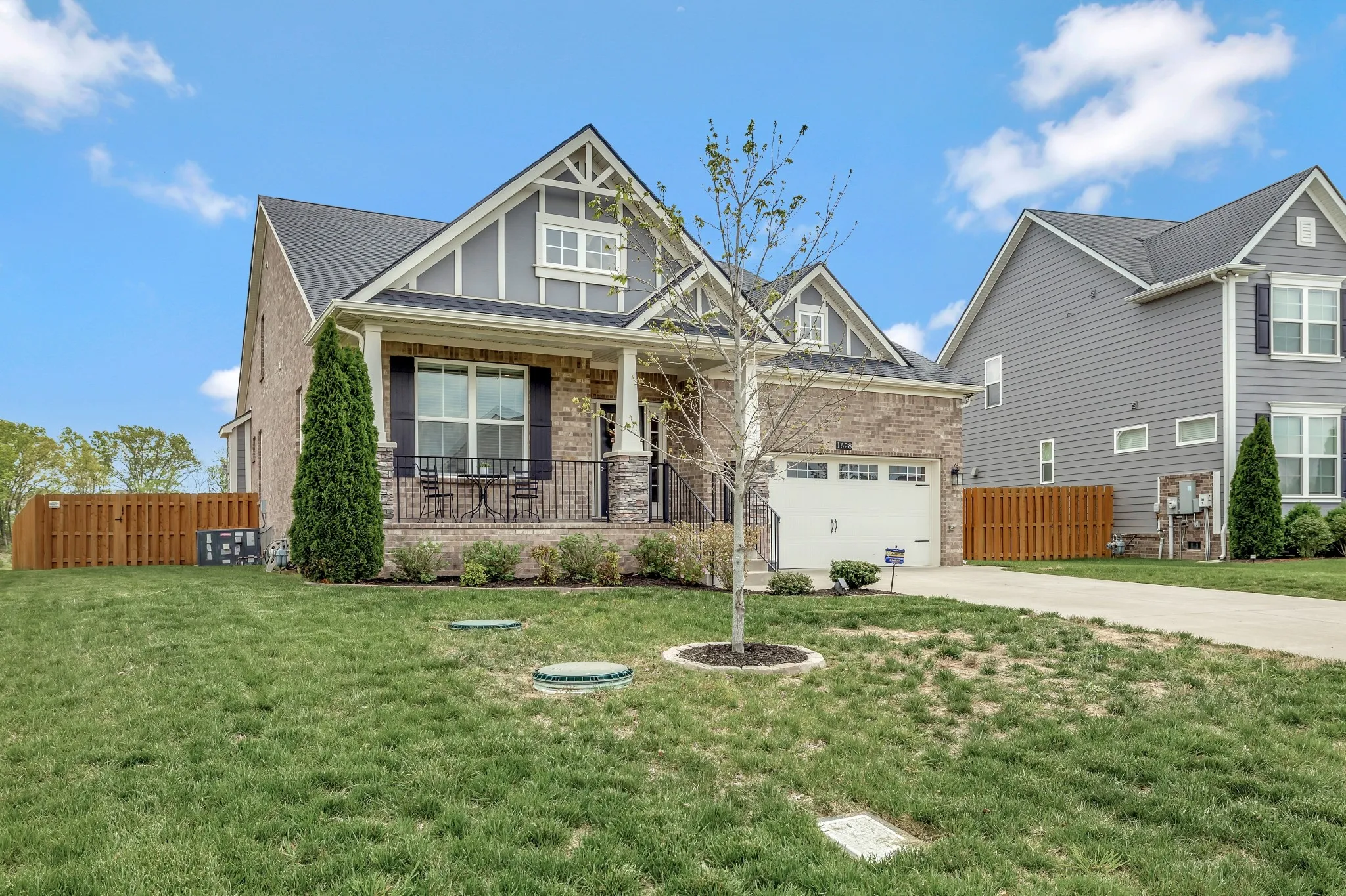 BETTER THAN NEW! The all-brick exterior offers timeless curb appeal, durability, and energy efficiency — a premium feature not available in nearby new construction. This beautiful semi-custom Beirstadt floor plan, built by The Jones Company, boasts designer upgrades and a unique custom elevation with a rocking chair front porch in the highly desirable South Haven neighborhood. Step into the inviting open-concept layout featuring designer lighting, vaulted ceilings, abundant natural light, and durable laminate flooring throughout the main level. Pass through the large formal dining room into a chef’s dream kitchen, complete with an oversized island with quartz countertops, double ovens, a 5-burner gas cooktop with stainless vent hood, two-tone cabinets, a herringbone tile backsplash, and a walk-in pantry with wood shelving. The main level includes a spacious primary bedroom suite with an oversized tiled shower, tile flooring, double vanity, and a fully enclosed toilet. The suite also boasts a tray ceiling and a custom oversized closet system. Also on the main level are the second and third bedrooms, a second full bath with tile flooring, a study with French doors and tray ceiling, and a laundry room with custom shelving and tile flooring. Upstairs features a large bonus room, a fourth bedroom with walk-in closet, a full bath with tile flooring, and ample walk-out storage. Enjoy outdoor living with a covered patio, lower grilling area with a propane hookup, and a fenced backyard with scenic views. Additional highlights: Stone fireplace with cedar mantle and pilot-on-demand gas logs, 9’ ceilings, wood stairs, 2″ vinyl blinds throughout, water treatment system, dual HVAC units, and an OnQ media panel system. The two-car garage includes an epoxy-coated floor, ceiling-mounted storage rack, pulley system for two kayaks, and bike hangers. Only a two-minute walk to the community pool, clubhouse, and playground. The neighborhood also features a scenic walking trail.