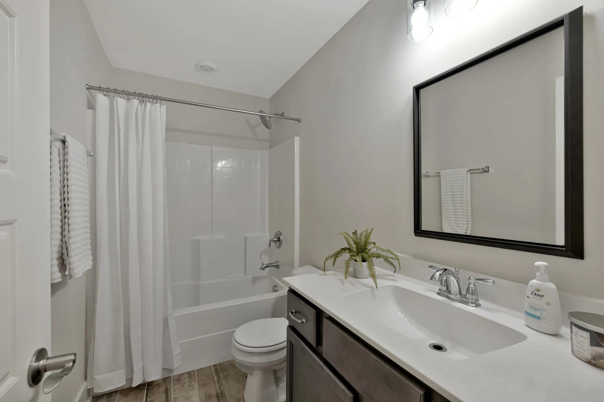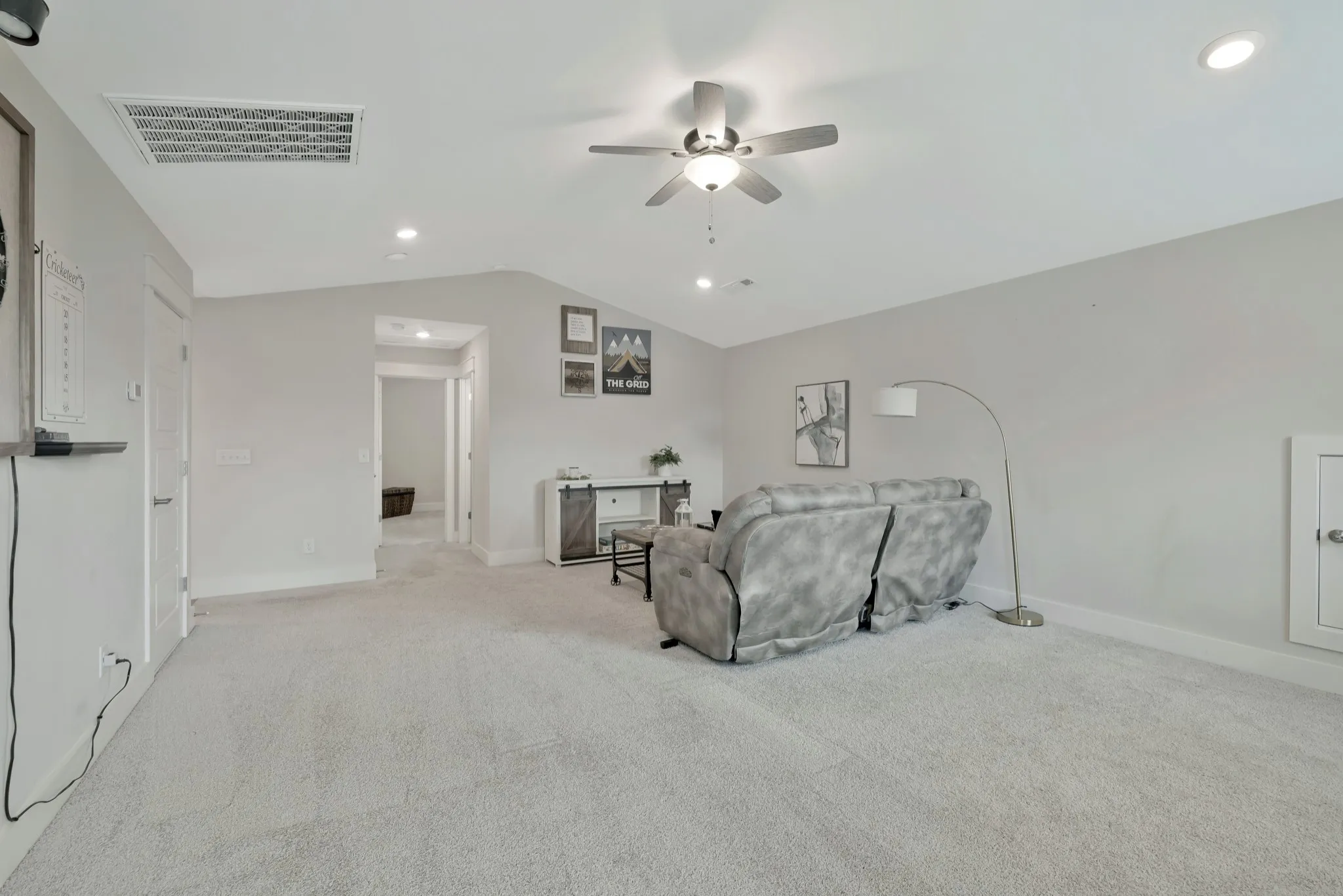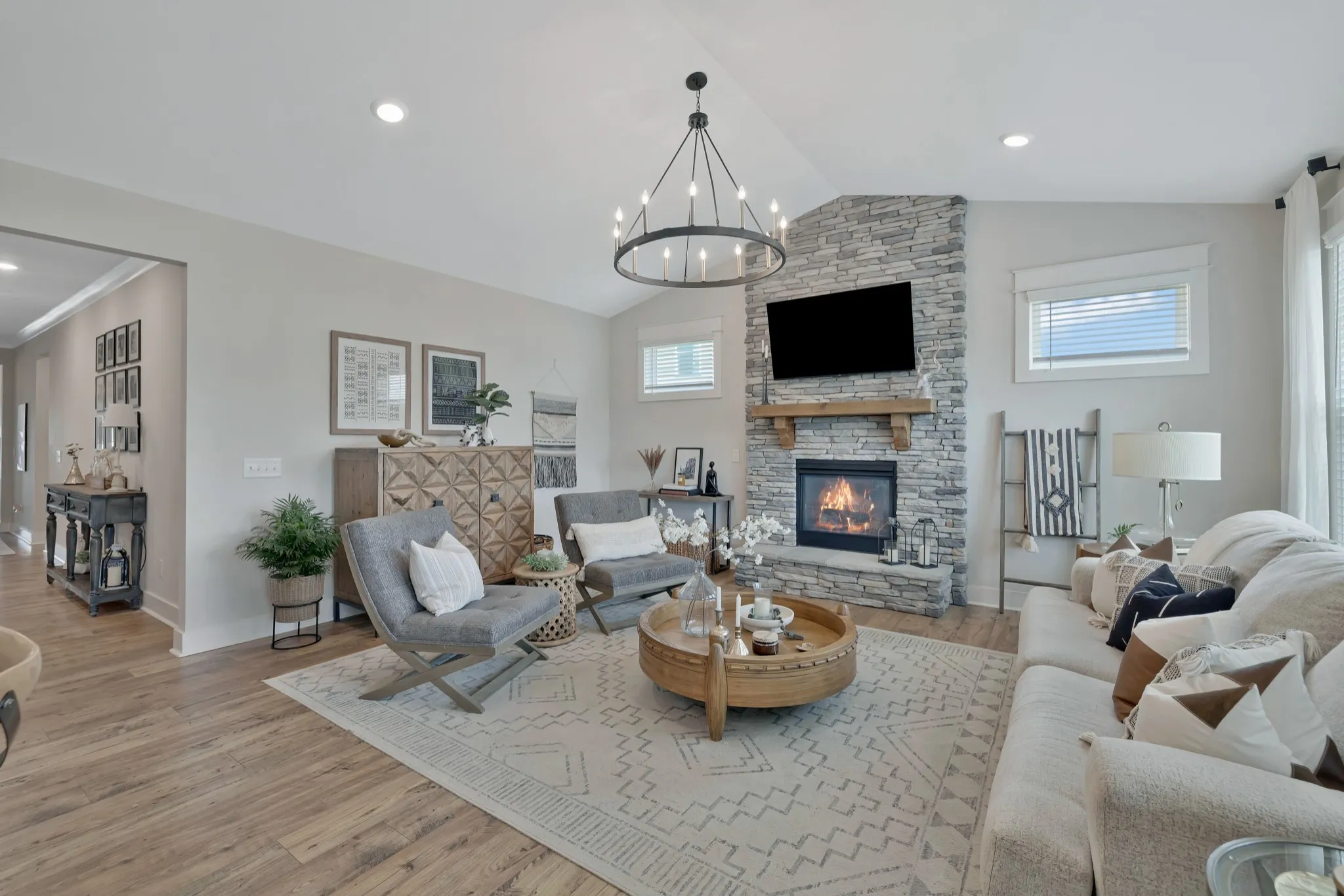 BETTER THAN NEW! The all-brick exterior offers timeless curb appeal, durability, and energy efficiency — a premium feature not available in nearby new construction. This beautiful semi-custom Beirstadt floor plan, built by The Jones Company, boasts designer upgrades and a unique custom elevation with a rocking chair front porch in the highly desirable South Haven neighborhood. Step into the inviting open-concept layout featuring designer lighting, vaulted ceilings, abundant natural light, and durable laminate flooring throughout the main level. Pass through the large formal dining room into a chef’s dream kitchen, complete with an oversized island with quartz countertops, double ovens, a 5-burner gas cooktop with stainless vent hood, two-tone cabinets, a herringbone tile backsplash, and a walk-in pantry with wood shelving. The main level includes a spacious primary bedroom suite with an oversized tiled shower, tile flooring, double vanity, and a fully enclosed toilet. The suite also boasts a tray ceiling and a custom oversized closet system. Also on the main level are the second and third bedrooms, a second full bath with tile flooring, a study with French doors and tray ceiling, and a laundry room with custom shelving and tile flooring. Upstairs features a large bonus room, a fourth bedroom with walk-in closet, a full bath with tile flooring, and ample walk-out storage. Enjoy outdoor living with a covered patio, lower grilling area with a propane hookup, and a fenced backyard with scenic views. Additional highlights: Stone fireplace with cedar mantle and pilot-on-demand gas logs, 9’ ceilings, wood stairs, 2″ vinyl blinds throughout, water treatment system, dual HVAC units, and an OnQ media panel system. The two-car garage includes an epoxy-coated floor, ceiling-mounted storage rack, pulley system for two kayaks, and bike hangers. Only a two-minute walk to the community pool, clubhouse, and playground. The neighborhood also features a scenic walking trail.