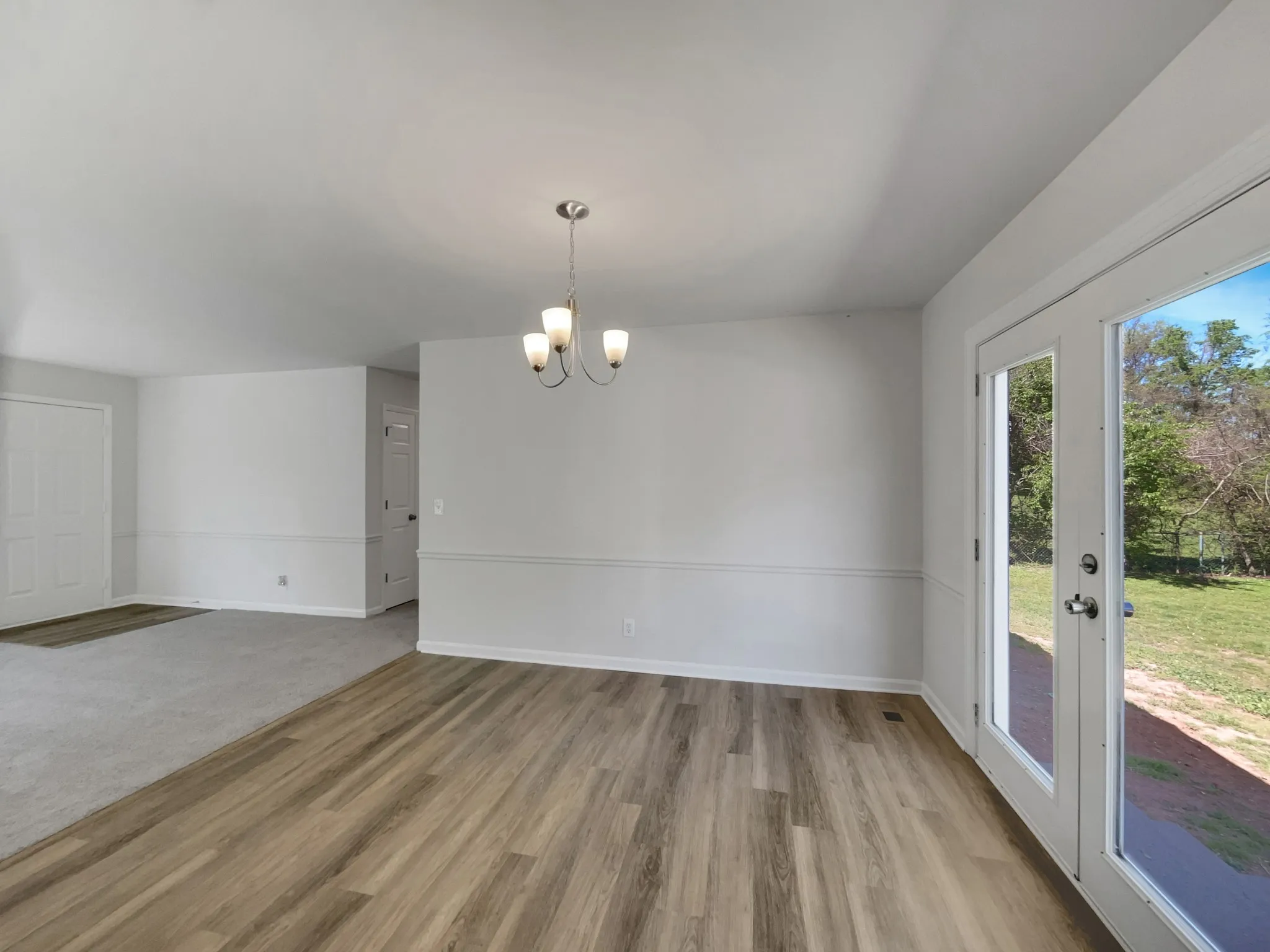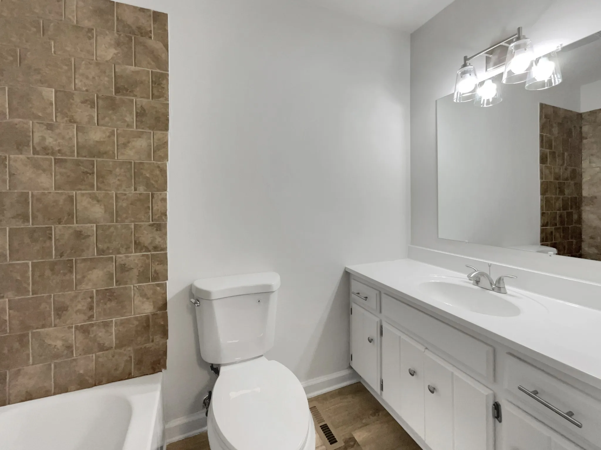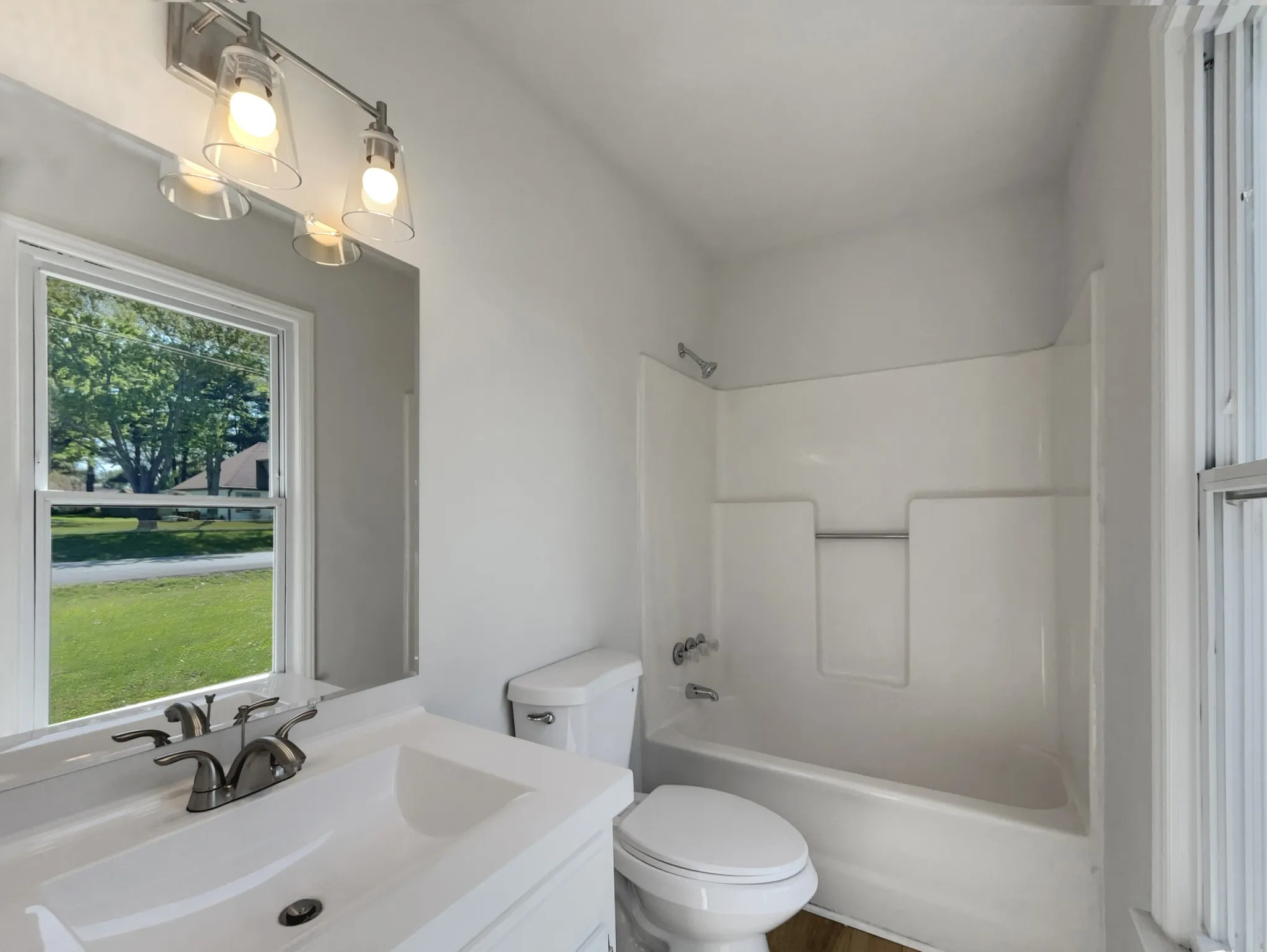 move-in ready home features a white kitchen with stainless steel appliances, brand-new flooring