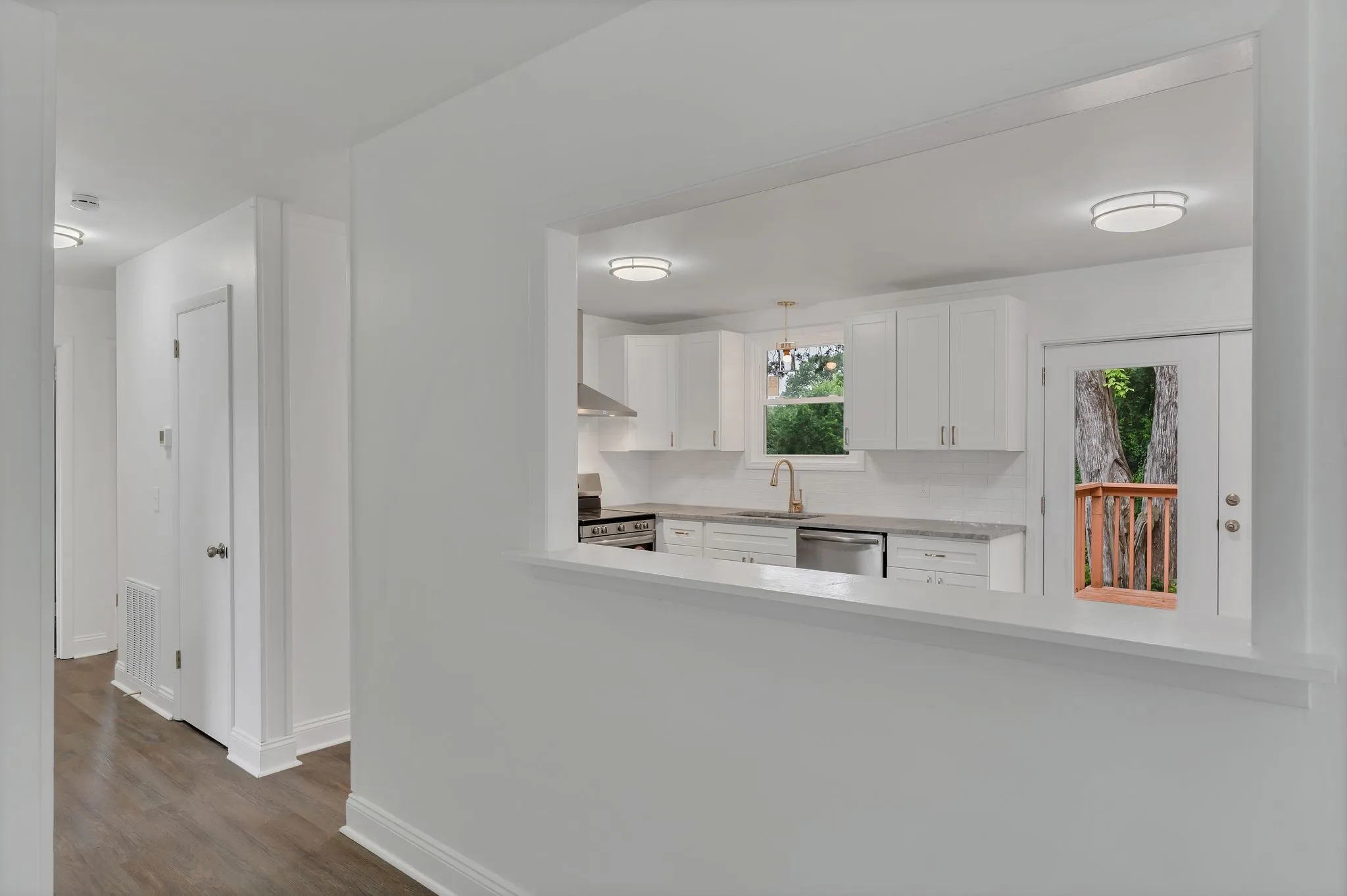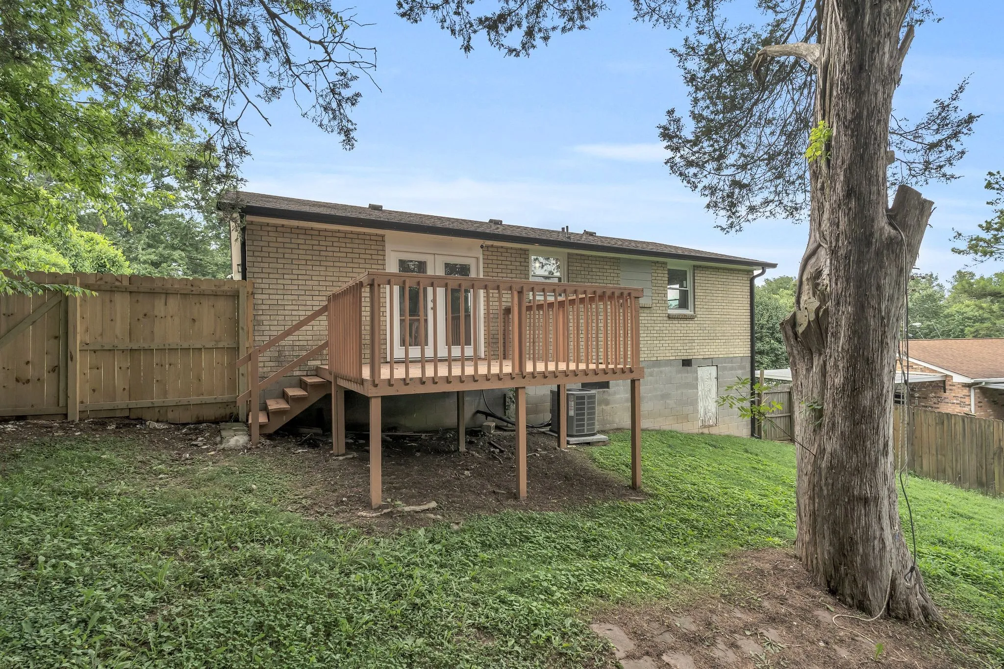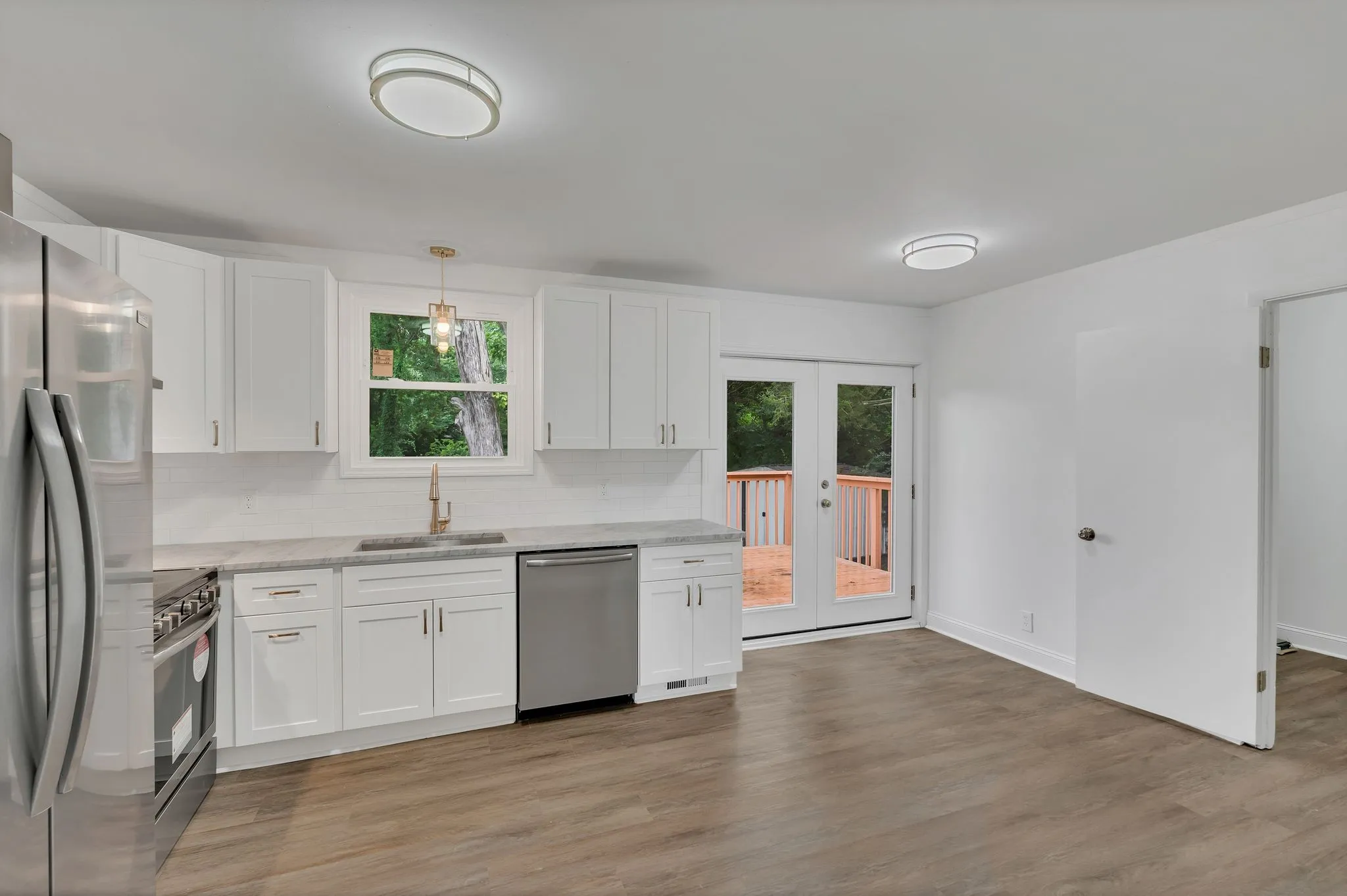 Owner/Agent. This fully remodeled 3-bedroom, 1-bath home is move-in ready and packed with upgrades. Enjoy all-new energy-efficient windows, premium luxury vinyl plank flooring, and plush new carpet with thick padding in all bedrooms. The beautifully renovated bathroom features a custom tile floor, walk-in shower, and a new vanity with a granite countertop. The brand-new kitchen is a showstopper—complete with stainless steel appliances, quartzite countertops, custom cabinetry, a stylish backsplash, and a built-in dishwasher. Additional highlights include all-new lighting, fresh paint, updated electrical outlets, and a dedicated laundry room. Outside, you’ll find new gutters, soffits, French doors, an HVAC system, and a vapor barrier. Relax or entertain on the back deck overlooking the large, private, fenced-in yard!! This home offers modern style, comfort, and peace of mind—inside and out!