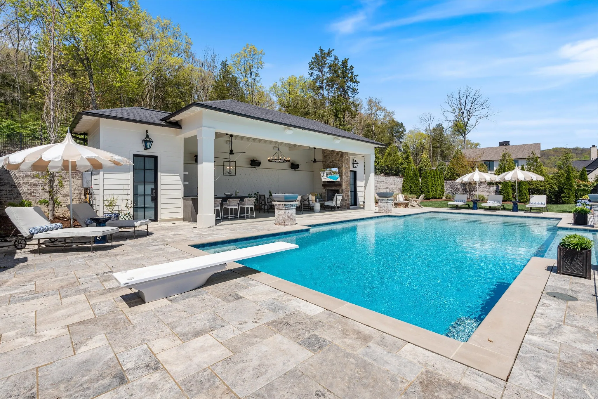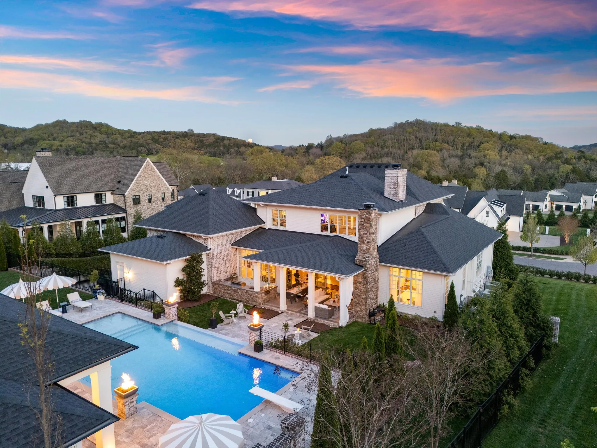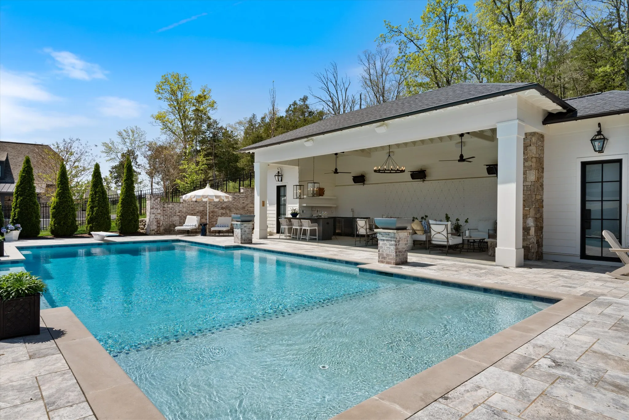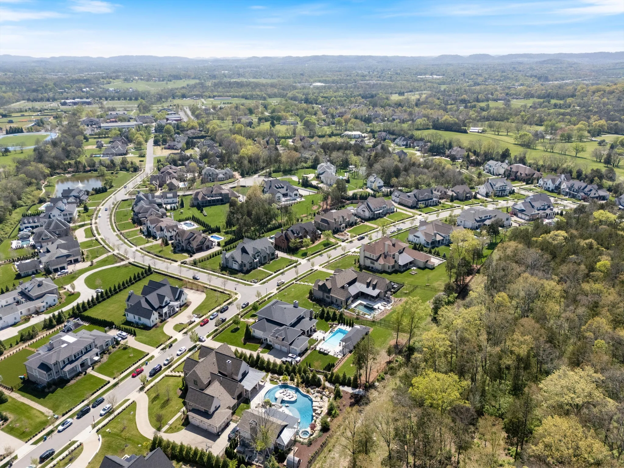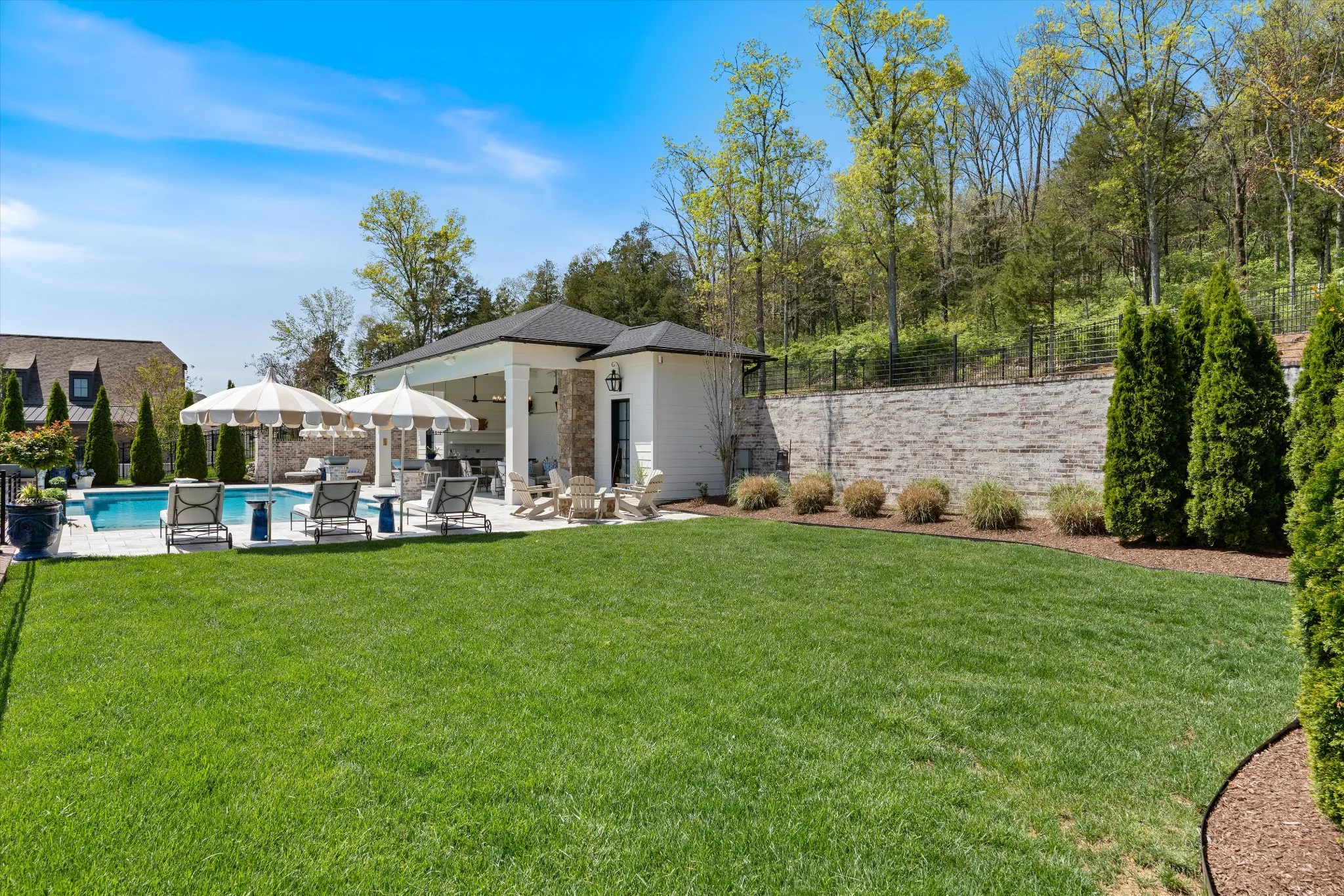 This stunning home is an entertainer’s DREAM built by Davis Properties with incredible views in one of Franklin’s most convenient locations! This home exudes luxury inside + out on a premier 2-acre tree-lined lot in the Preserve at Echo Estates, a luxury community tucked into a peaceful enclave of lush beauty, yet just minutes away from The Factory, Downtown Franklin, Harlinsdale Farm, BGA + Cool Springs. This well-maintained home includes an open floor plan complete with designer touches and high-end finishes throughout, as well as smart home technology including a Sonos surround system, full security system with cameras, and an Omnilogic system for the pool. No expense was spared in creating a true outdoor oasis equipped with a complete outdoor kitchen including a sink, refrigerator drawers, Memphis Grill with App, oversized gas burner, condiment/ice bin, and adjacent dining and seating areas with a fireplace and outdoor TV. Ushering you further outside is a courtyard seating area with a striking waterfall feature, professional landscaping, and dual stair access into a second level of masterful design. There, a gunite pool with an auto refill catch basin system, diving board, lounging ledge, and 4 gas fire bowls accompany a stunning cabana! This state-of-the-art cabana includes gas lanterns, iron doors, designer finishes, a half bath and changing room, as well as a designated laundry room in which both rooms are equipped with heating and A/C. In the outdoor portion of the cabana is another outdoor kitchen with 2 mini fridges, a sink, soapstone countertops, an ice machine, built-in kegerator, Brilliant smart home system with designated control panel, ample floor lighting, built-in gas heaters, WiFi, Sonos speakers, another fireplace and TV, in addition to another set of seating and dining spaces. The fully fenced backyard also includes a gas fire pit, multiple umbrella lounge locations, manicured lawn space, and an additional tier of open space with gate access!