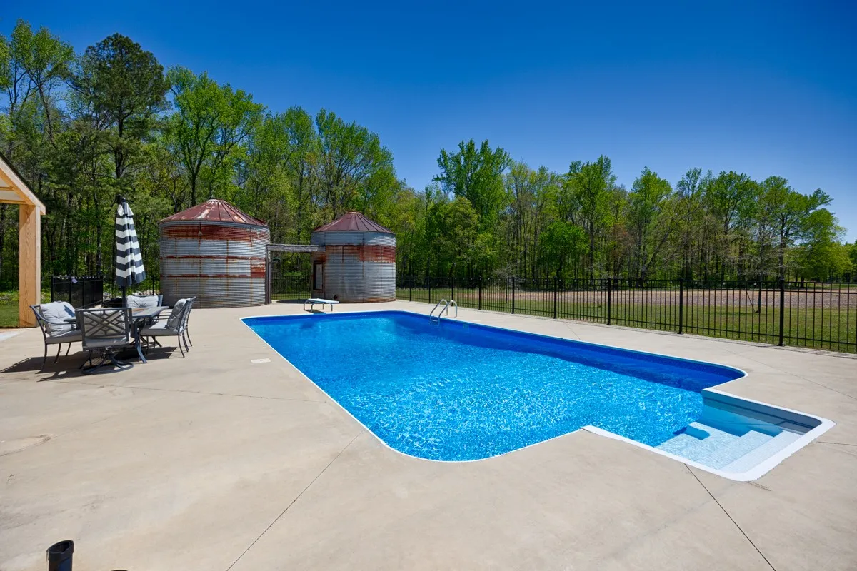 "LongDescription" => "16x32 inground pool with wrought iron fencing, two silos - one has 1/2 bath and the other is for pool equipment storage"