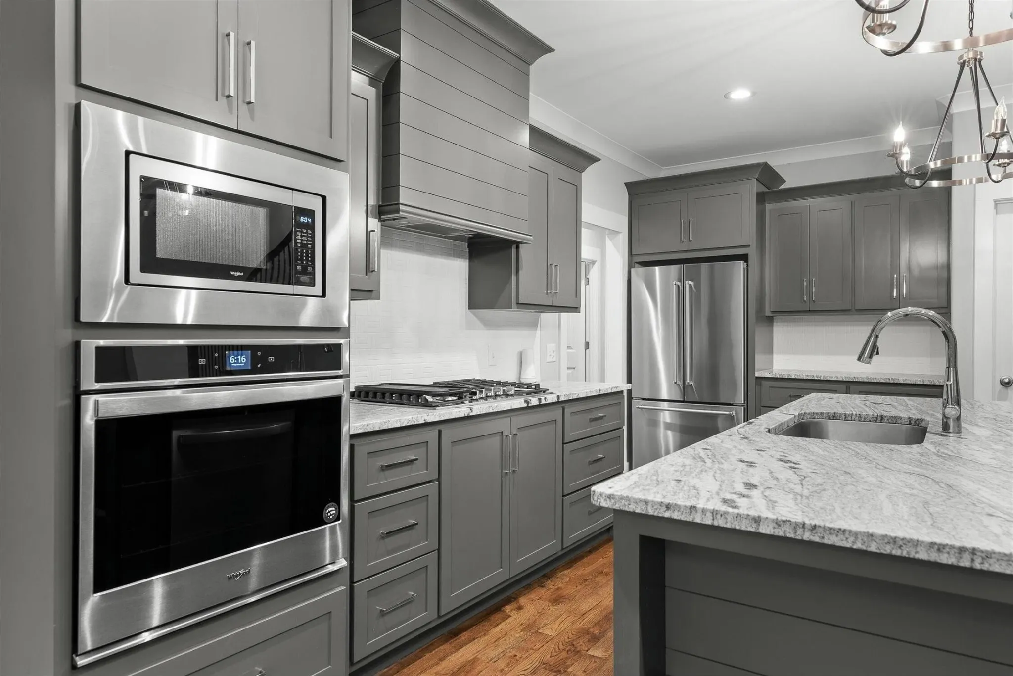 Inside, you’ll find beautiful hardwood floors, high-end finishes, and a spacious open-concept living area that’s ideal for both everyday life and entertaining. The kitchen is a true centerpiece, featuring a large stone island, stunning countertops, and abundant storage. The oversized two-car garage provides plenty of extra space for vehicles, storage, or a workshop setup.