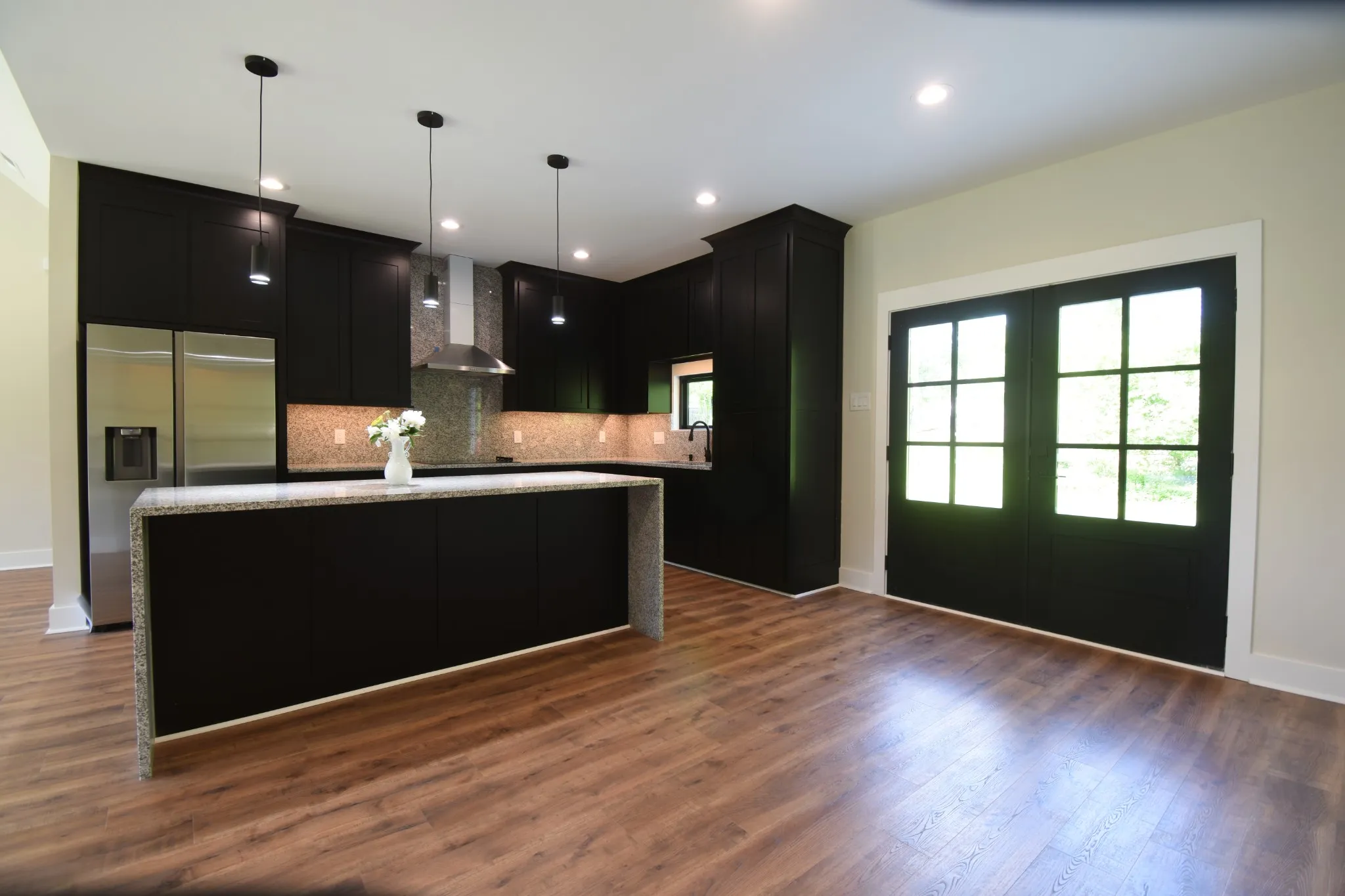 Granite countertops and wood laminate flooring throughout.