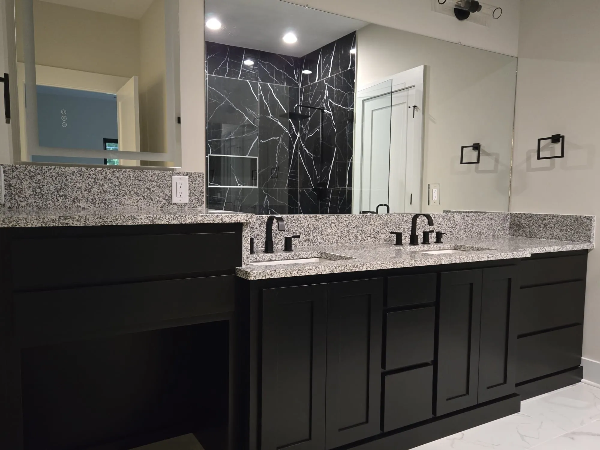 Granite countertops with cascade island with ample tall cabinets.