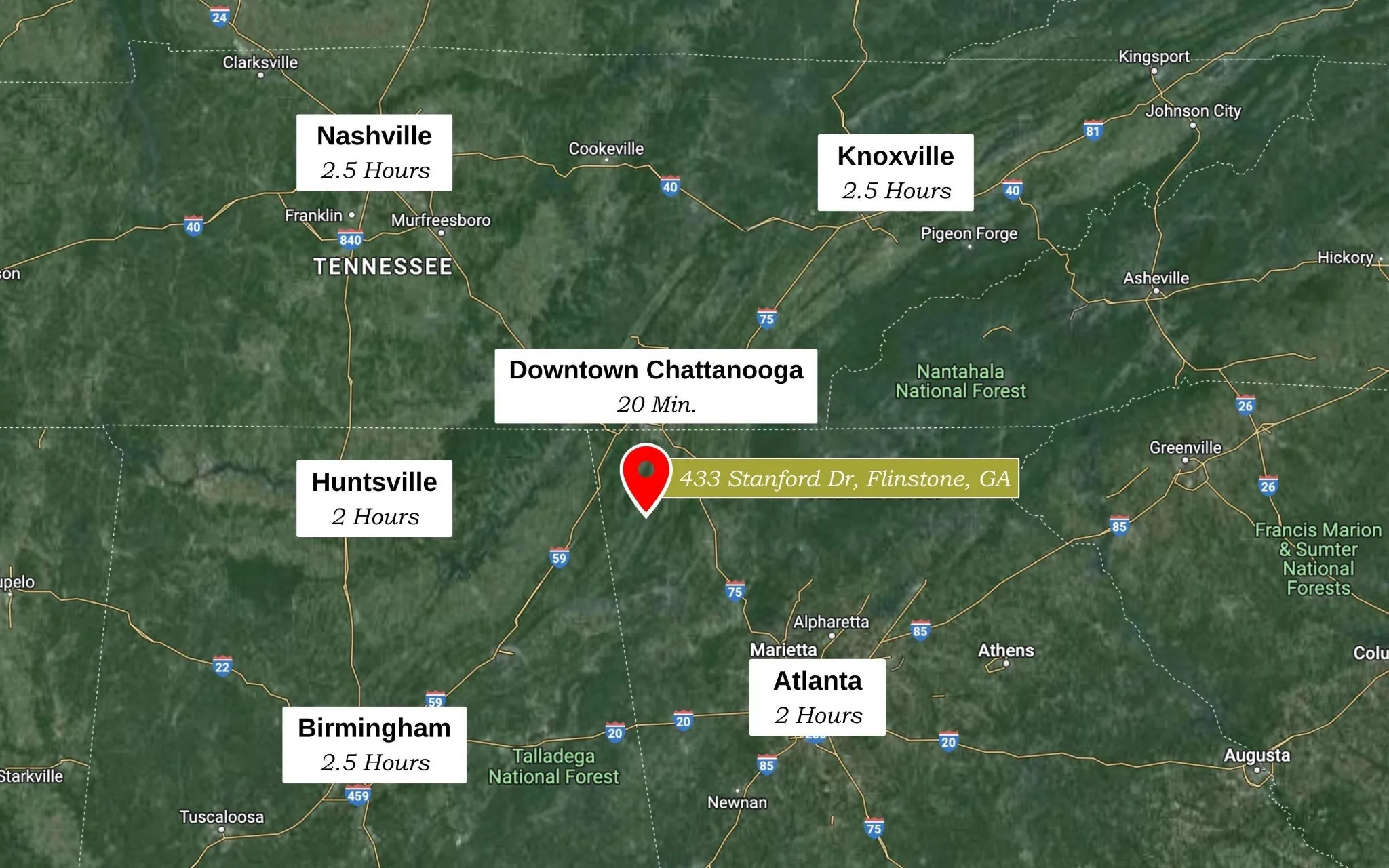 - Directions: From Downtown Chattanooga: Take Broad Street south to St Elmo. Use the left 2 lanes to turn left onto TN-17. Follow to Georgia state line. Continue on GA-193S. Turn left onto Chickamauga Road. Sight right onto Old Chattanooga Valley Road. Turn left onto Stanford Drive, home will be on the left.