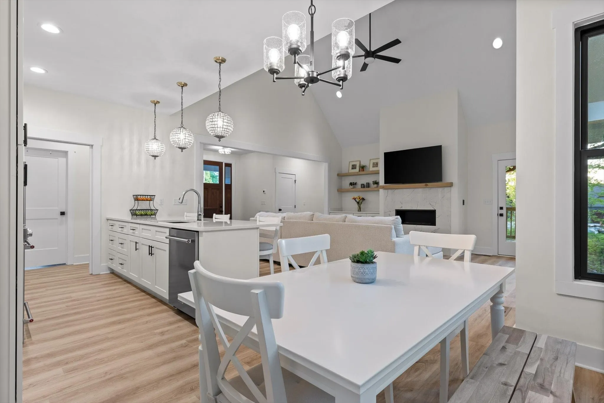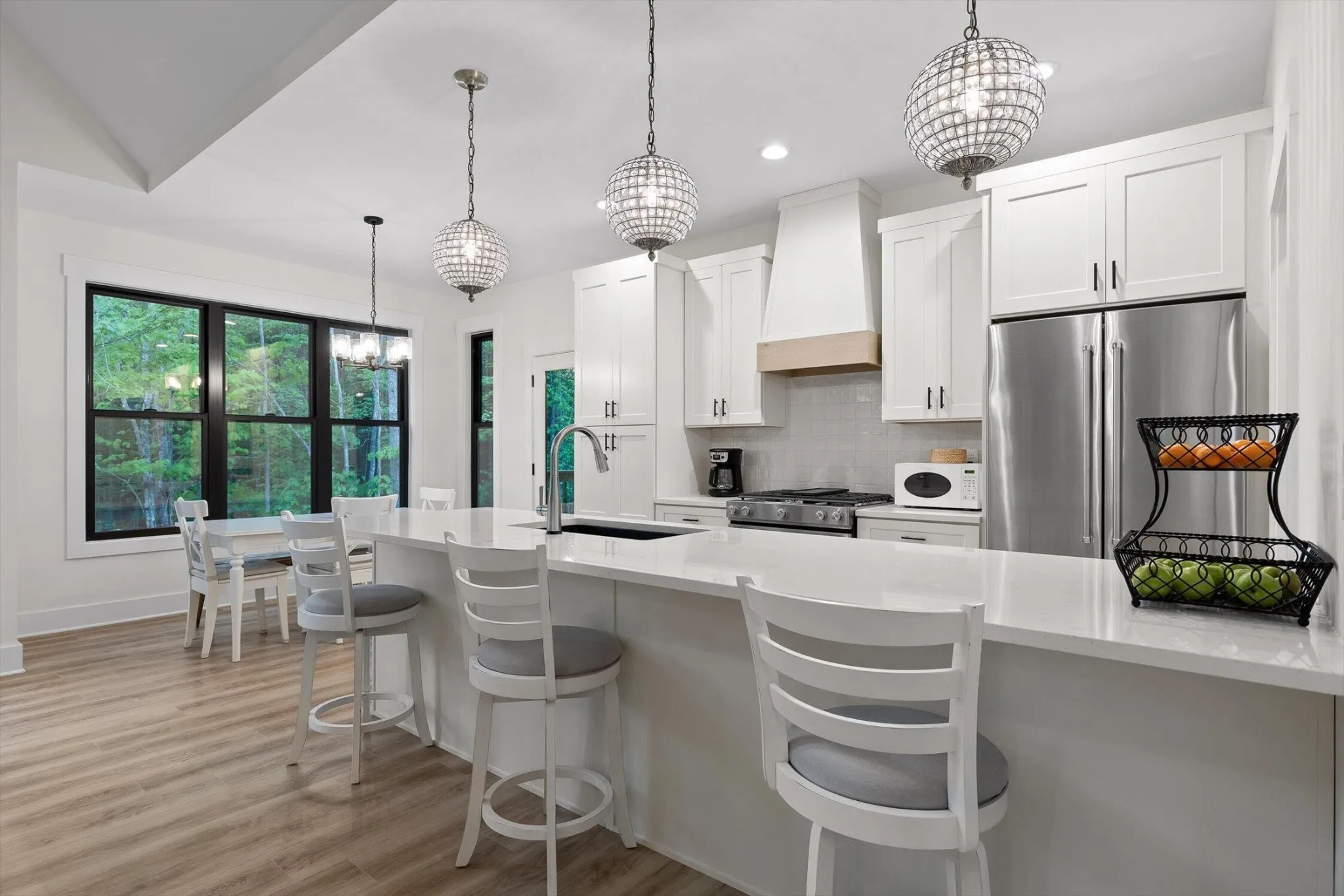 Inside, an open-concept layout welcomes you with soaring ceilings and expansive windows that frame the lush woodland backdrop. A marble gas fireplace anchors the living area, blending elegance and warmth, while the chef's kitchen features a gas stove, bar seating, and a dedicated dining area ideal for entertaining. The primary suite boasts vaulted ceilings, a private walkout to the back deck, and a spa-inspired bathroom with an oversized walk-in shower, dual vanities, and a soaking tub.\r\n