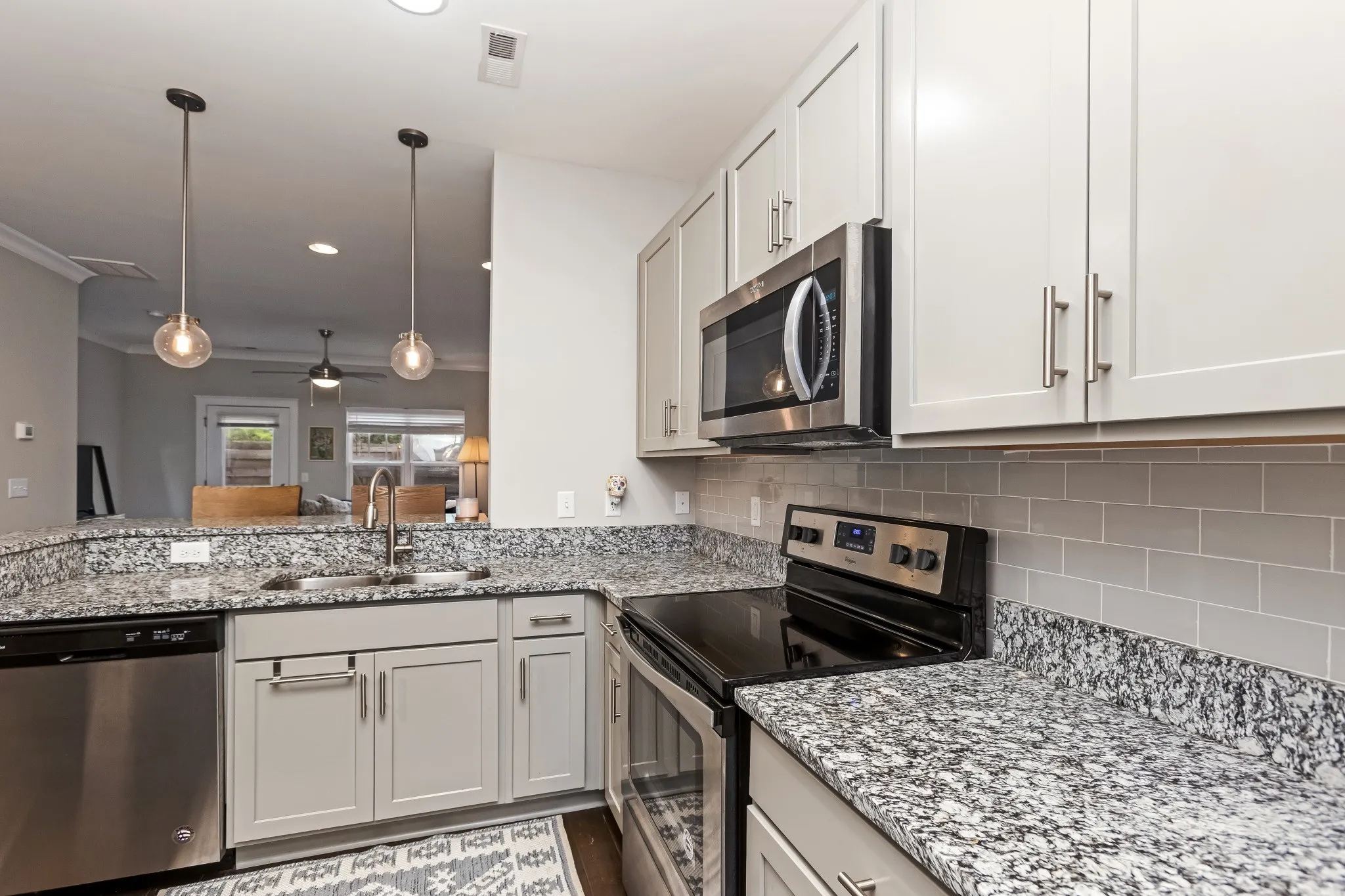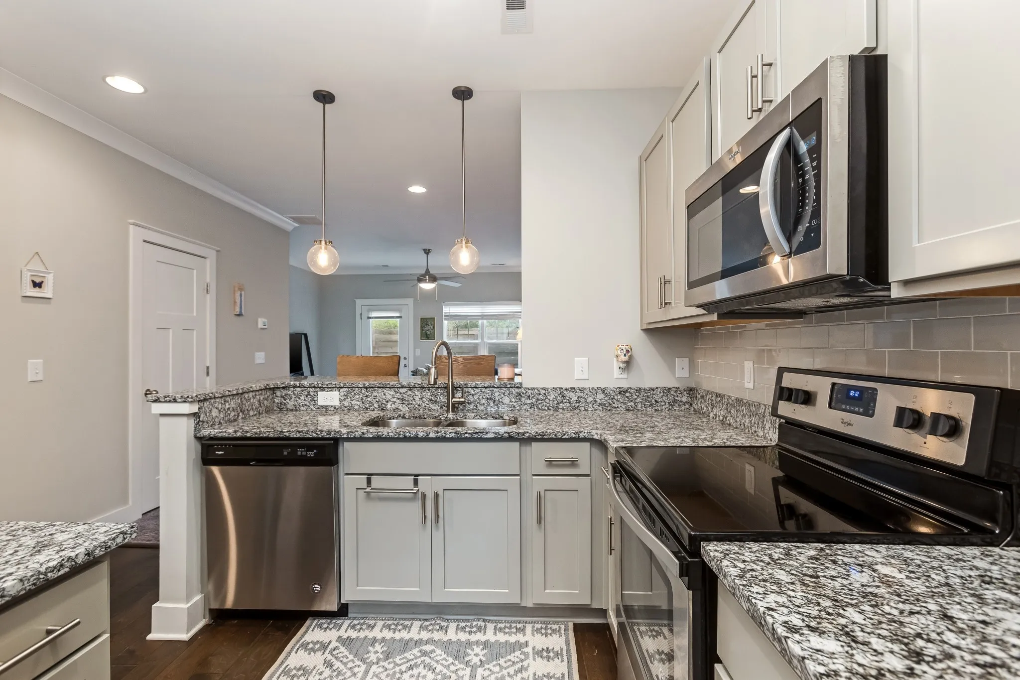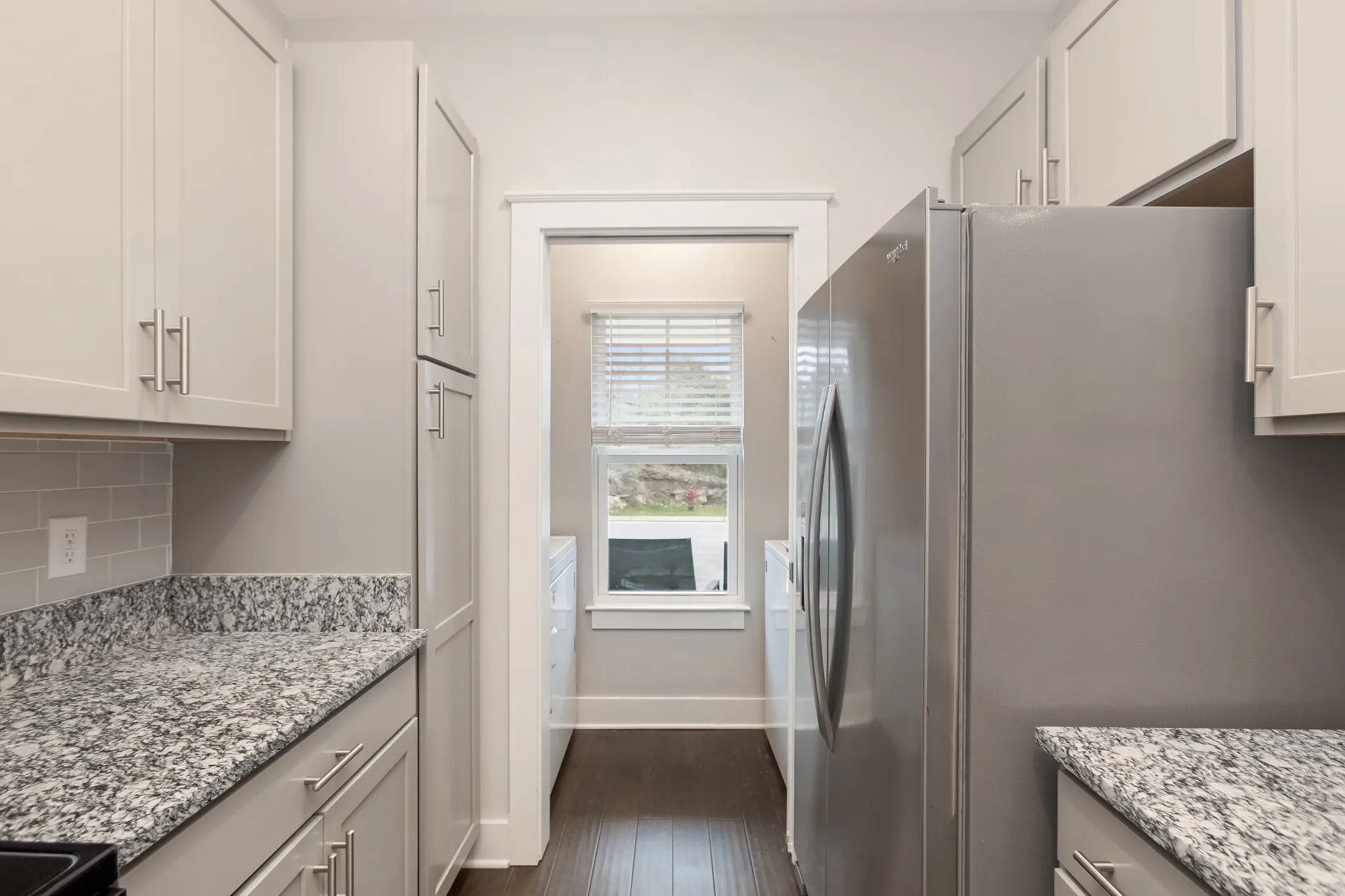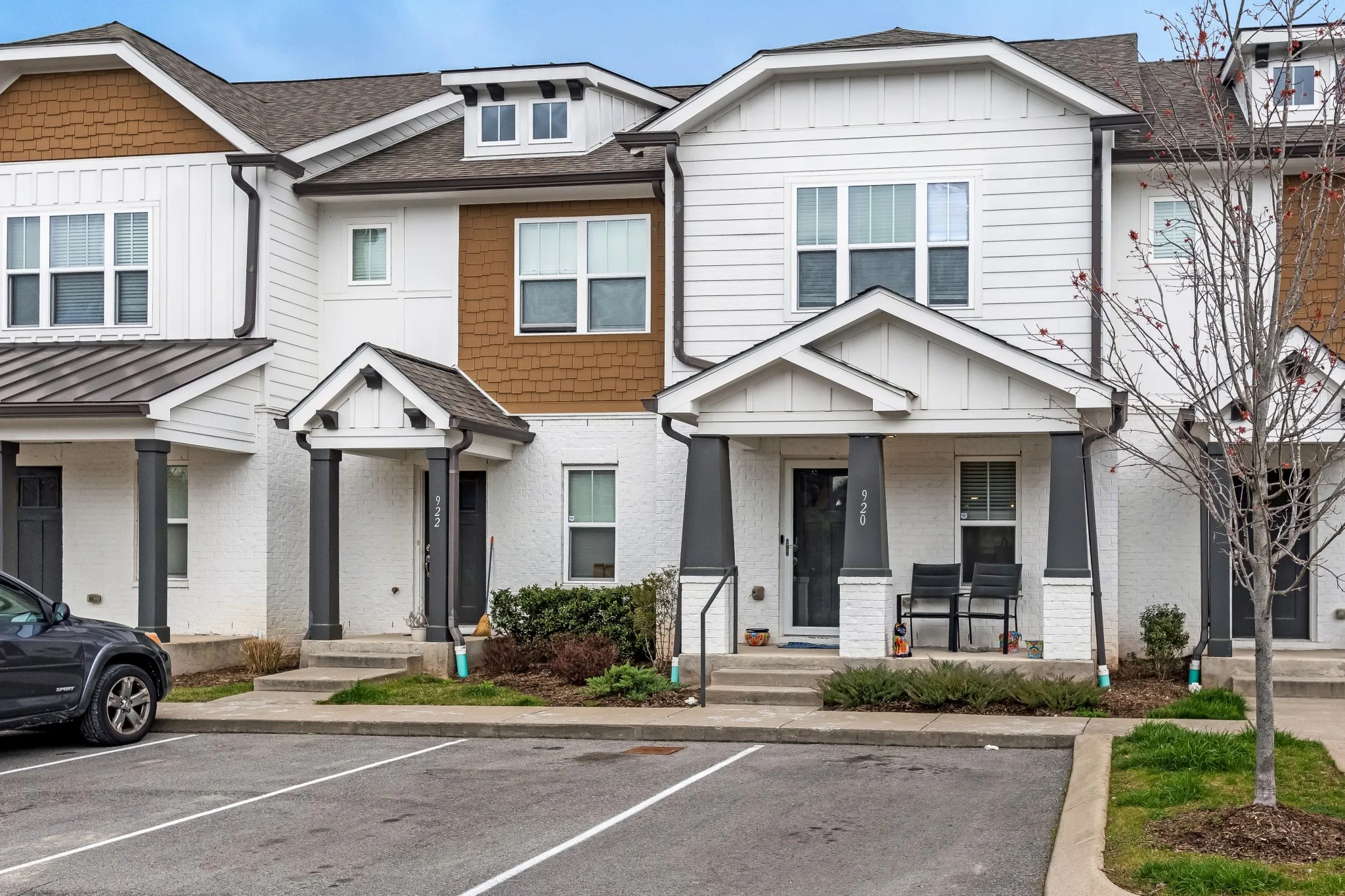 Set within an intimate development, this beautiful modern townhome offers sophisticated living with thoughtful design. The open concept layout showcases premium engineered wood flooring, complemented by plush carpet and elegant tile bathrooms. This home features a spacious kitchen adorned with artisanal craftsman cabinets, designer tile backsplash, and sleek granite countertops. Premium stainless steel appliances complete this culinary haven. Upstairs, two generous bedrooms serve as private retreats, each with its own en-suite bathroom. Outdoor living spaces include a welcoming covered front porch and a secluded rear patio with convenient storage. Experience the refined comfort this townhome has to offer.