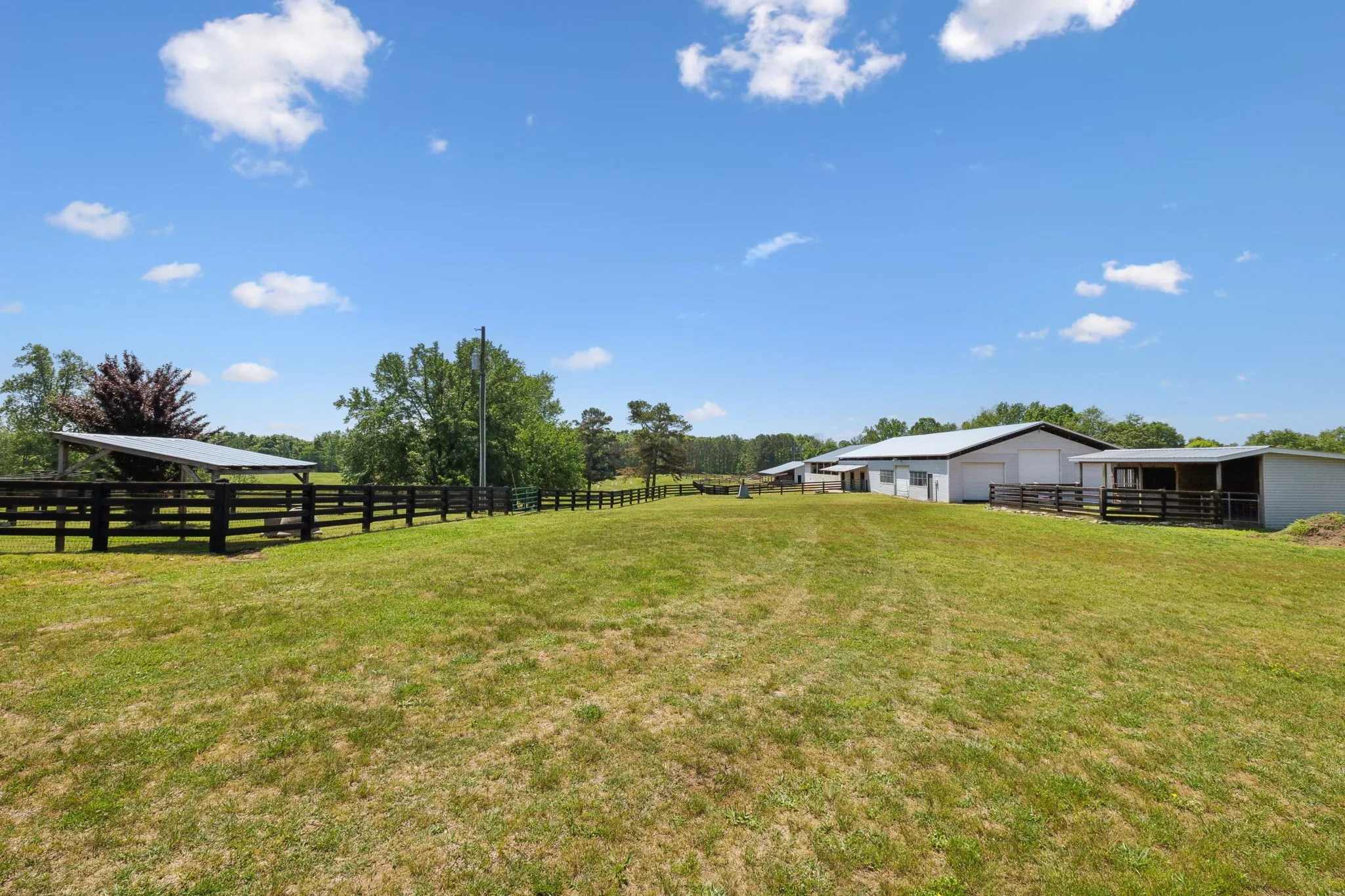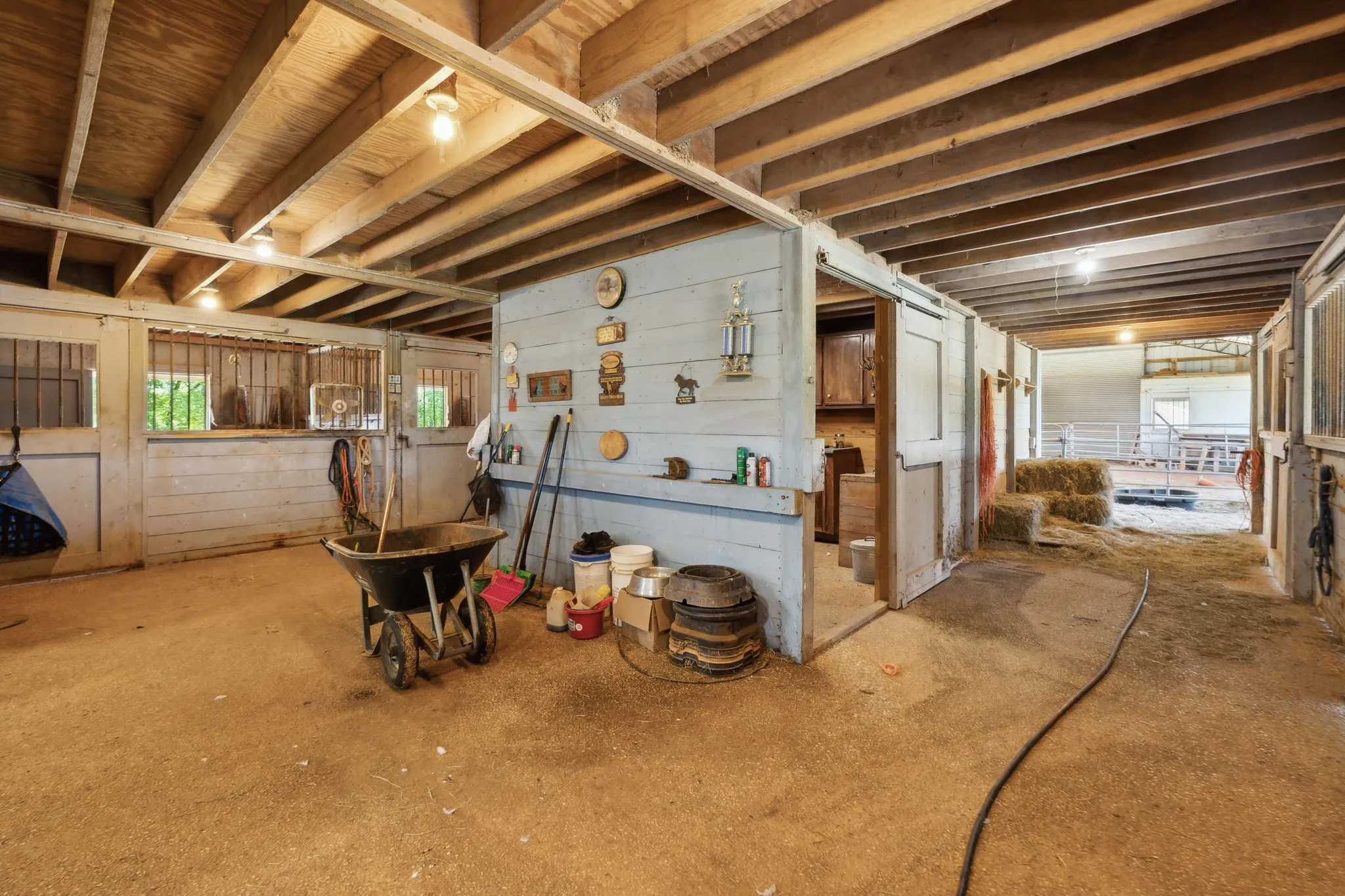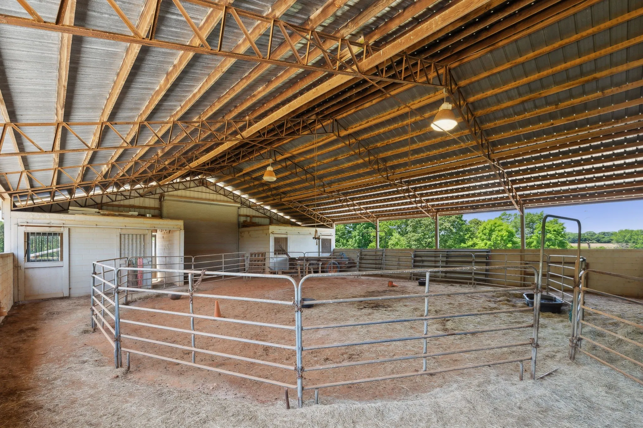 The equestrian facilities are second to none. The centerpiece barn includes a 46'x50' covered parking area for trailers and trucks, eight roomy stalls with turnout access on both sides, a large 12'x20' tack room, dedicated feed room, spacious wash area, and an indoor covered arena—ideal for training in any weather. For additional space, a large outdoor riding arena is also on-site.\n