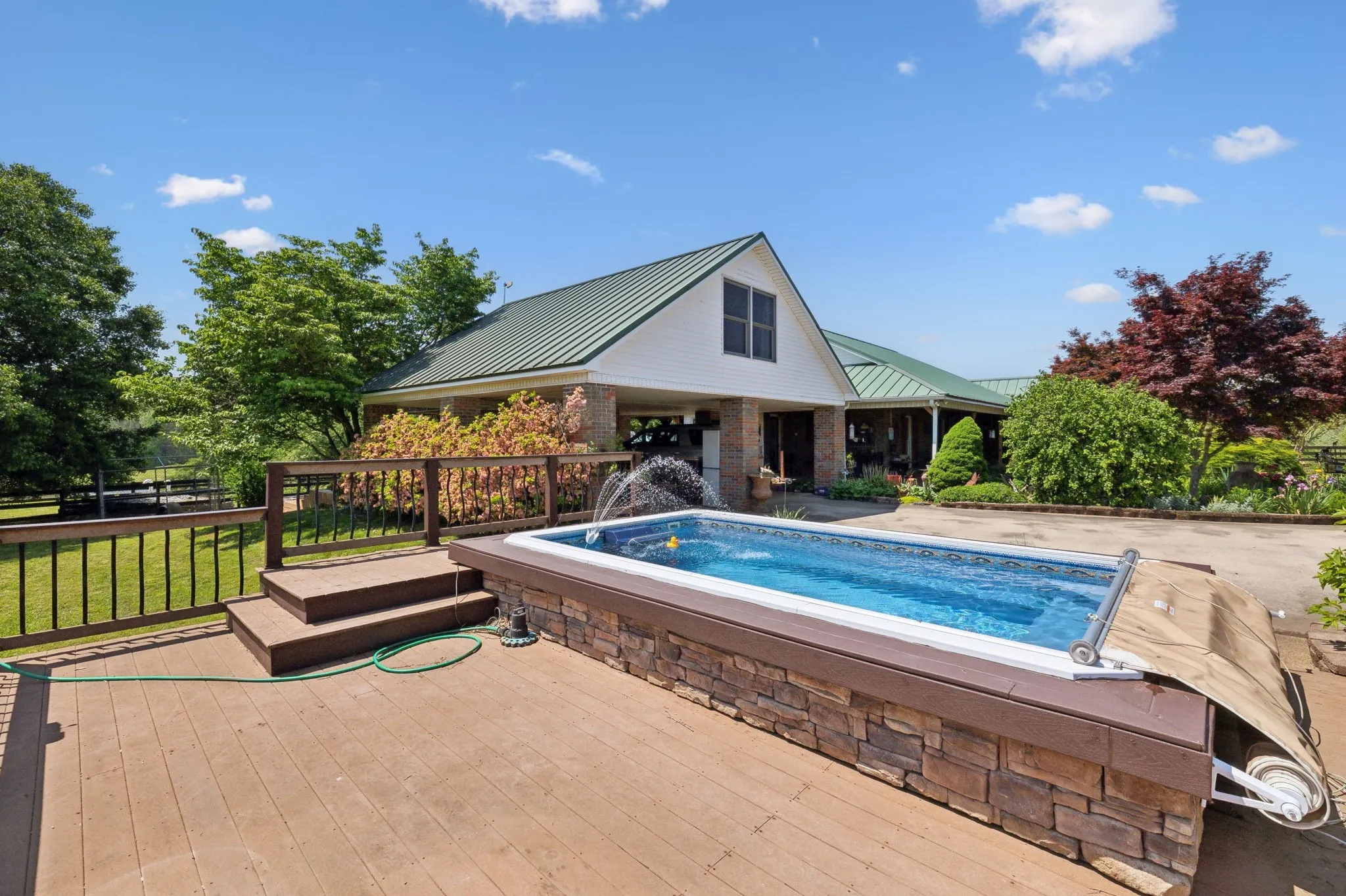 At the heart of the estate is a beautifully maintained 2,174 sq. ft. residence offering 3 bedrooms, 2 bathrooms, and refined finishes throughout. Enjoy the comfort and peace of mind from the propane-supplied whole-home generator. Unwind in the main suite’s spa-style bathroom featuring a custom walk-in steam shower, or take a refreshing dip in the 8'x14' endless pool with cover—perfect for fitness or relaxation. Above the covered carport, an 896 sq. ft. bonus room adds flexible living or office space.\n