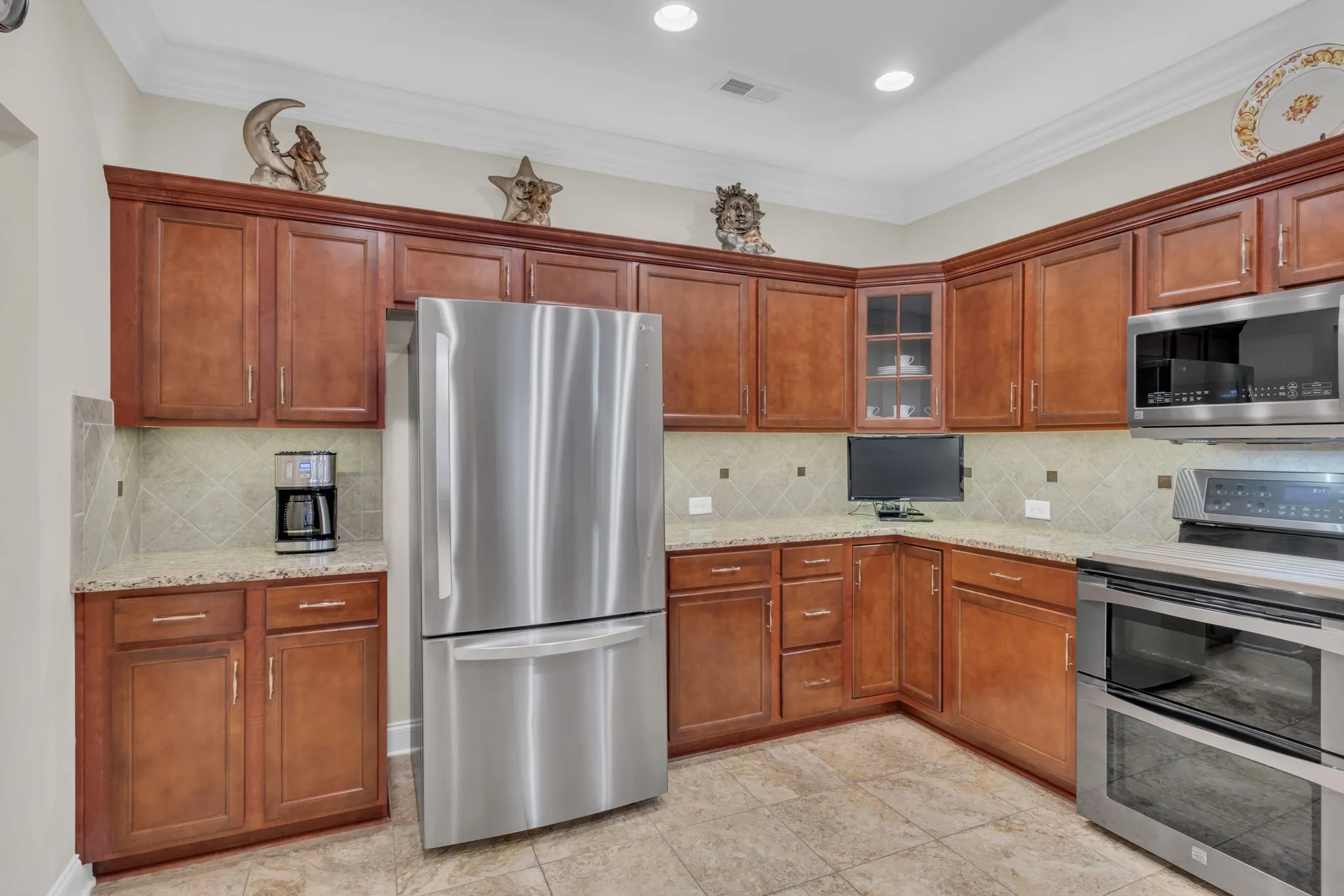 The spacious living and dining areas flow seamlessly into a stunning kitchen equipped with wonderful stainless steel appliances including range with double ovens, dishwasher, microwave and a new 26 CF refrigerator! There is under & over cabinet lighting, a Butler’s pantry and a doored pantry area!\n