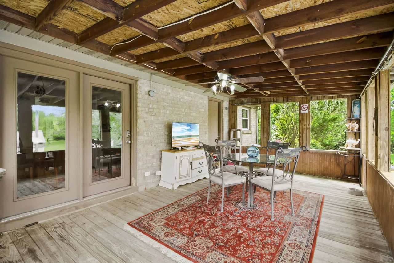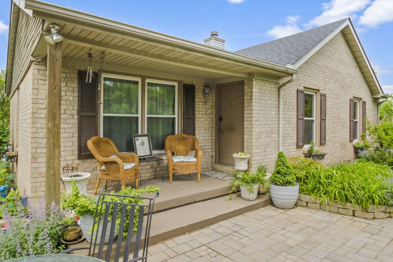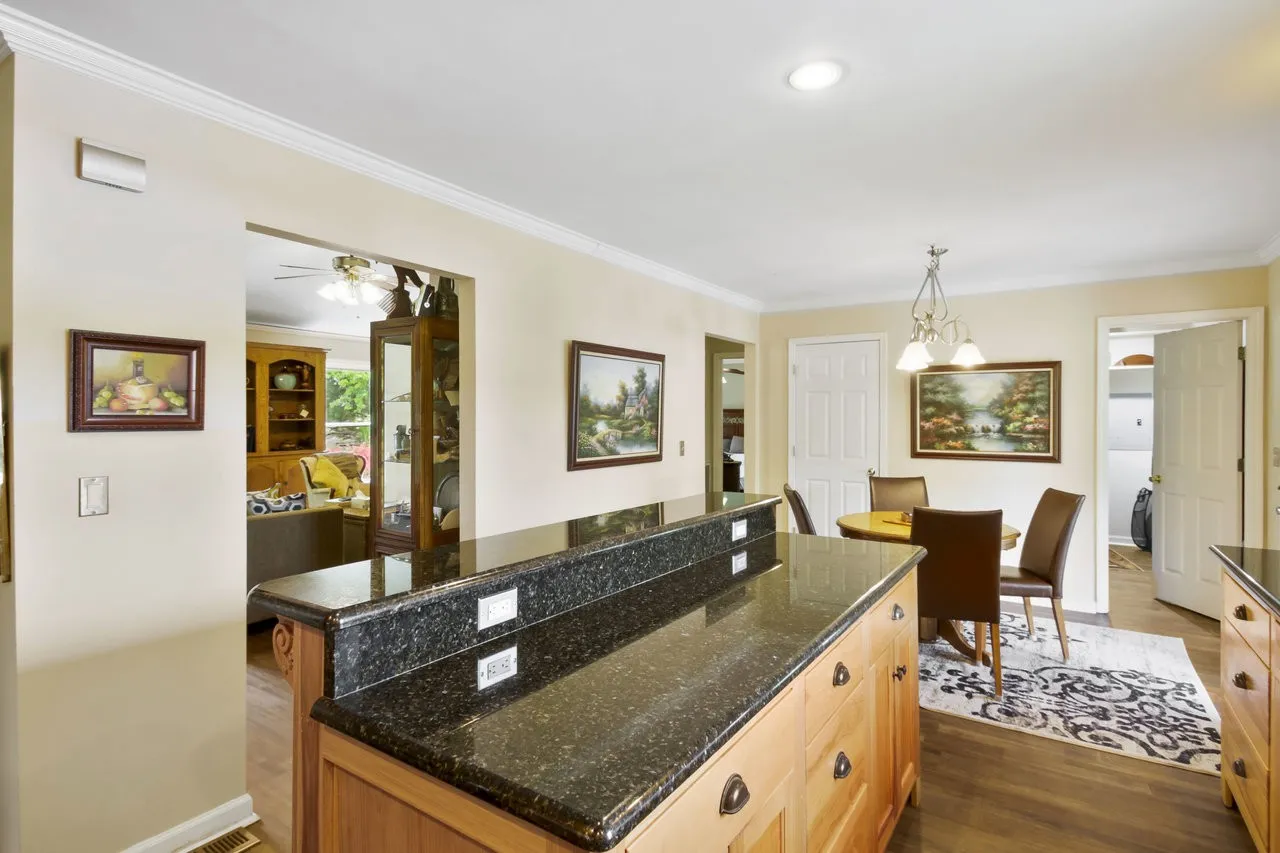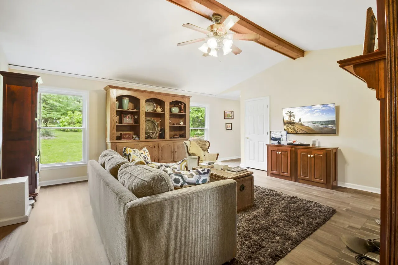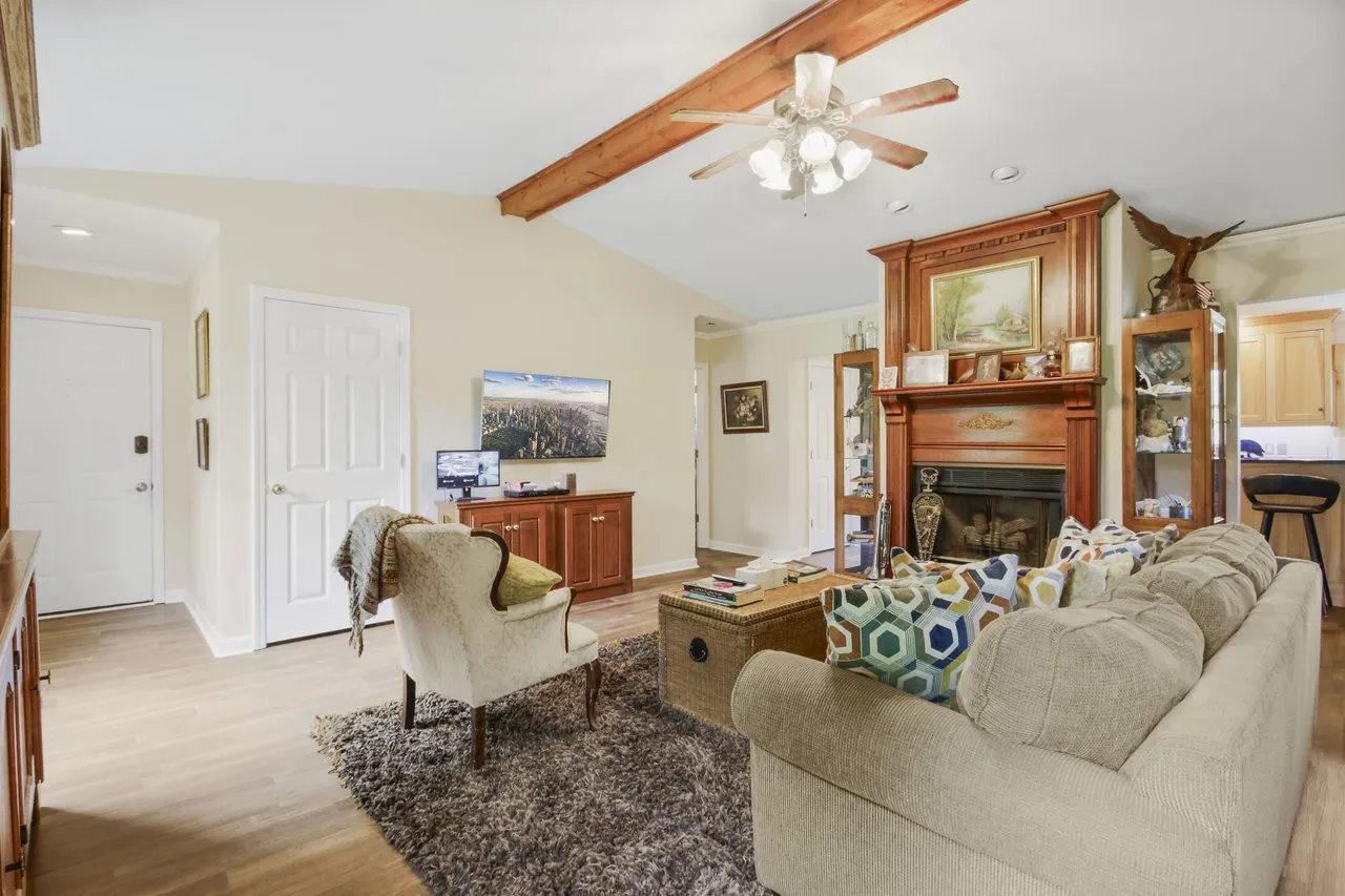 SELLER OPEN TO SELLER FINANCING WITH 20% DOWN. This beautifully maintained brick ranch offers the perfect blend of comfort, character, and natural beauty—all nestled on a peaceful, landscaped lot. Inside, the living room welcomes you with vaulted ceilings, exposed wood beams, and a cozy fireplace. Custom woodwork and built-ins throughout add timeless charm, while the spacious kitchen features solid wood cabinetry, granite countertops, stainless steel appliances, and a breakfast bar that opens into the dining area.