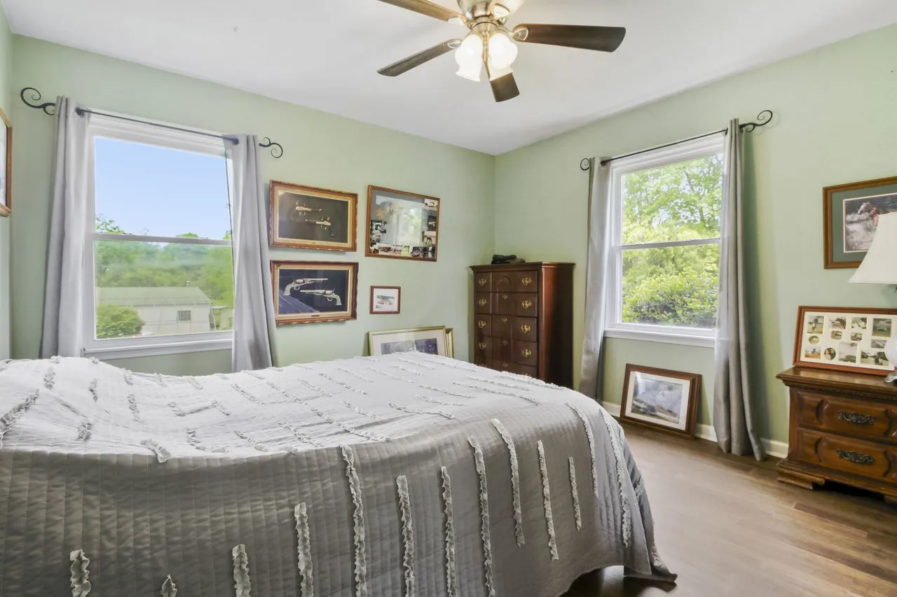 The primary suite is generously sized and includes dual closets along with a well-appointed ensuite bath featuring a granite double vanity, makeup station, and oversized walk-in shower. Two additional bedrooms provide flexible space for guests, a home office, or hobbies. The second full bath includes a tub/shower combo and a granite-topped vanity.