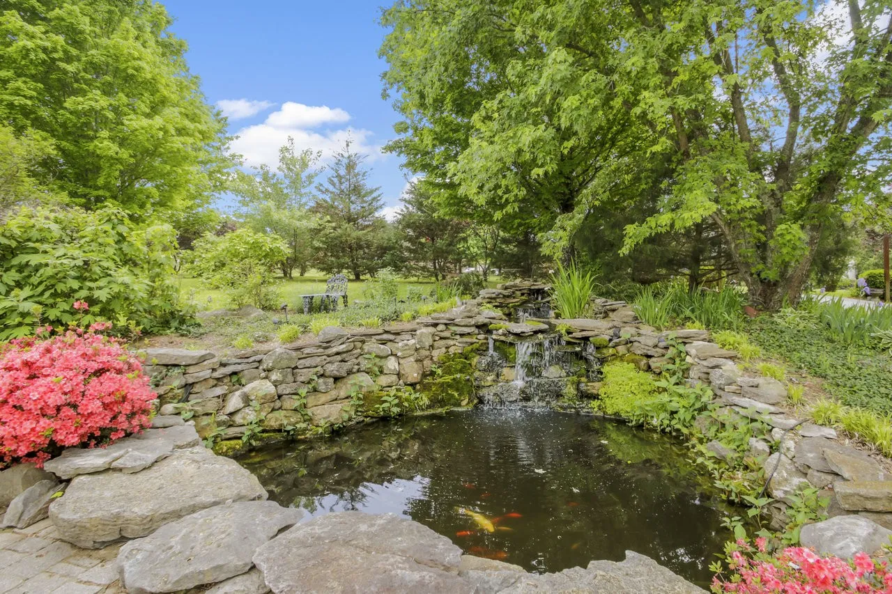 Step outside to your own private oasis—a beautifully landscaped backyard with a stone patio, koi pond with waterfall, and vibrant gardens that make for a tranquil escape. Mature trees offer privacy and shade, creating a perfect setting for relaxing or entertaining. Two large outbuildings on the property offer ample room for storage, hobbies, or workshop space. Additional features include limestone tiles flooring throughout, a separate laundry area, a covered front porch, ample parking, and a low-maintenance brick exterior.