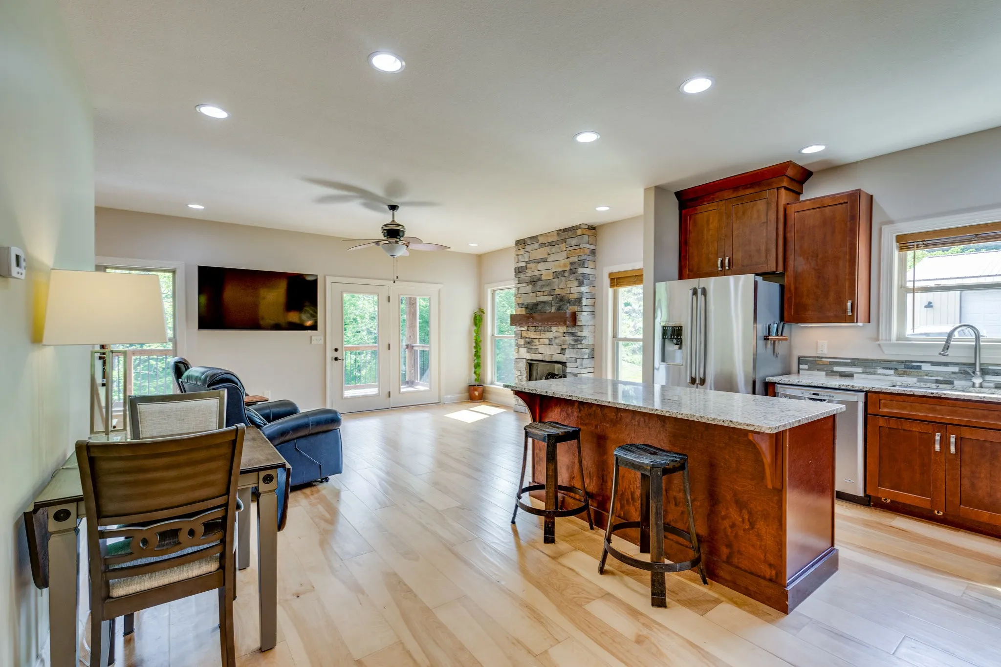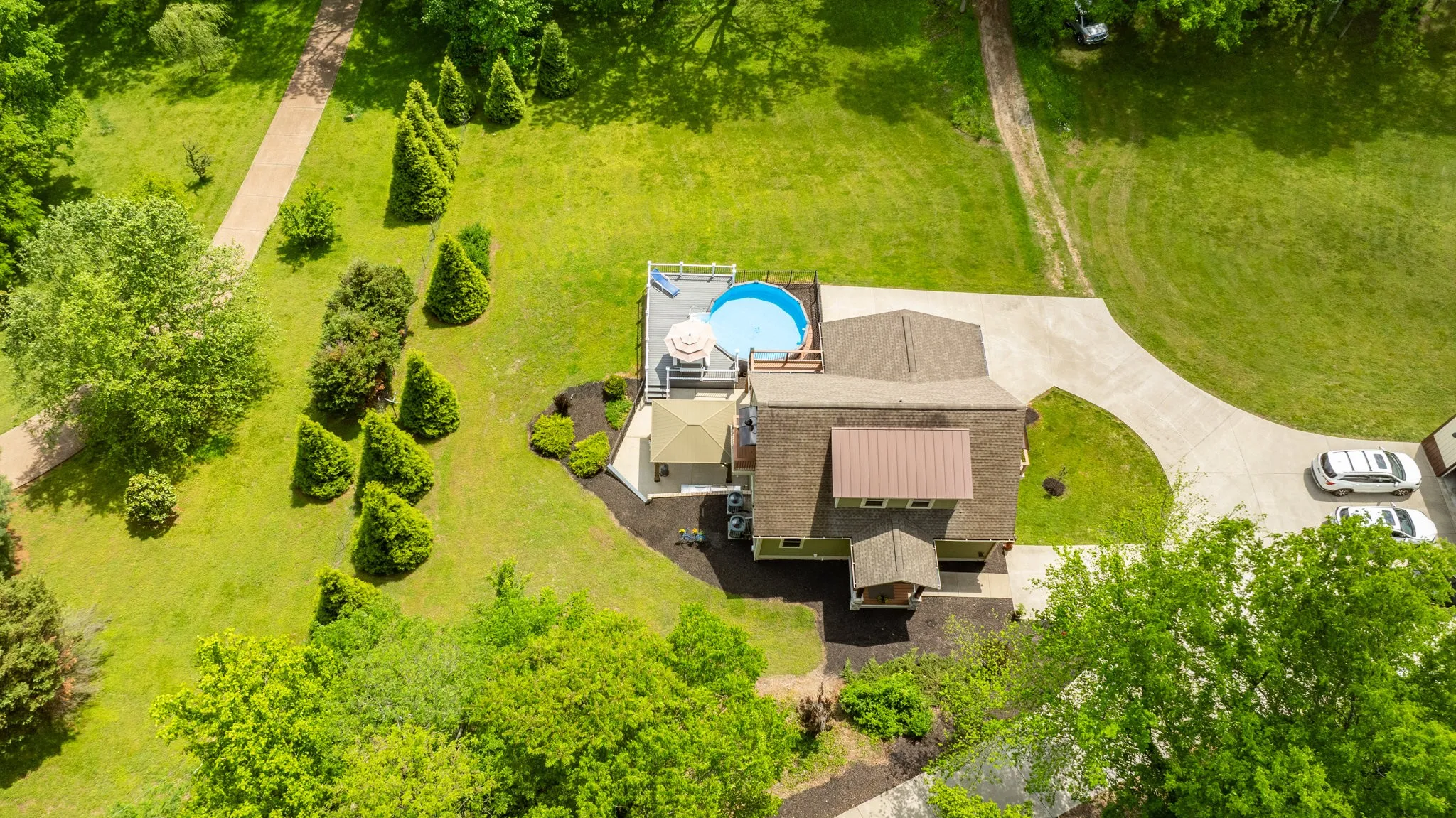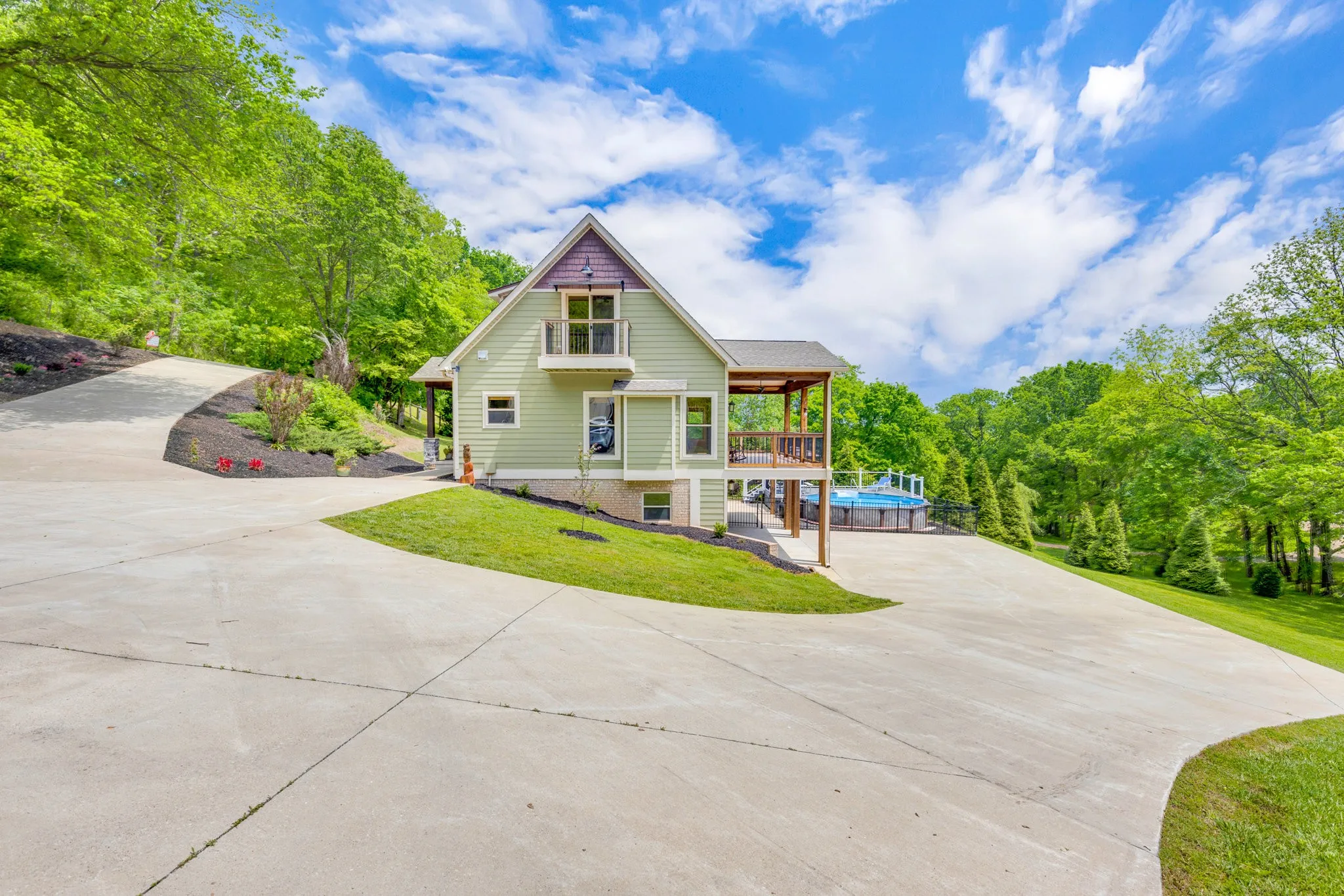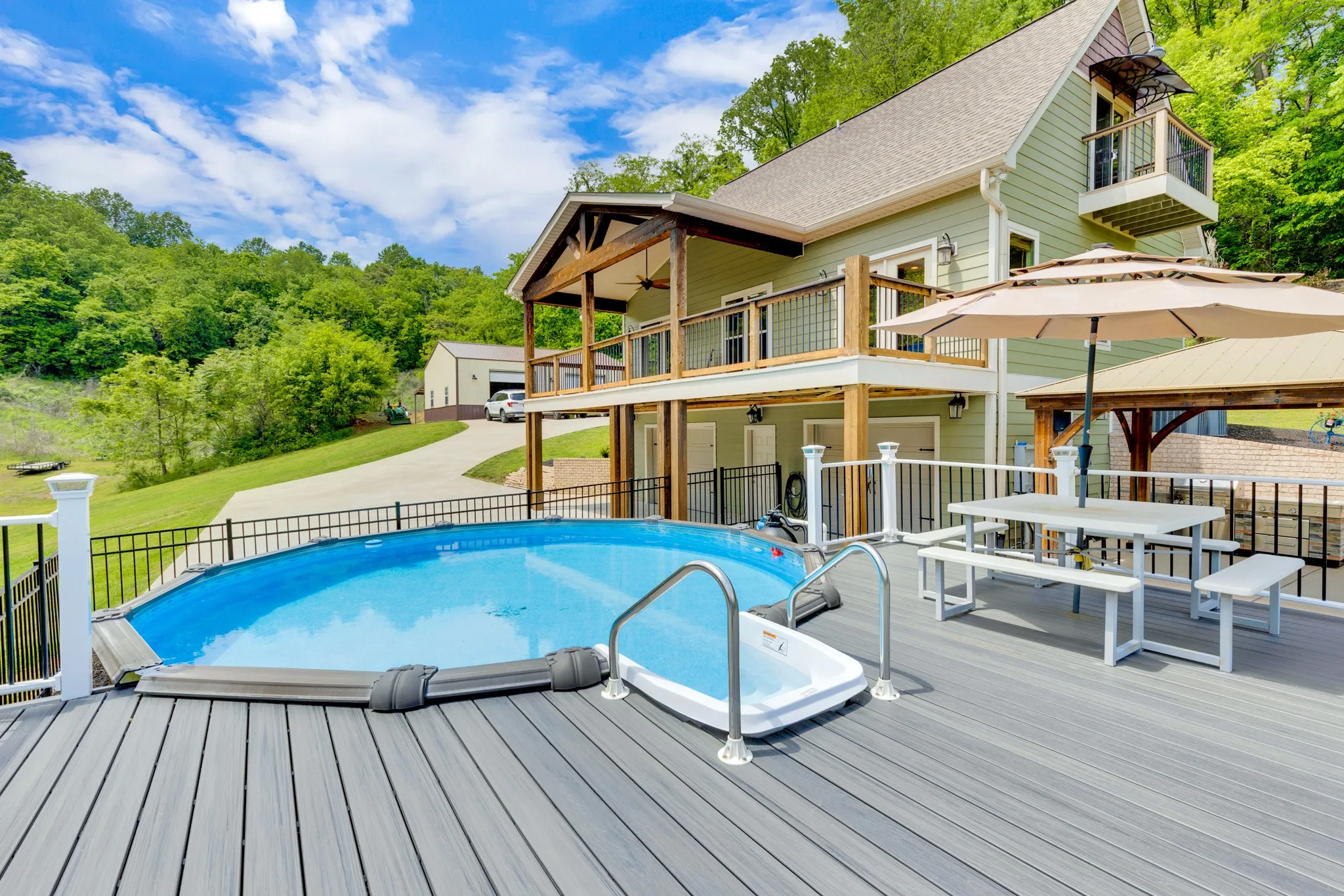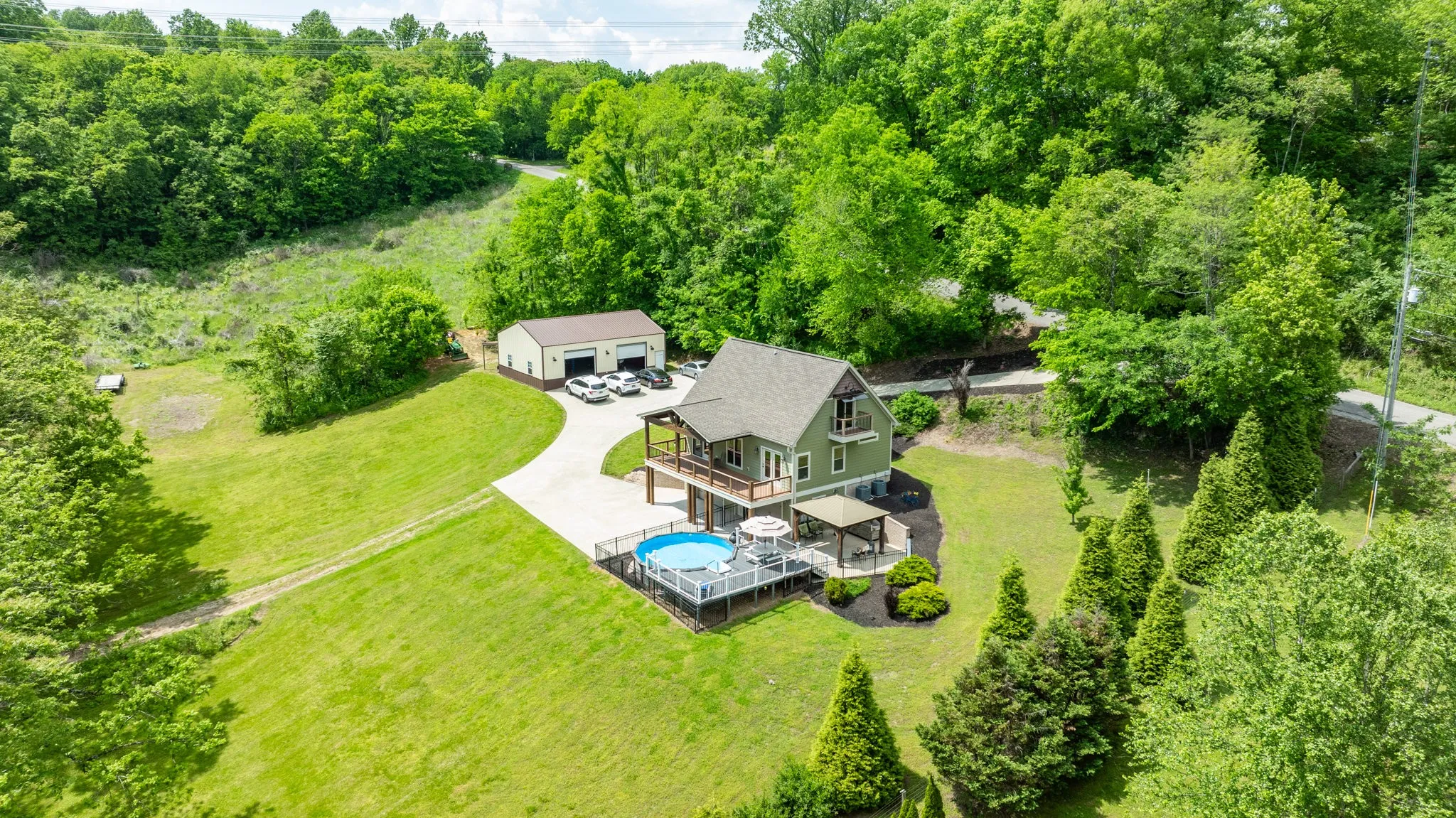 PRICE REDUCTION! Perched atop a scenic hill in highly sought after North Maury County, sits this custom 3 bedroom, 3.5 bathroom home on 8.58 wooded acres offering unparalleled views and modern elegance. The large primary suite located on the main level offers flexible living while 2 additional spacious bedrooms with juliet balconies, plus a full bathroom, occupy the upstairs.The lower level, originally designed for a 2 car garage, has been transformed into a flex space for additional living with a completed full bathroom and plumbed for an additional kitchen. A whole house water softener system is an additional benefit. Spanning approx 2400 sq ft.,this home combines sophisticated design with practical features for the ultimate living experience both indoor and outdoor. The gourmet kitchen features granite countertops, a large center island with additional seating, stainless steel appliances and a reverse osmosis water filtration system for pure drinking water. Additional features include hardwood floors, a stone accented gas fireplace and dual-pane windows for energy efficiency. A true outdoor oasis featuring a 10×36 covered TREX deck off the family room is a place of refuge for enjoying the incredible views of the peaceful and serene backdrop. The built-in grill in the patio area compliments the fenced TREX deck around the sparkling above ground clear blue mineral system pool. The detached massive 30×40 workshop features an optional Car-Lift and lean-to, perfect for hobbyists or professionals. Enjoy breathtaking sunsets and gaze at the stars from your private hilltop haven and with NO HOA! Enjoy abundant wildlife on your own property. Entertain effortlessly with premium outdoor spaces and work or create in the expansive workshop. An easy commute to I-840 and I-65 as well as all the conveniences that Spring Hill has to offer. The home is a rare blend of luxuary, functionality and serene surroundings. Country living but City close.