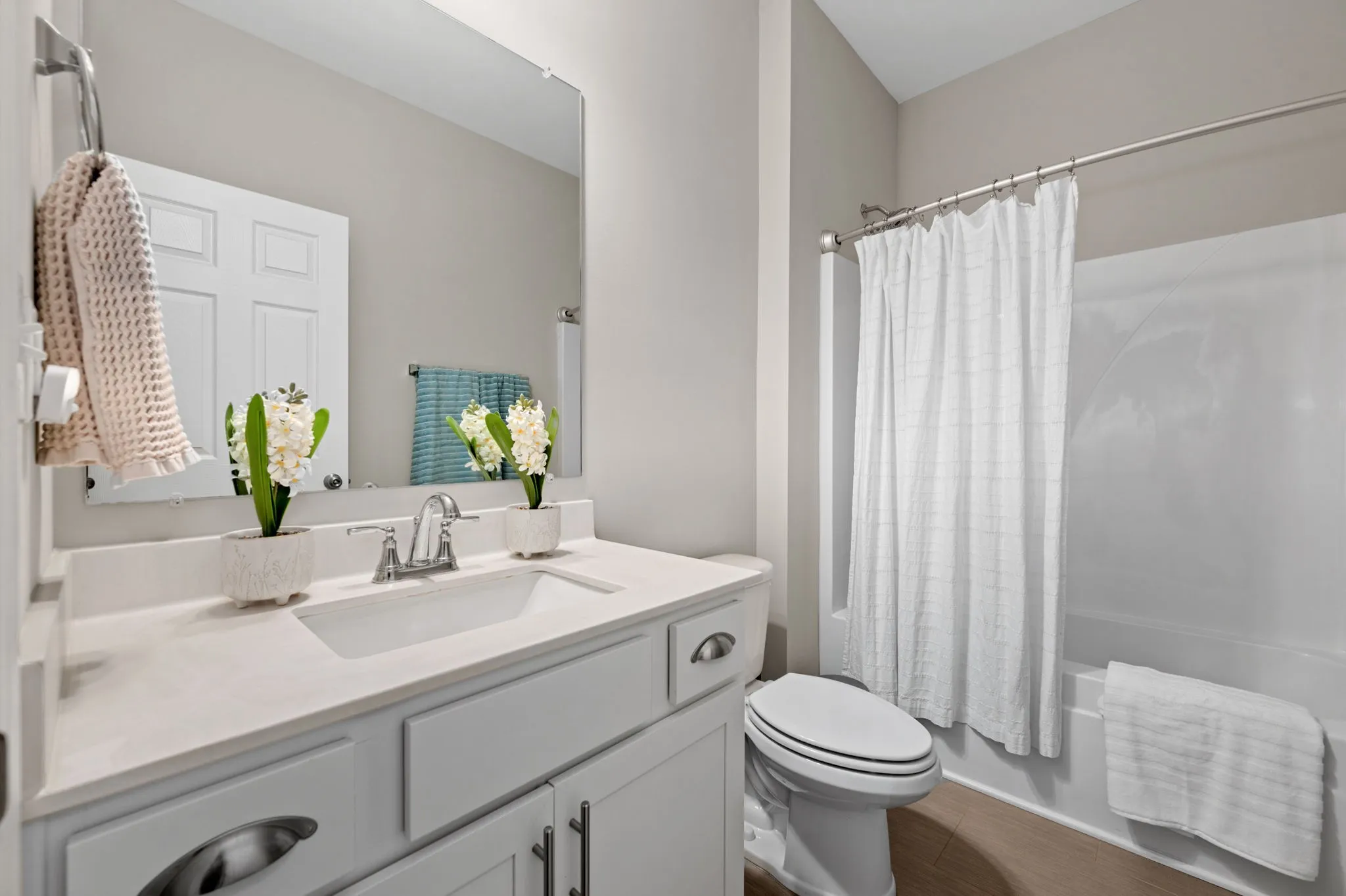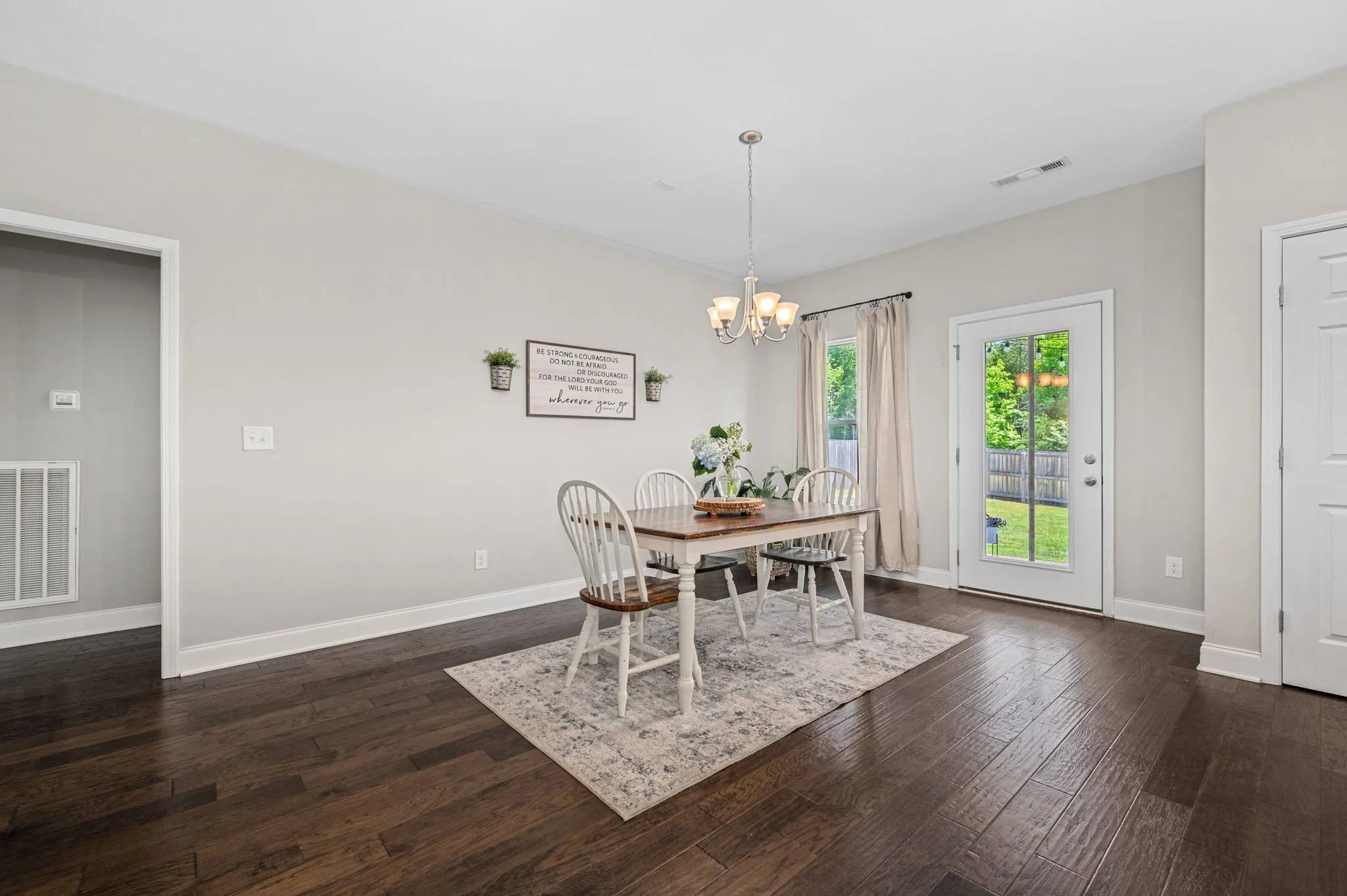 Open plan with tons of hardwood. Convenient one level living. Fresh paint, quartz counters, tile in the wet areas including the kitchen backsplash. Your primary bedroom has a private bath with double vanities & a large walk-in closet. The spacious walk-in laundry room has a touch of flair with its chair rail accent. This lovely home backs up to a treeline and includes a covered back porch and privacy fenced yard.
