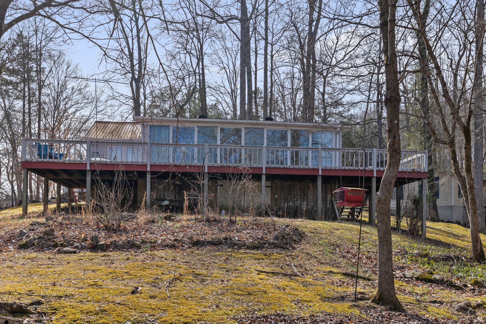 PRICE IMPROVEMENT…… This one of a kind peaceful lakeside retreat with panoramic year round Lake Views. Enjoy breathtaking views, with rare lake access at the point of Potts Camp. You can swim or fish from your property. Property has 4 lots being sold as one. This is a unique opportunity for and AirBNB, Multi Family retreat, Fish Camp or build your DREAM HOME. Enjoy a short walk to the lake shore on your private 4 ft wide path to the water, perfect place to launch your kayak or paddle board. Trail ends in the lake with gravel bar for easy access. Property has main house with 3 bedroom 2 bath, Guest house has one bedroom and 1 full bath, man cave, Indoor BBQ Pit with full bath and large detached shop with 12 ft door and two car covered carport, perfect for boat storage. Shop has bathroom and separate septic system. Your own private retreat with lots of wildlife Minutes from Pates Ford Marina by boat or car. Property is being Sold as is