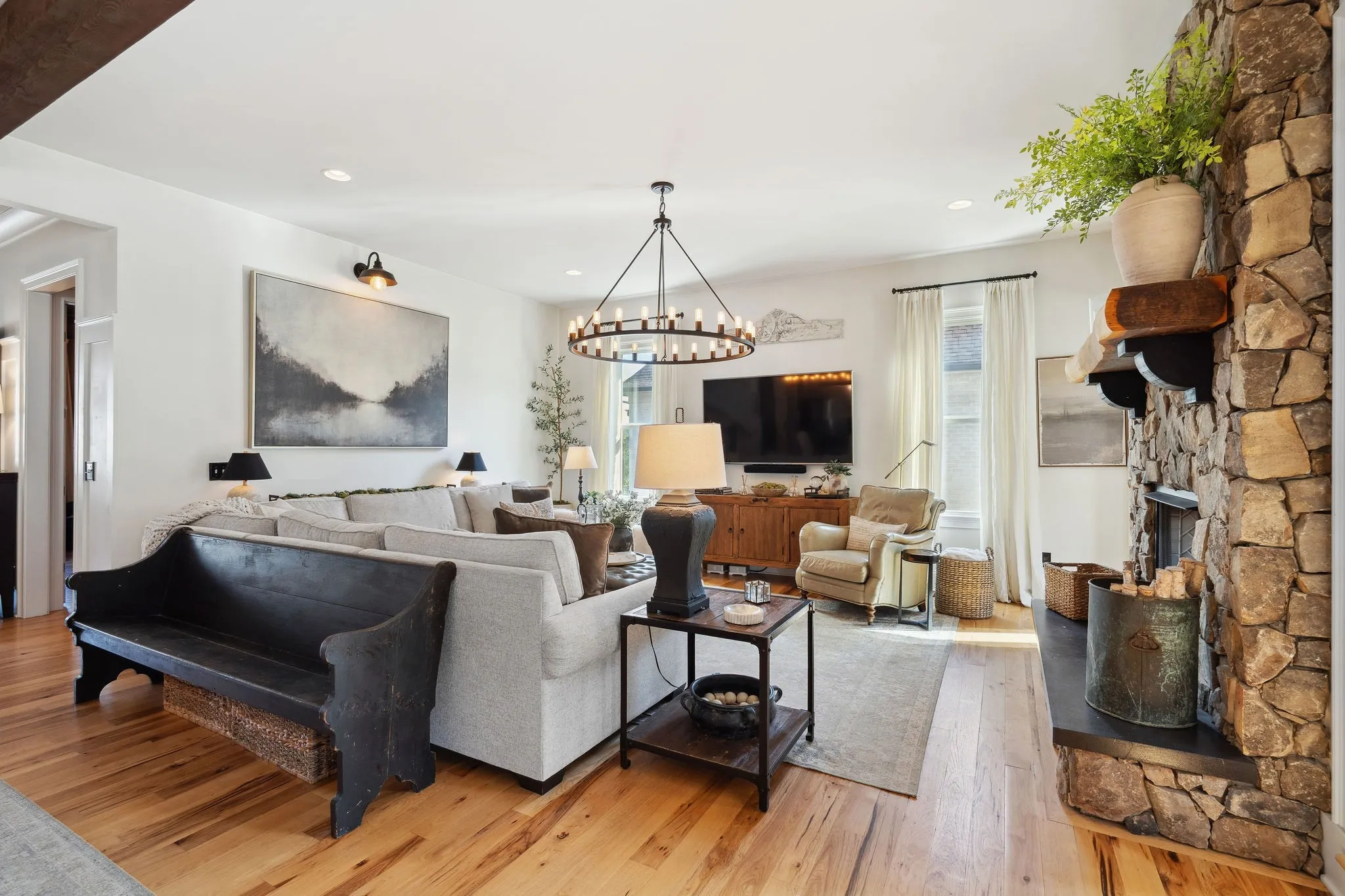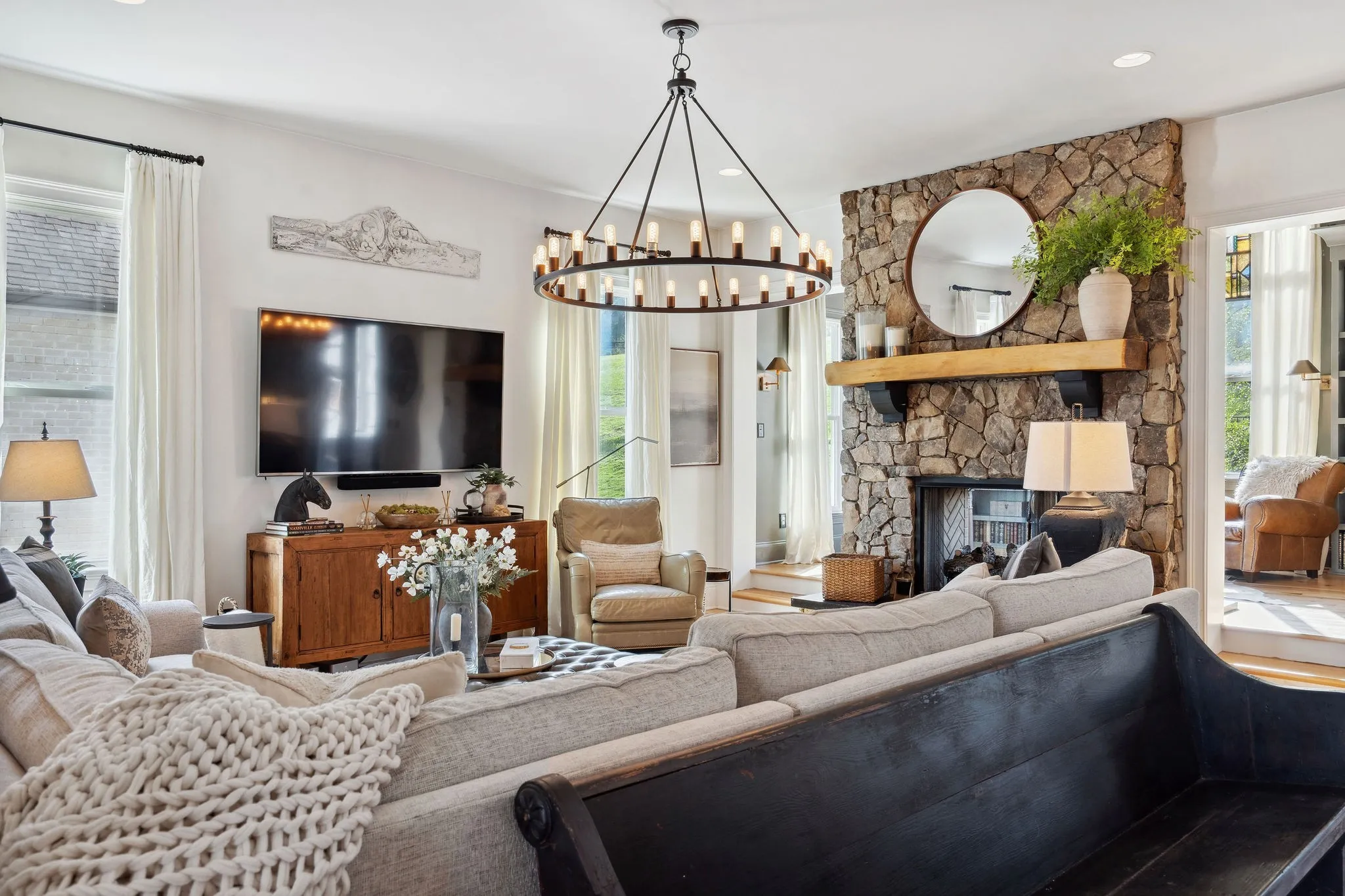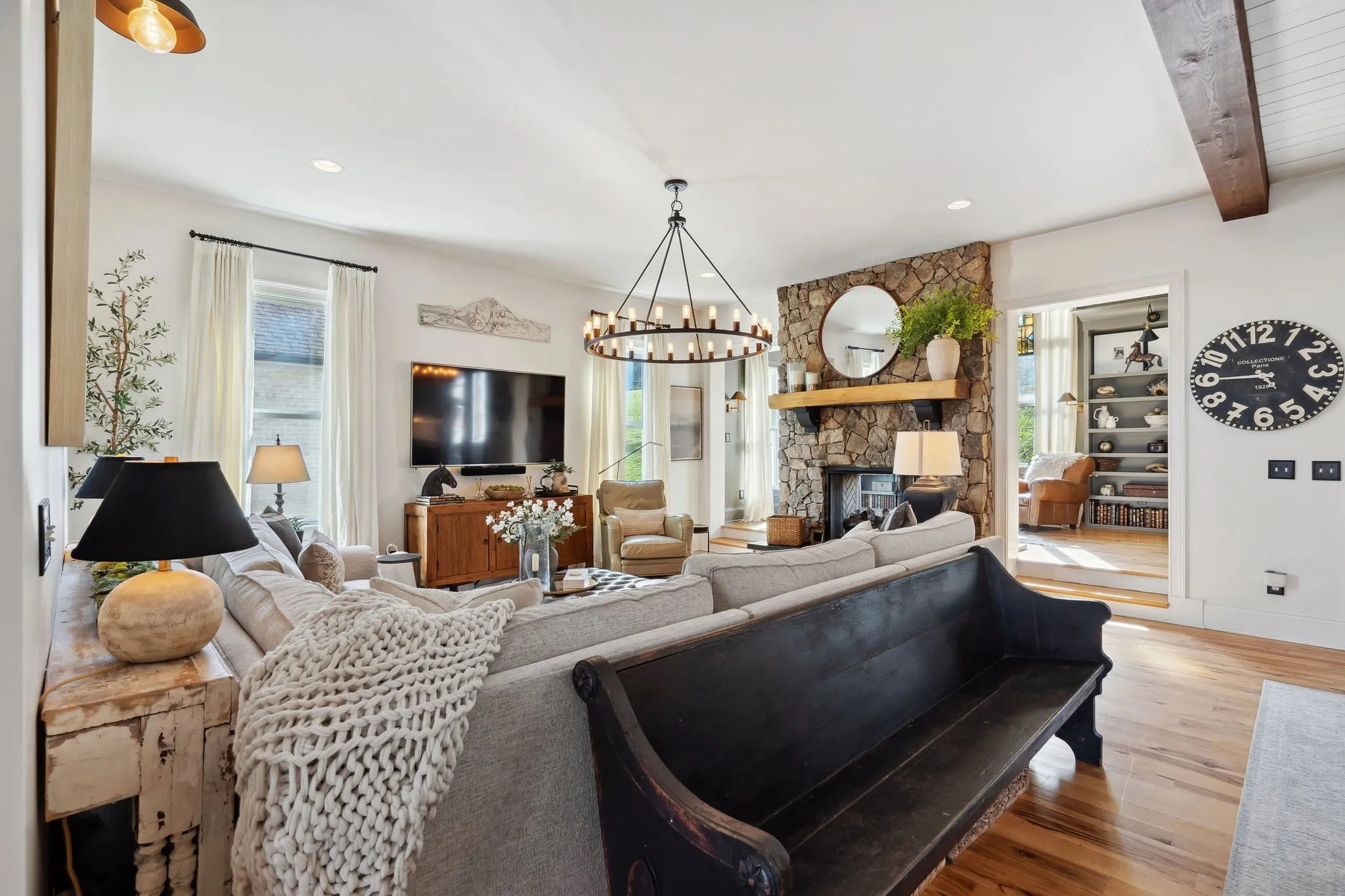 +"PublicRemarks": "Step into timeless sophistication and modern comfort in this beautifully crafted 5 bedroom/4 bath home designed by renowned architect Preston Shea. With stunning architectural detail and thoughtfully custom designed spaces, this home exudes charm, elegance, and livability at every turn. A welcoming hearth room/den seamlessly connects to the great room, both anchored by a striking double-sided fireplace with new walnut mantels and stylish gas logs. A rustic brick accent wall and elevated barn door add character to a private, tucked away office. The primary suite is a sanctuary of style, boasting a vaulted, beamed ceiling and dual walk-in closets. The luxurious primary bath features separate vanities and a spa-like atmosphere. The heart of the home is the open concept living area, where the upgraded kitchen impresses with leathered granite countertops, designer backsplash, and high-end appliances. Perfect for entertaining or quiet evenings under the stars, newly installed glass walls provide beauty and closure to a sunroom—complete with a warming fireplace. Every bedroom in this home features a walk-in closet and direct access to a full bath, while the media/game room offers a walk-behind beverage bar, wine fridge, and space to unwind or entertain. The remodeled laundry room with sink, storage galore, and an oversized 3-car garage (with a pedestrian door to the backyard) add daily convenience. Additional features include: new installed hardwood floors, whole-home generator with cold weather upgrade; designer style lighting and custom paint; upgraded media/game center; antique French doors, surprising nooks and bookcases throughout; a fenced backyard; and enhanced landscaping and flowering vegetation. Perfectly located near Cool Springs, Franklin, Brentwood, and Green Hills, this home offers the ideal blend of privacy and accessibility. It looks and feels like a bespoke-designed home, full of thoughtful touches and unexpected surprises."