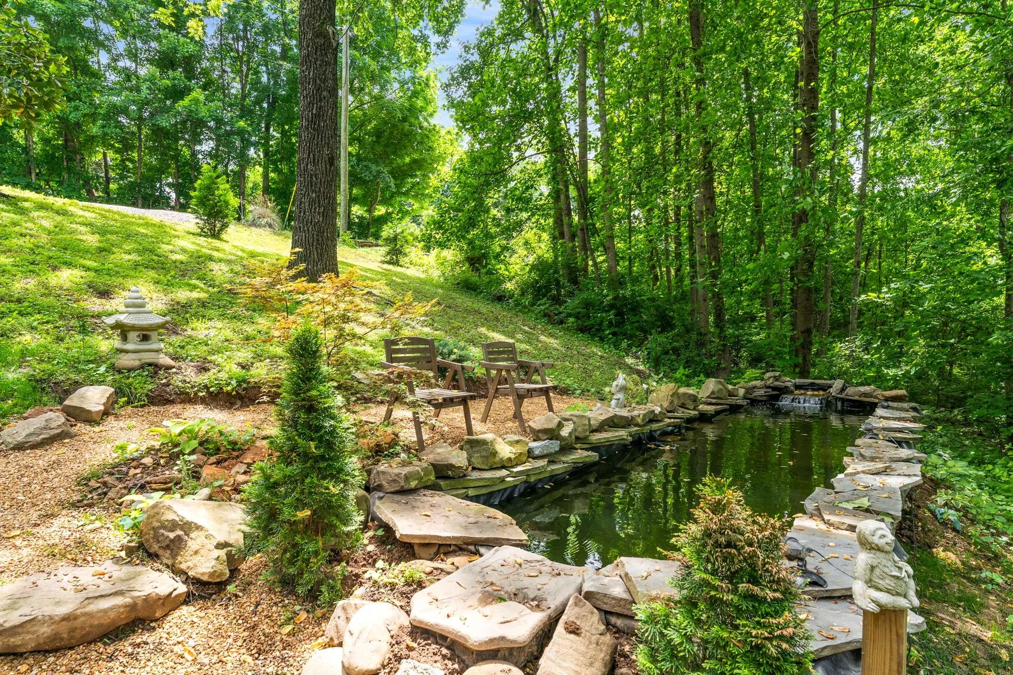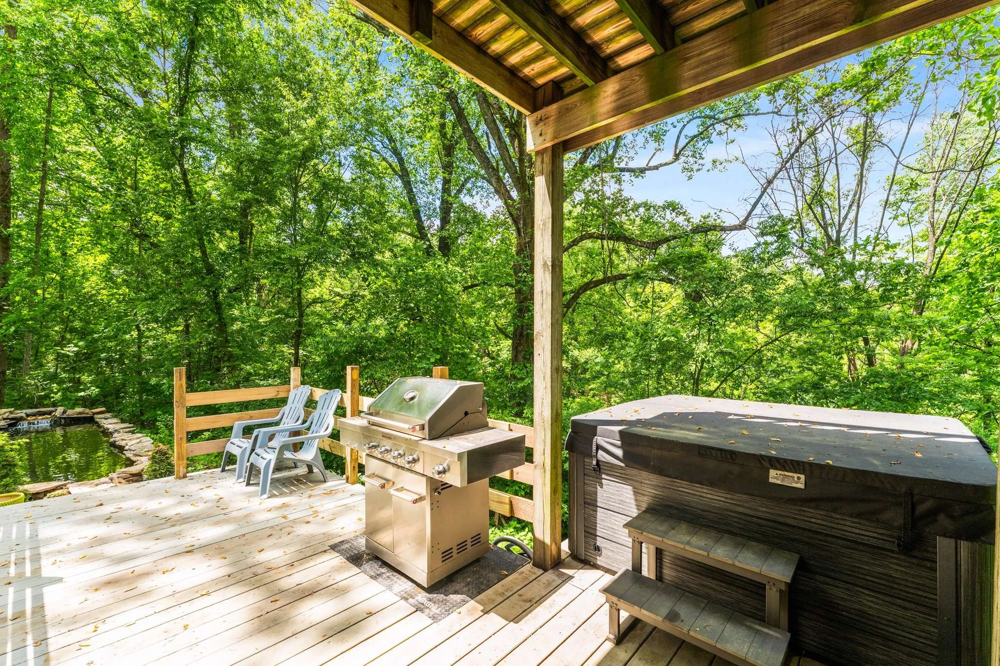 Sellers are offering $5000 towards rate buy down or closing cost. Nestled among mature trees in the scenic hills of Goodlettsville, this picturesque home offers the perfect blend of privacy, nature, and comfort. Set on a full acre, it features a beautifully finished walkout basement with a large rec room, full bathroom, and closet – ideal as a guest suite, home office, or flex space tailored to your lifestyle. The property features a welcoming front porch shaded by towering hardwoods, ideal for unwinding with serene views. Step inside to discover beautiful hardwood floors throughout and a spacious open-concept layout connecting the living, dining, and kitchen areas. A cozy wood burning fireplace anchors the living room, which opens onto a raised deck – perfect for summer BBQs or peaceful evenings with nature as your backdrop. Listen and enjoy the beautiful pond or soak in the relaxing hot tub. The kitchen boasts an island, ample cabinet and counter space, and a charming, wooded view from the sink. All kitchen appliances are included. A convenient powder room serves guests on the main floor. Upstairs, you’ll find generously sized bedrooms with walk-in closets and a full bath featuring a double vanity. Additional features include a 2.5-year-old durable metal roof. Don’t miss the chance to own this unique forest hideaway!
