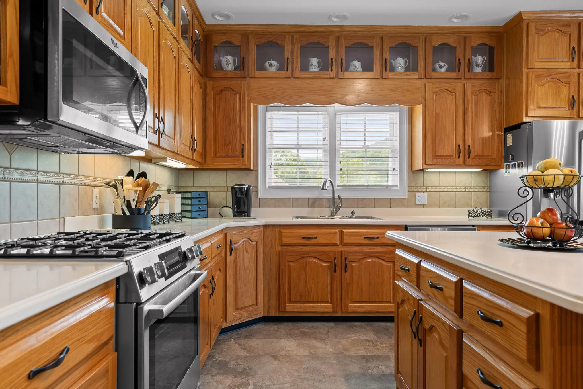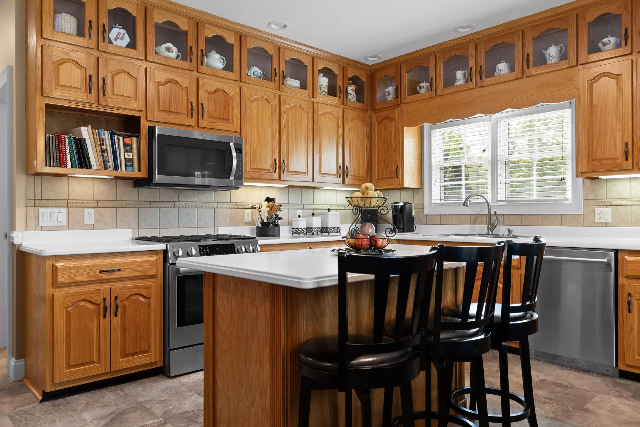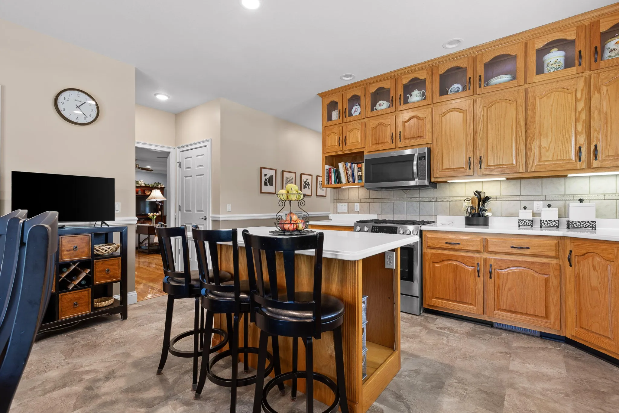 Inside, high-end finishes greet you at every turn, including solid first-grade white oak hardwoods, premium flooring, recessed lighting, and programmable thermostat zones. The large eat-in kitchen features custom white oak cabinetry, an island bar, chair rail trim, and upgraded appliances including a Bosch dual fuel range and stainless steel Bosch dishwasher.\r\n