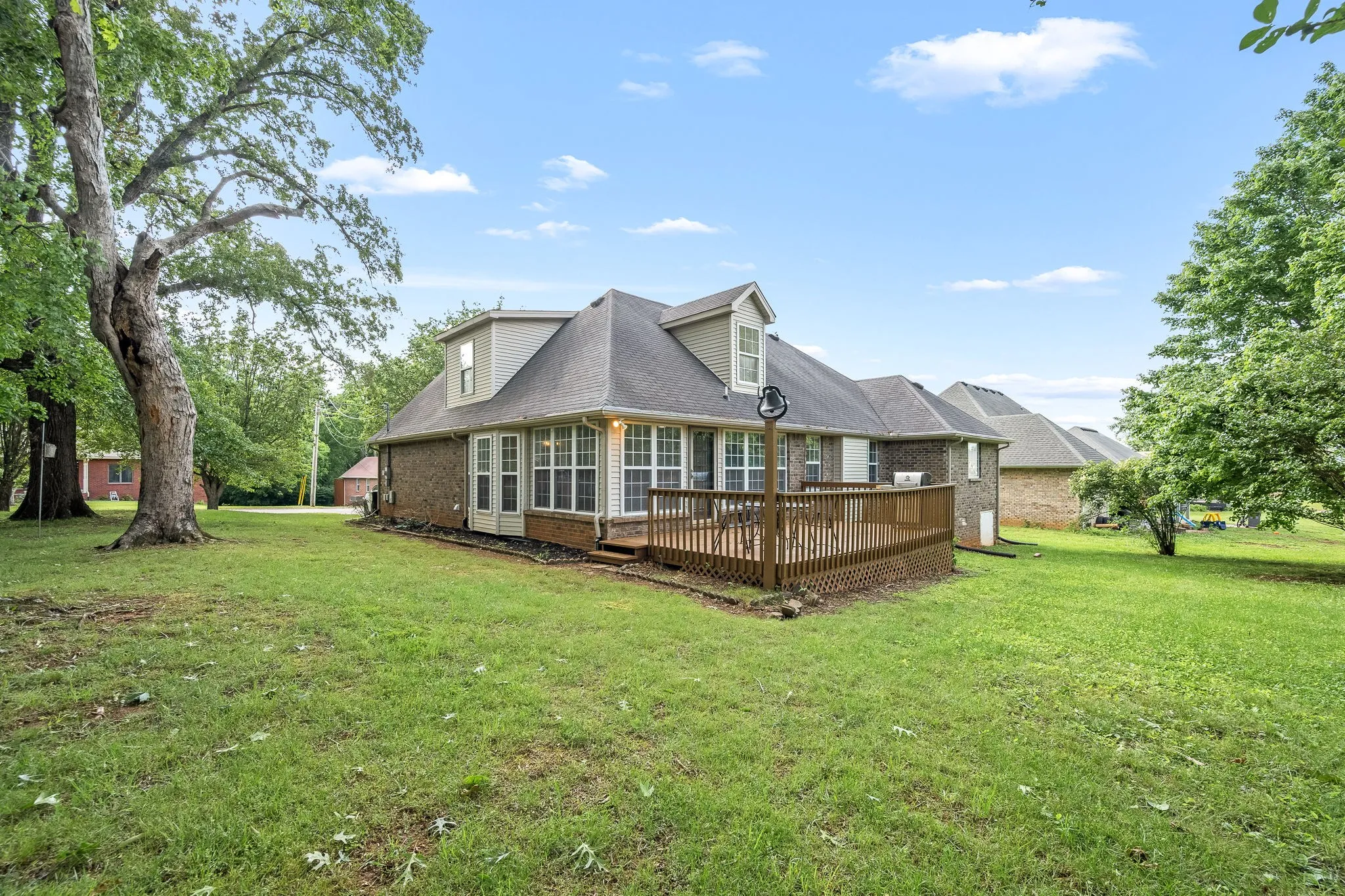 Beautiful 3BR, 3BA home on a spacious lot. New carpet, fresh paint and updated lighting! Cozy up to the fireplace in the living room or relax in the den/sunroom boasting lots of natural light. 2BR’s and 2BA’s on the main floor including your primary with a spa-like bath. Upstairs features the third BR, it’s own full bath and two flex spaces. There is a large deck off the back and a not to miss storm shelter in the garage! This home is MOVE IN READY.