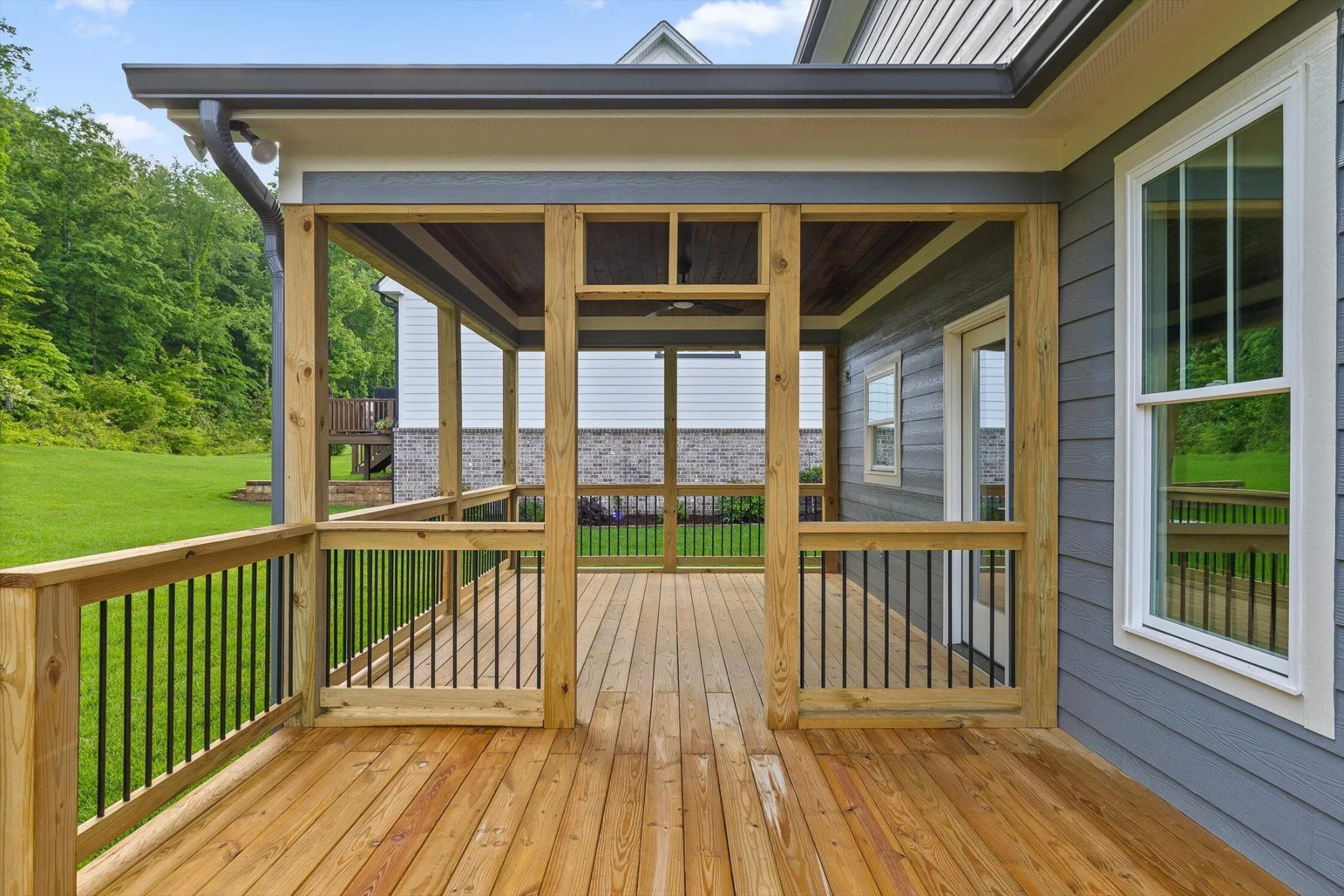 Enjoy outdoor living on covered porches in the front and back, both finished with tongue-and-groove pine ceilings. The back porch includes a ceiling fan and opens to a connected deck overlooking the spacious, irrigated backyard—perfect for quiet mornings or evening gatherings. Additional features include an energy-efficient HVAC system with a smart thermostat, three-panel garage doors, and a two-car garage.\r\n