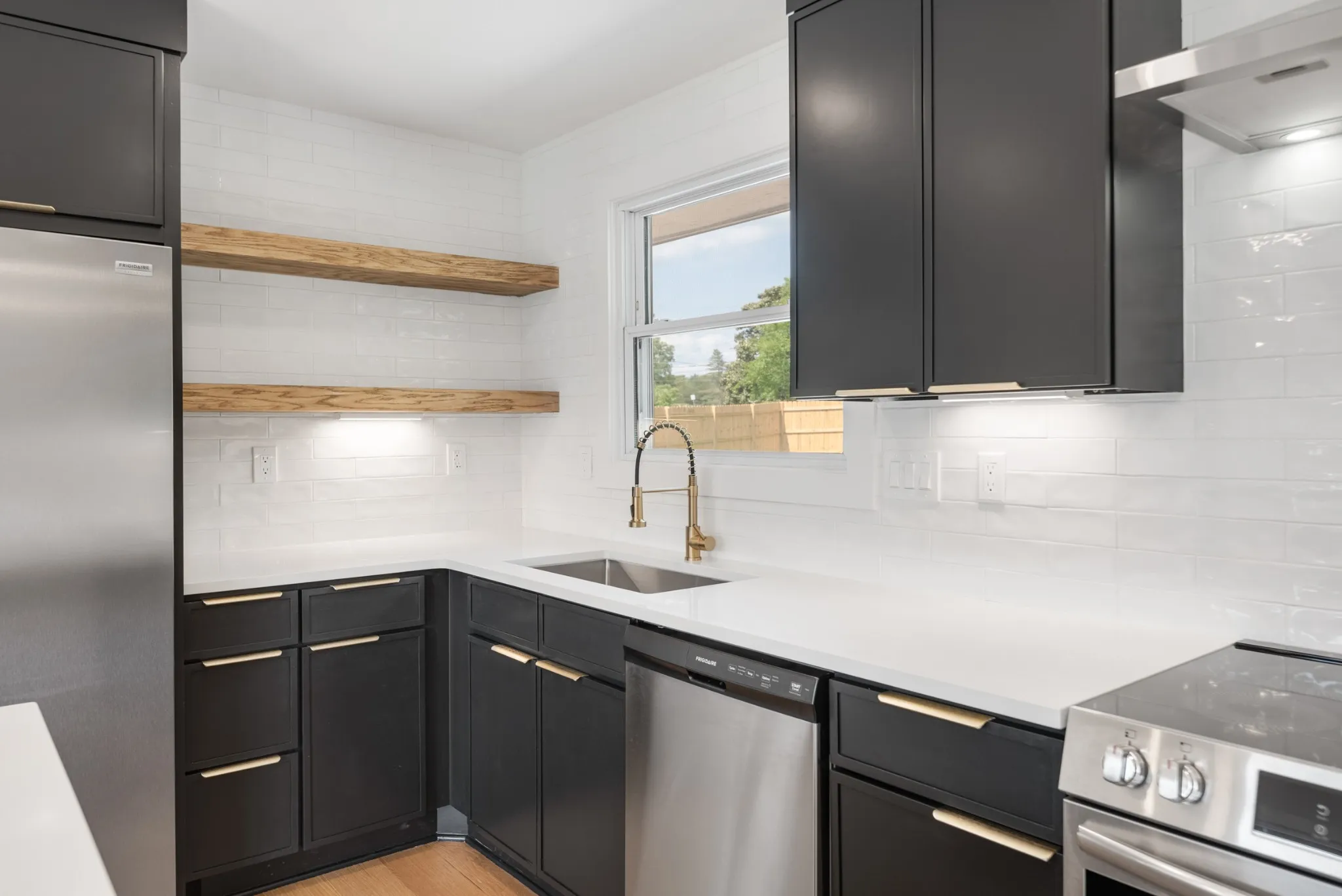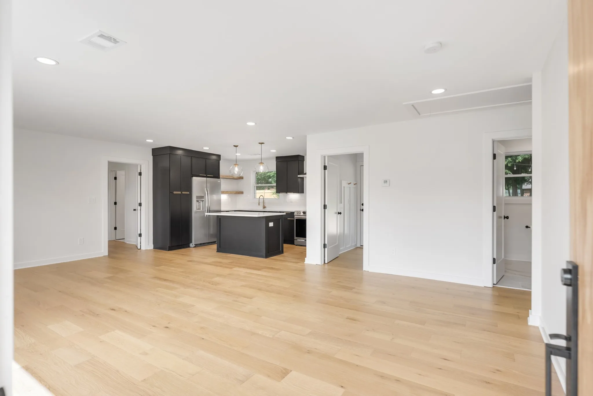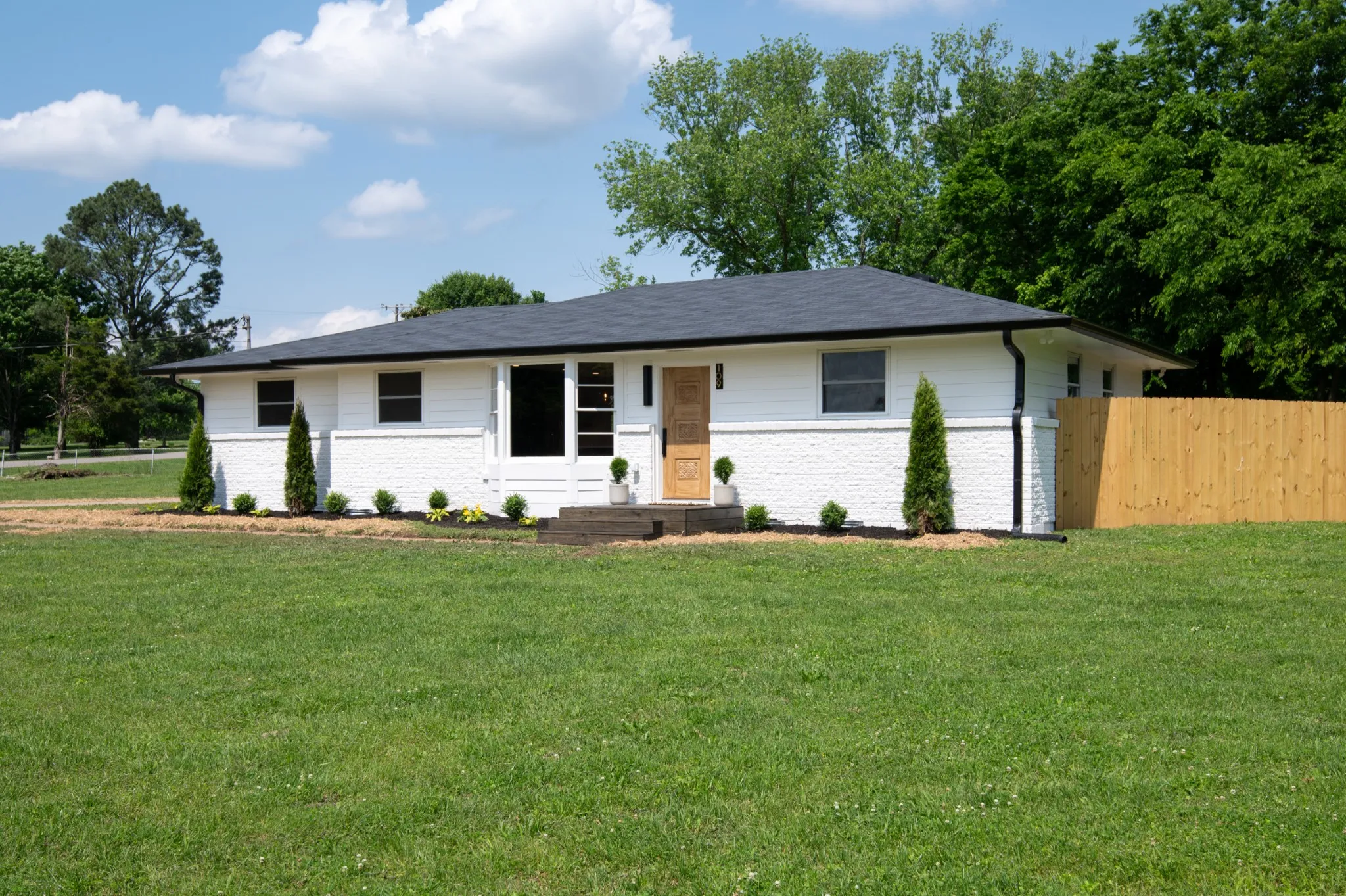 Mid-century charm meets modern living with this beautifully renovated 1950’s ranch home, centrally located 15 minutes outside of downtown Nashville. From the moment you walk through the original wood front door, you’ll know this home is special. The open concept living area boasts lots of natural light with a bay window overlooking the front yard, a new kitchen with slim shaker cabinets with pantry, open shelving, quartz counters, tile backsplash and new stainless appliances. Split floor plan provides a private primary suite with walk-in closet and new bath with tile floors and shower with frameless glass and a double vanity with quartz. Generously sized secondary bedrooms and hall bath with new tub, tile and vanity with quartz. Upgraded finishes like LED recessed lights, wide-plank hardwoods, new hardware, fresh paint, new doors, storage and more throughout. Mud/laundry room leads to rear driveway entry in fully fenced backyard with detached 480 sq.ft. garage + workshop with carport. The .71 acre corner level lot offers mature trees, plus, a new stone patio with exterior firepit and overhead string lights that’s ready for summertime entertaining. New landscaping in the front completes this move-in ready home that’s ready for it’s next owner!