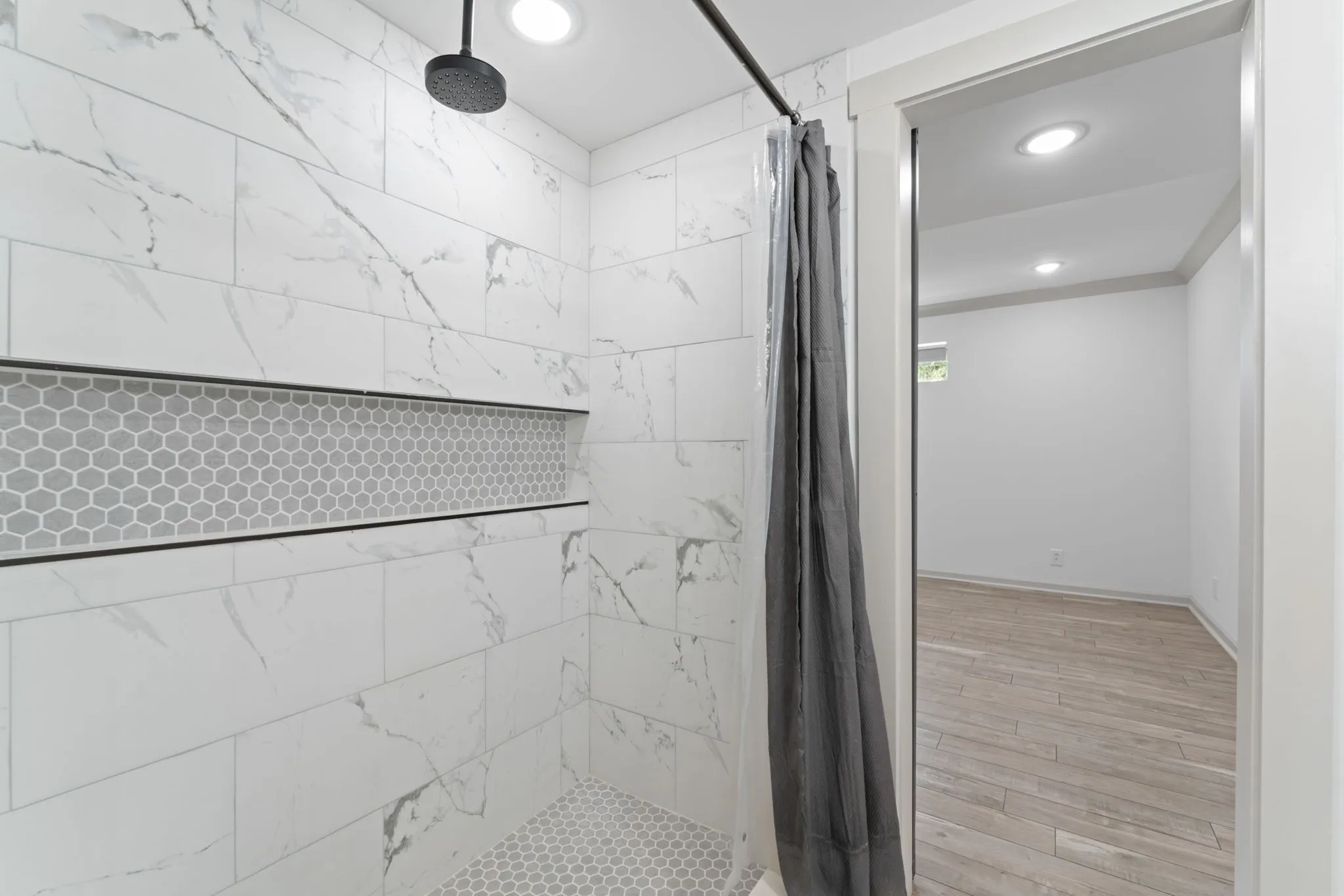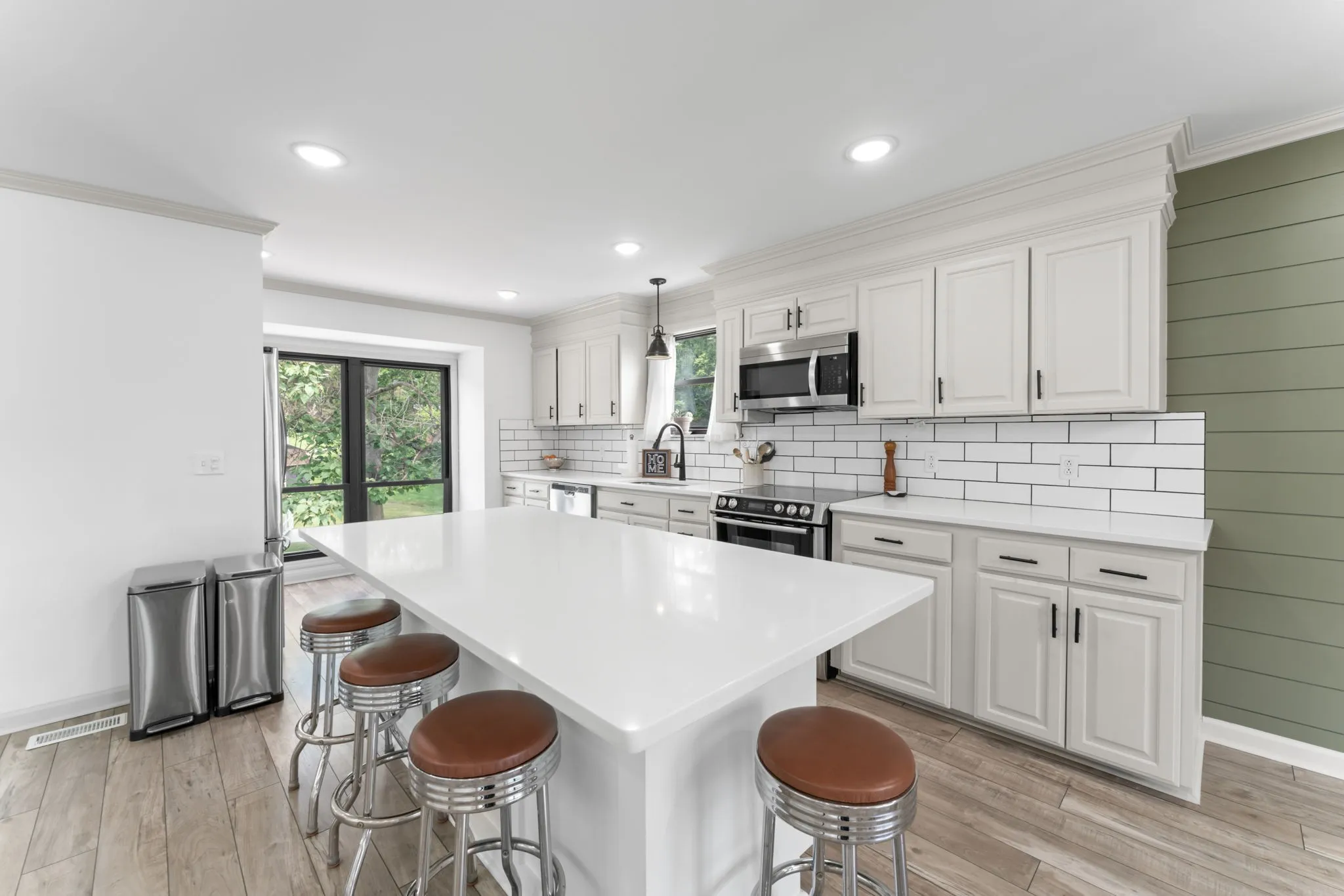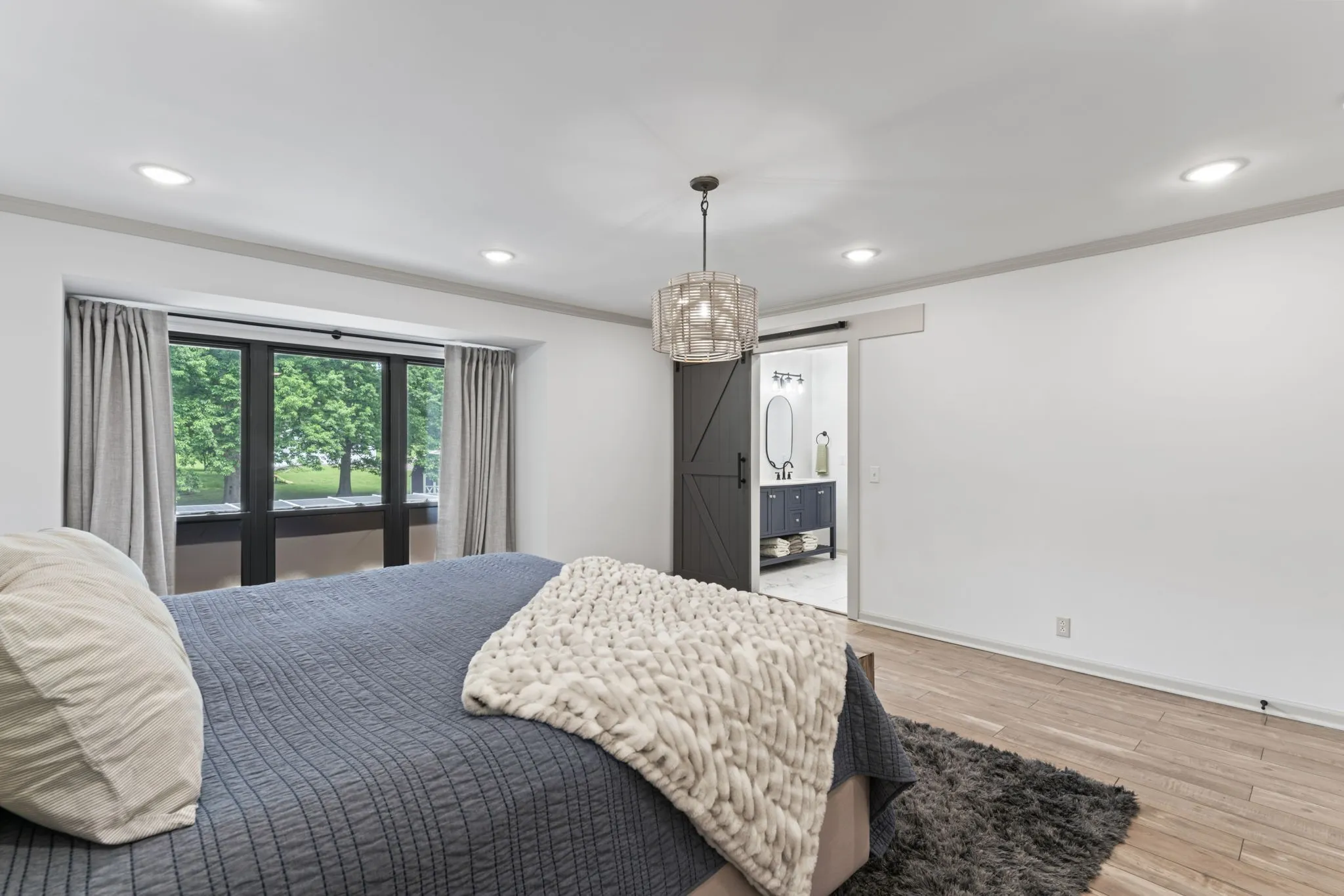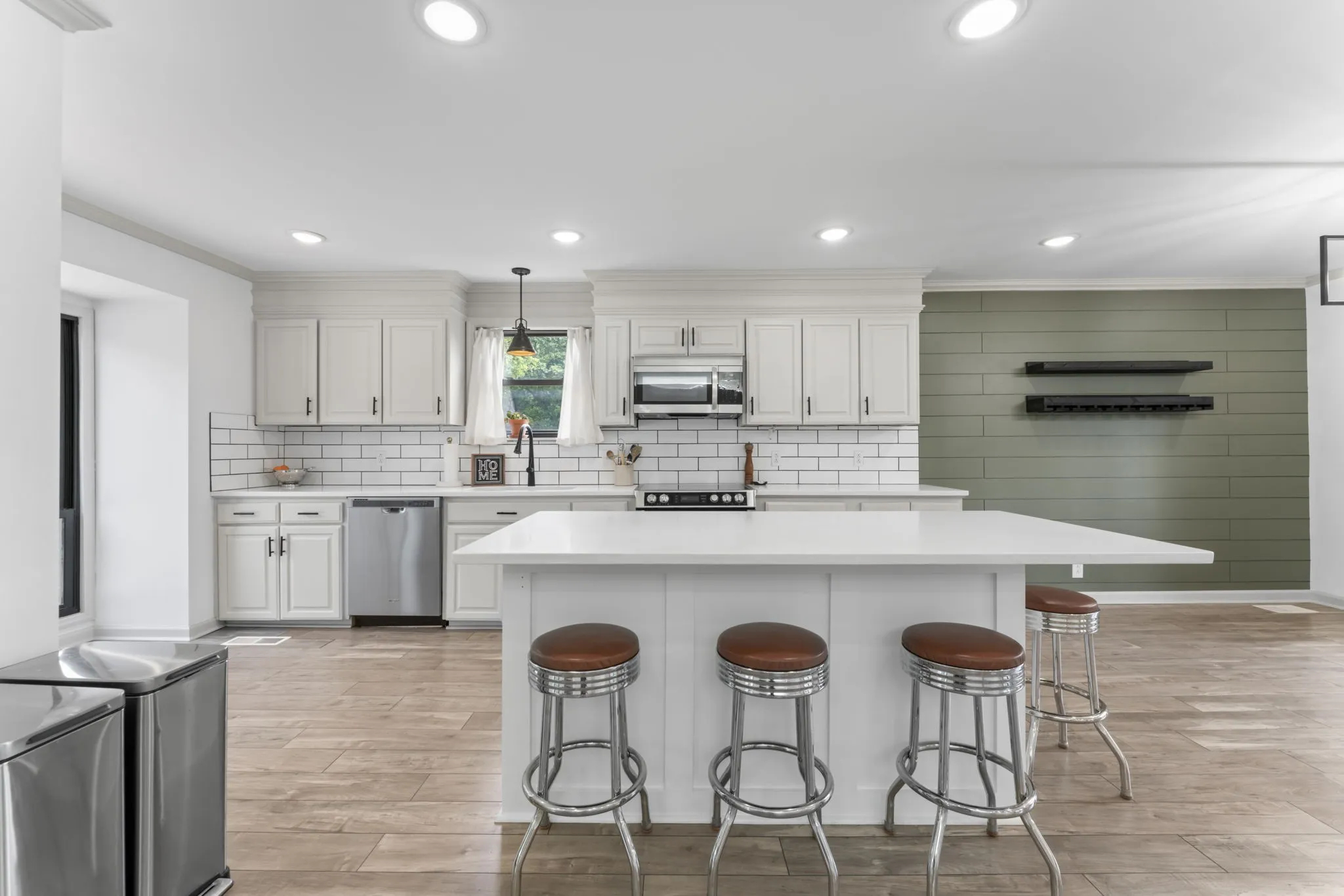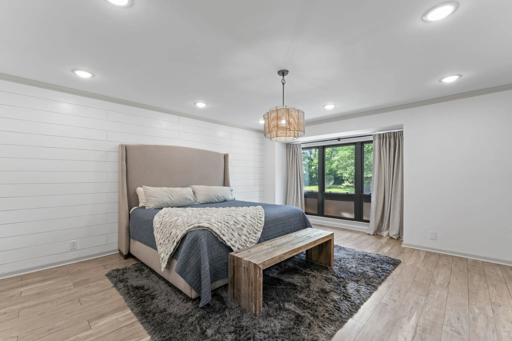 The main-level primary suite is a tranquil escape, boasting a shiplap feature wall, wall-to-wall windows overlooking the backyard, a luxurious en-suite with an oversized walk-in shower, and an expansive walk-in closet. Two additional bedrooms and a full bath are conveniently located on the main floor.