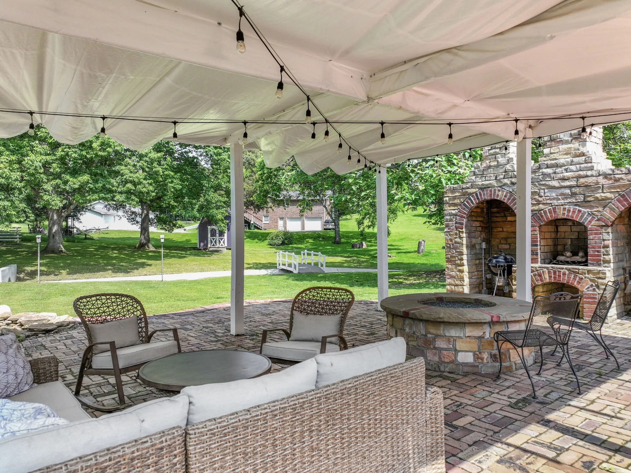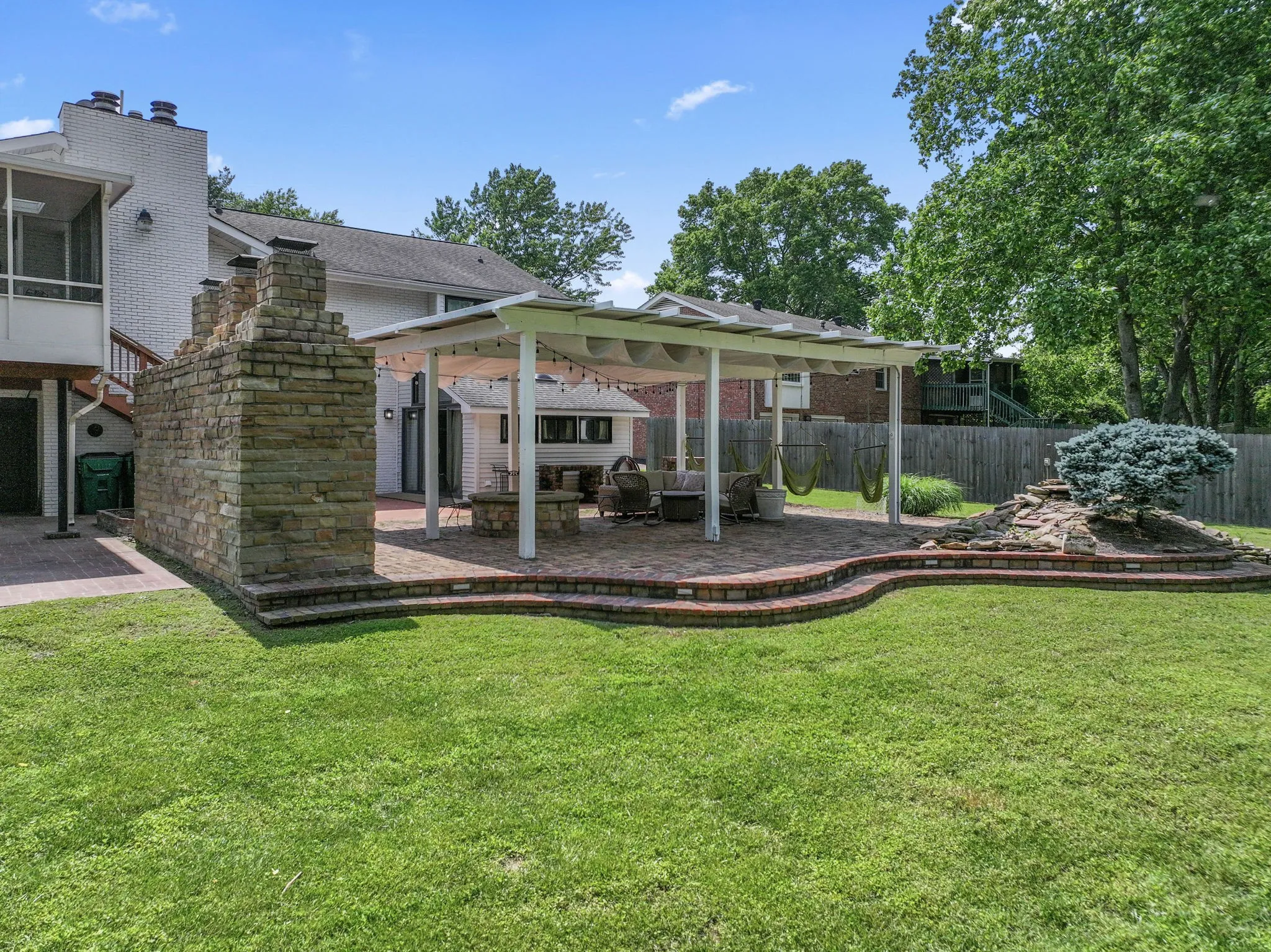 Just off the living area, relax on the screened-in deck or head down to the Solar Terrace—a covered back patio complete with a fire pit, outdoor fireplace, water feature, and a Blackstone griddle. Powered by solar panels, the terrace (and much of the home) offers sustainable, energy-efficient living.