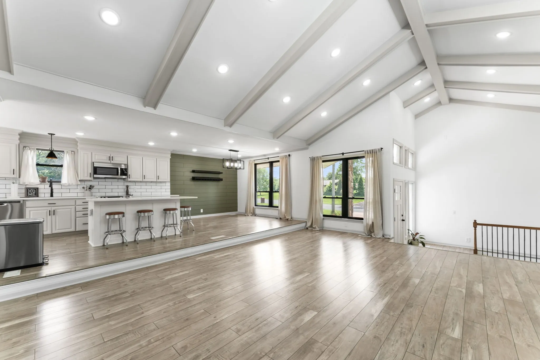 The open-concept living room welcomes you with soaring vaulted ceilings and a cozy gas fireplace. Natural light floods the space through large windows, while the adjoining dining room and open kitchen make entertaining a breeze. The kitchen is a true centerpiece, featuring a large island with seating and sleek finishes that cater to the home chef.