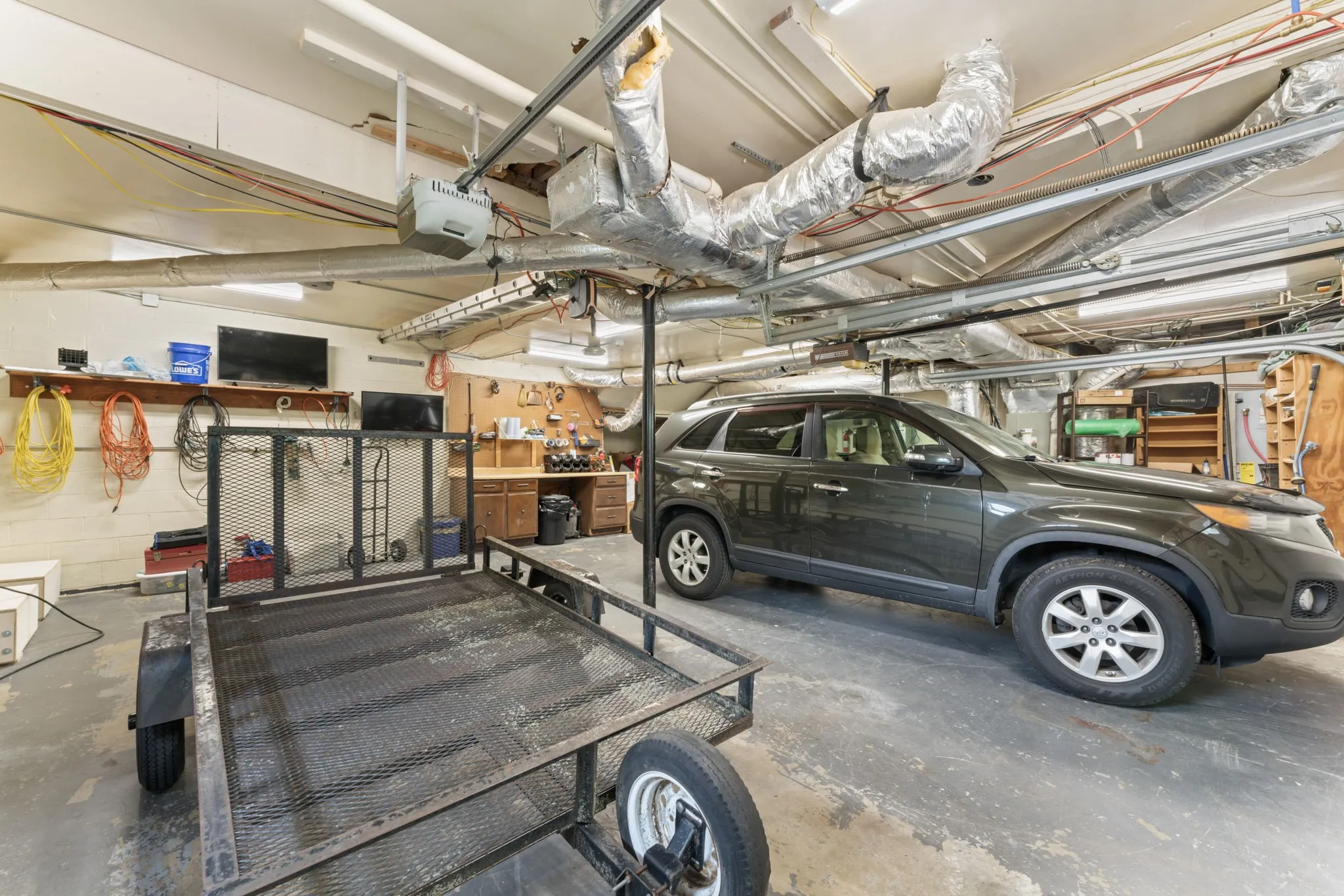 An oversized two-car garage with extra storage and a backyard shed offer ample space for tools and gear.