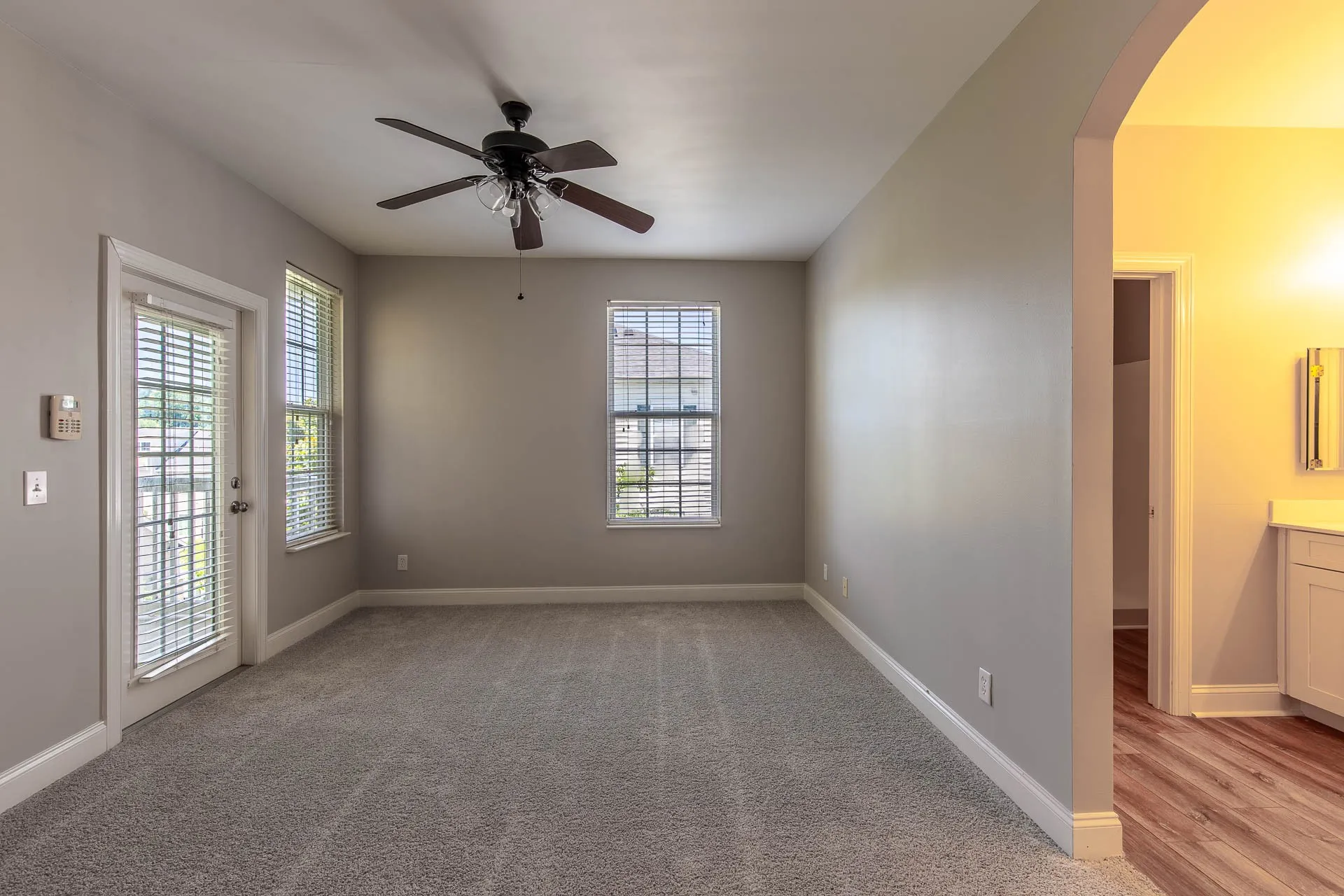 This thoughtfully designed layout offers an open-concept living area with hardwood floors and a cozy fireplace surrounded by built-in shelves and cabinets. The kitchen sits just off the living room and features rich wood cabinetry, white appliances, open pantry shelving, and a spacious double-door laundry room. A secondary bedroom is located just off the hallway and includes plush carpet, large windows, and a generous closet. Between the secondary and primary bedrooms is a full-size bathroom with a tub/shower combo. The primary suite offers carpeted floors, access to a private outdoor patio, ample natural light, and an en-suite bathroom with double vanities, tile flooring, a walk-in shower, and a spacious walk-in closet. Enjoy exclusive amenities in this gated community, including a clubhouse and pool.