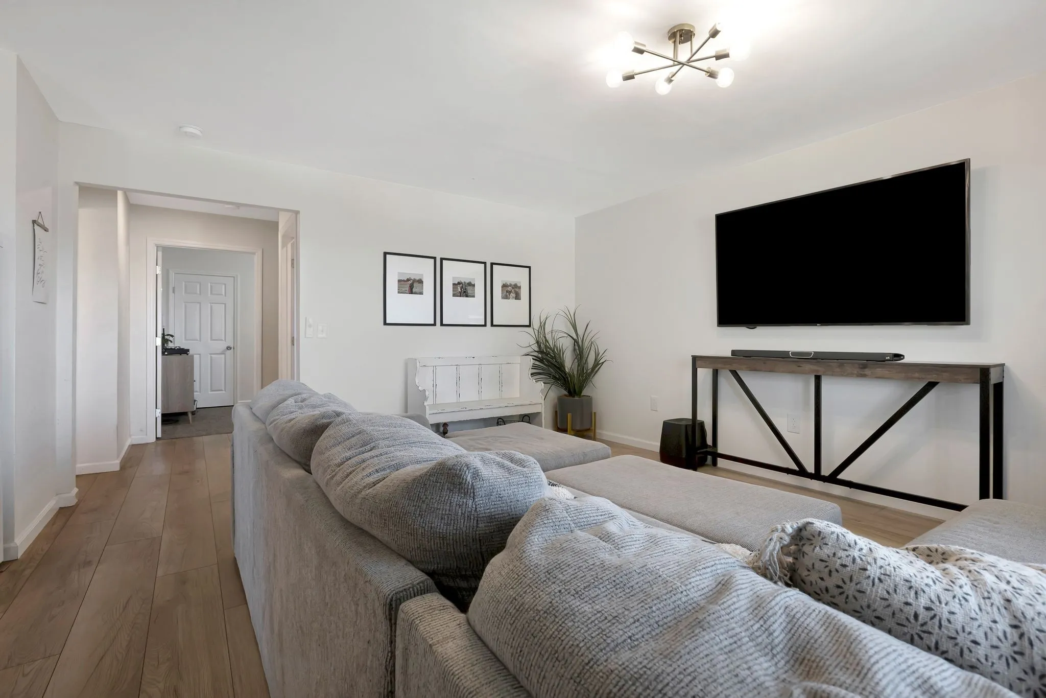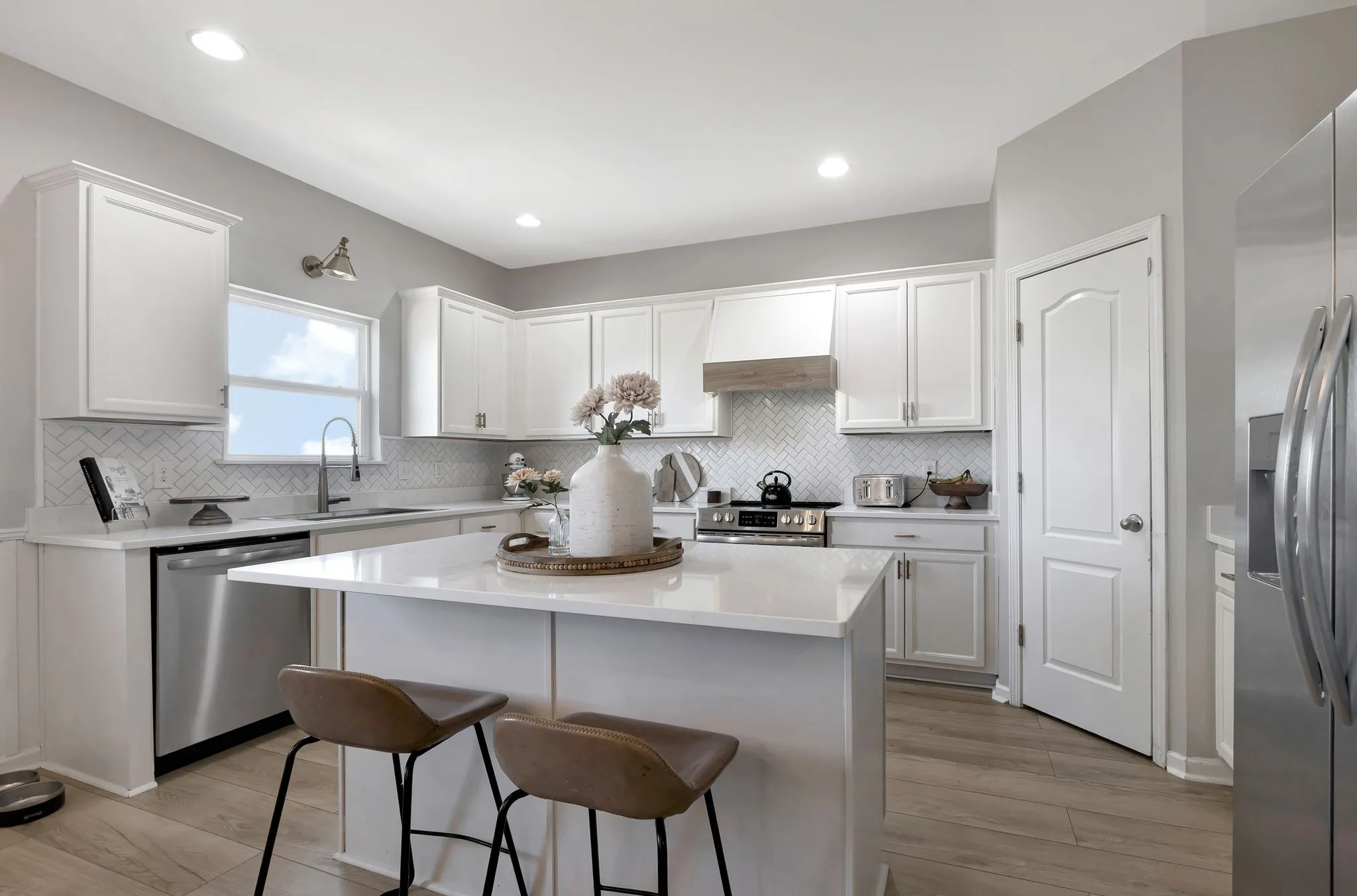 Step inside to discover a bright and modern main floor featuring a fully updated white kitchen with newer appliances and stunning wide plank LVP flooring throughout. The spacious living room boasts custom-built ins, creating a cozy and functional centerpiece for entertaining or relaxing.