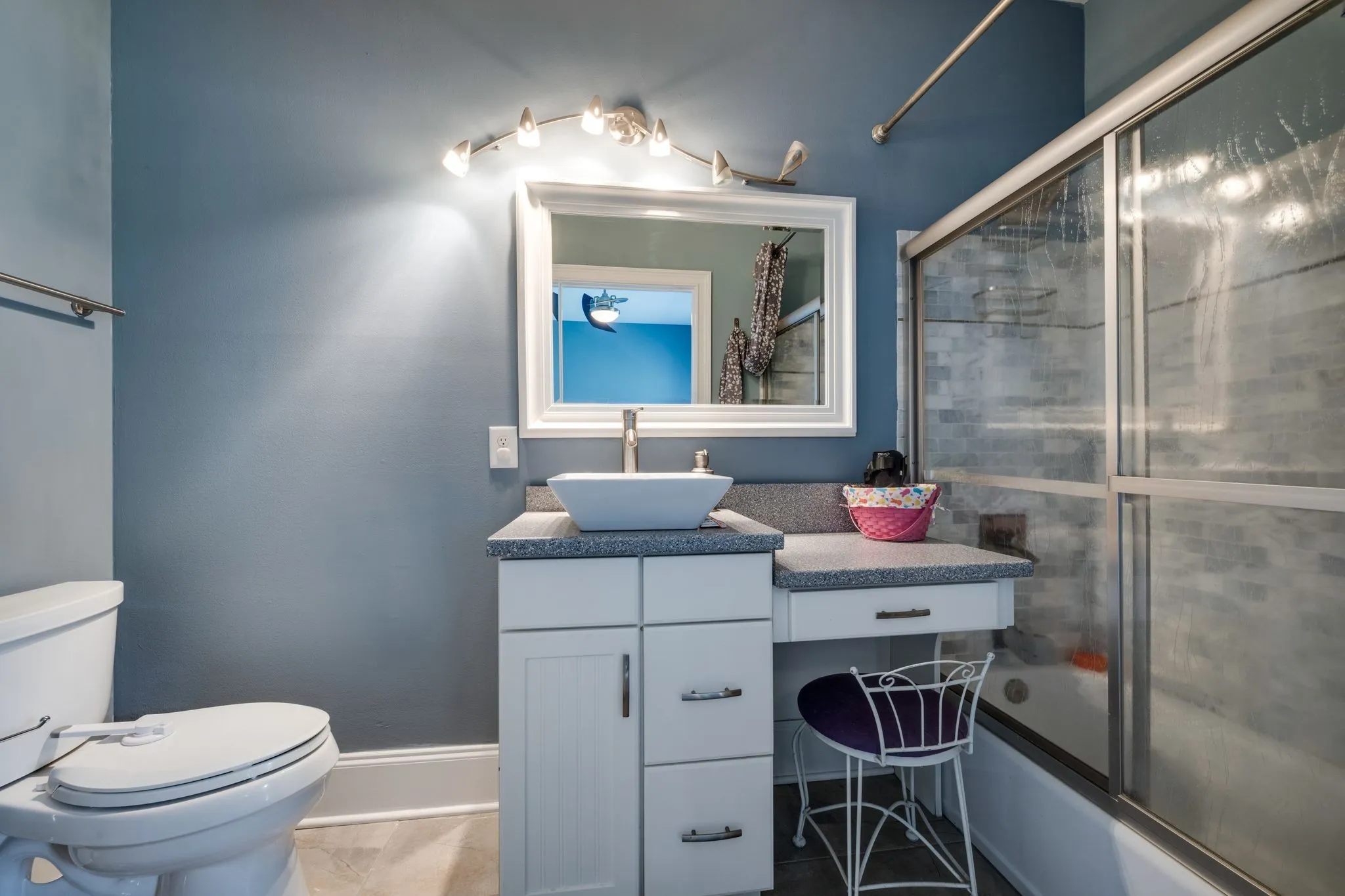 "LongDescription" => "Barndominium bath with speciality double sinks and lots of mirriors and lights! Cereamic tile floors."