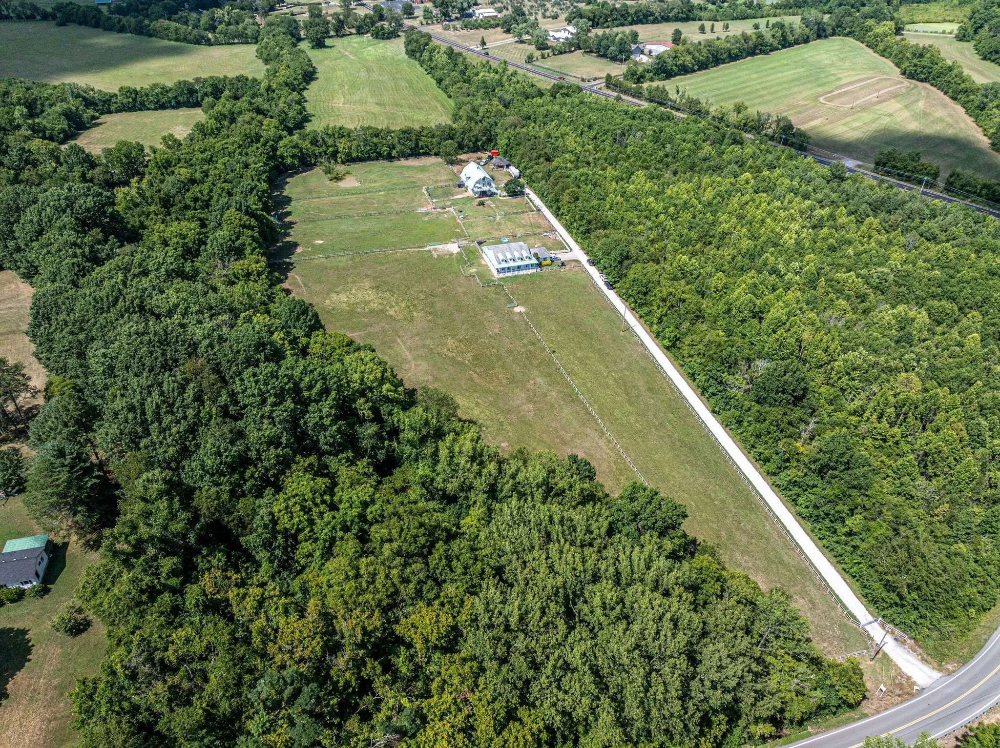 "LongDescription" => "Looking down into the 8 stall barn. Wash area, lower left of picture, then tack/feed storage area."