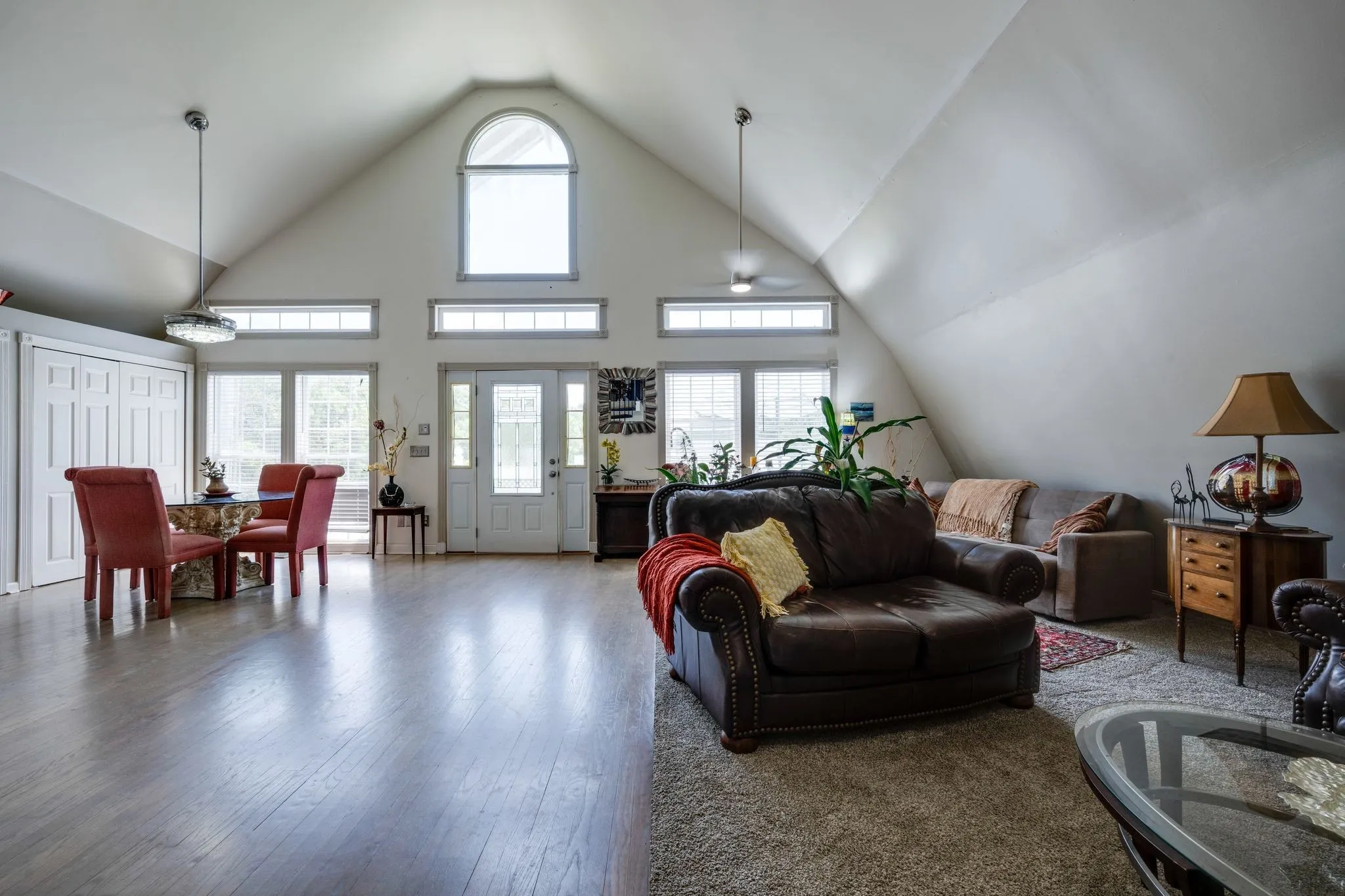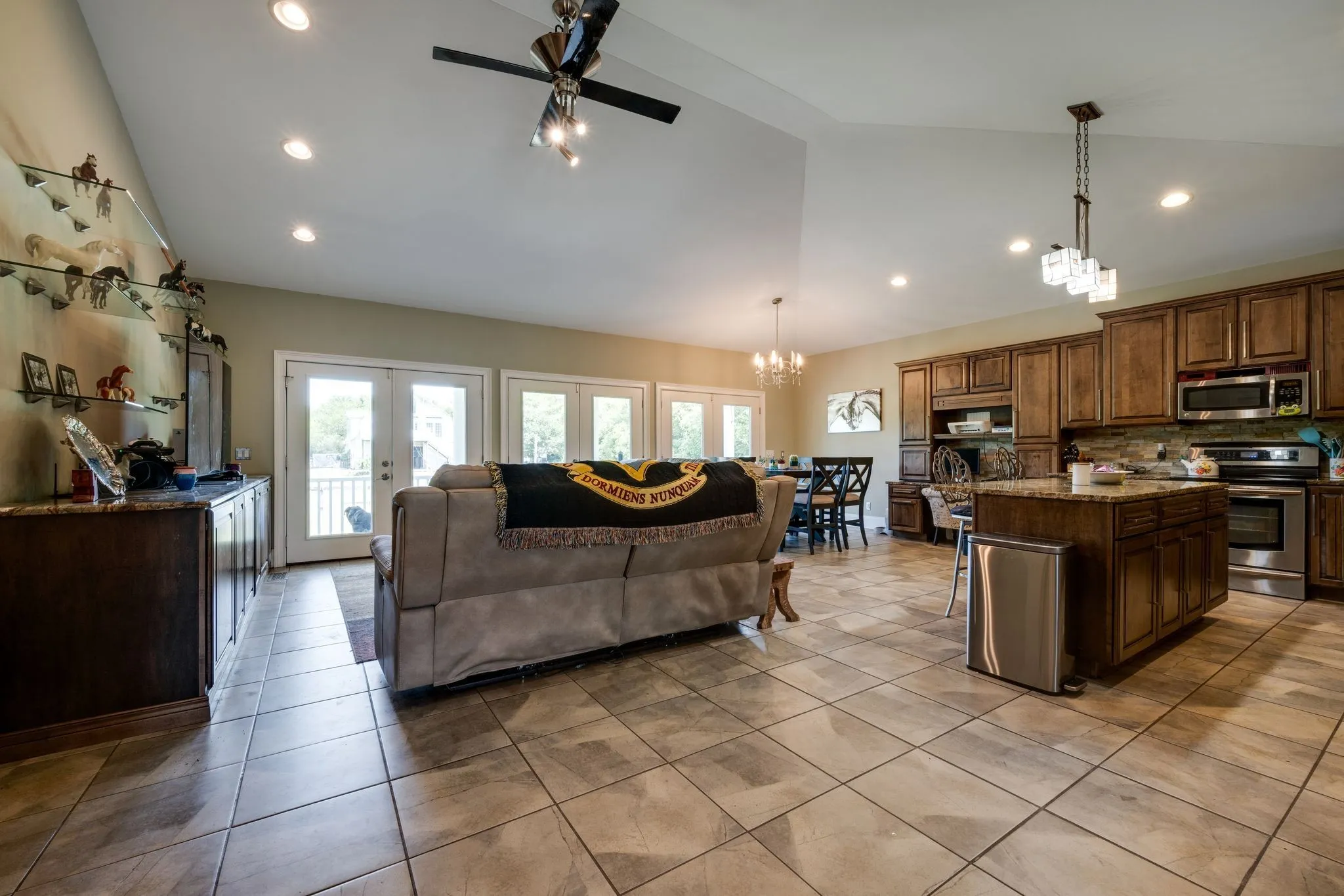 "LongDescription" => "Barndominium bedroom with lots of light shinning in and a lighted ceiling fan."