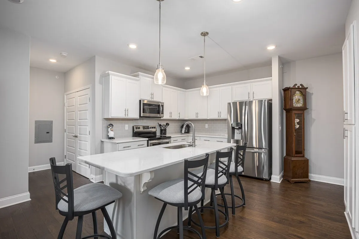 Welcome to your new home where comfort meets style in a secured building packed with charm. This 2-bedroom, 2-bath condo is all about easy urban living. As you enter, you’ll be impressed by the spacious kitchen, complete with a large island, stainless steel appliances, quartz countertops, subway backsplash and a pantry equipped with convenient pull-out shelves. Refrigerator will remain. The kitchen flows seamlessly into a bright and inviting living room, which opens to a private balcony—perfect for sipping your morning coffee or enjoying evening sunsets. Hardwood floors throughtout main living area. The master suite offers a peaceful retreat with generous closet space and an en-suite bathroom. Grab-bars have been added to the shower and toilet area. A second bedroom provides flexibility, ideal for guests or as a home office. Parking is a breeze with your own private 1-car garage and an assigned parking space—no more endless searching for a spot! Beyond your condo, the community offers a host of amenities that cater to your active lifestyle. Take a dip in the refreshing pool, host a barbecue in the grilling area, enjoy gatherings under the covered pavilion, or explore the scenic walking trails that weave through the property. Conveniently located to shops and restaurants and minutes to Historic Downtown Franklin.
